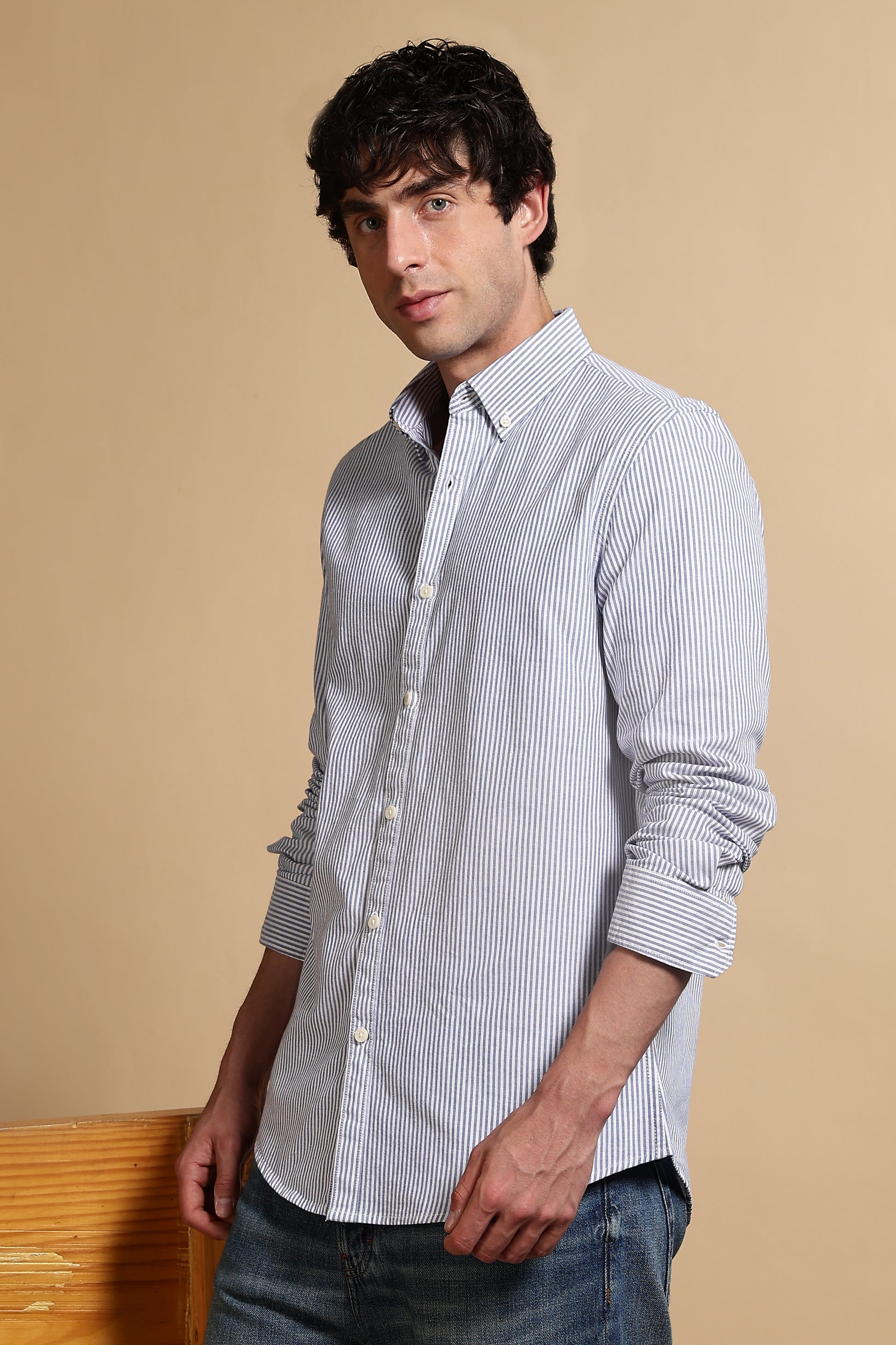 100% Cotton Oxford Slim Fit Striped Shirt Blue