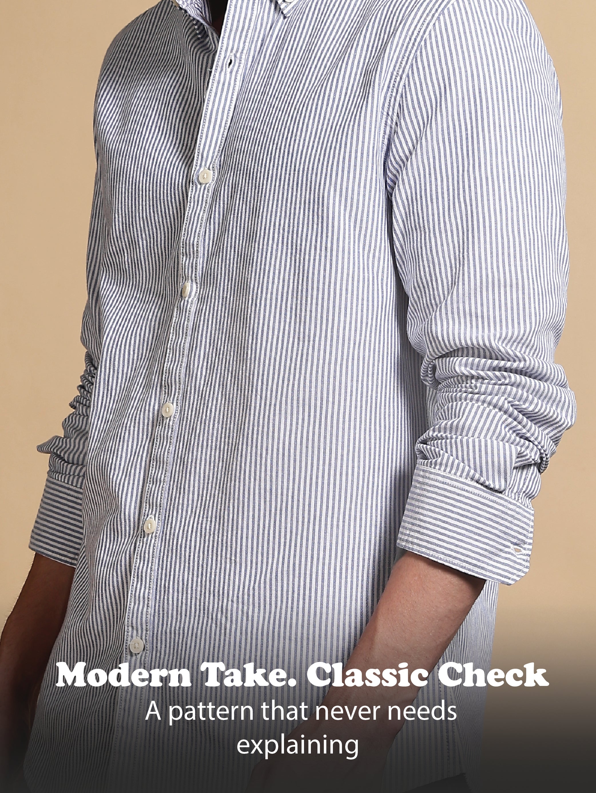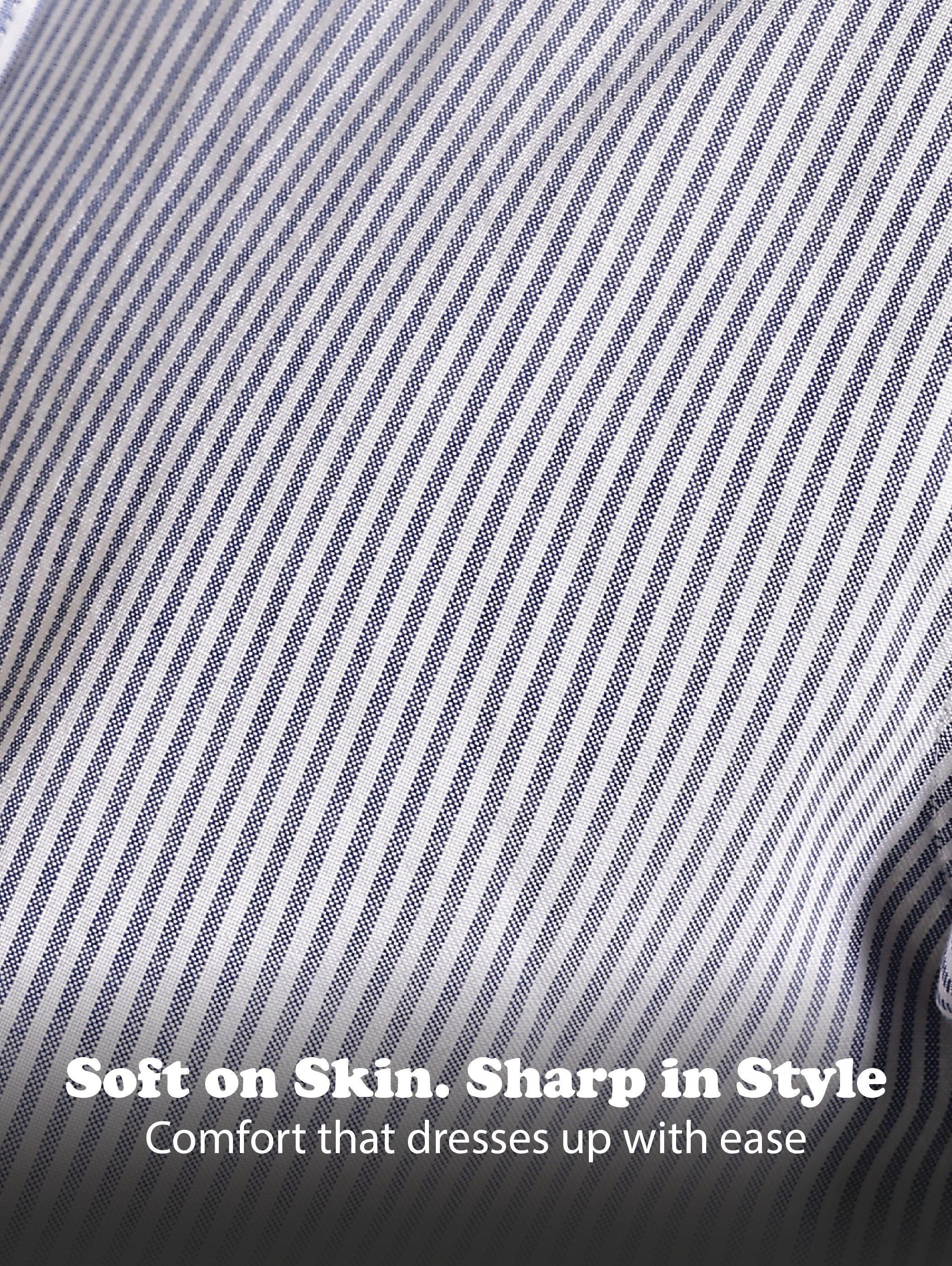 Elevate your everyday style with this slim-fit shirt, crafted from premium 100% cotton oxford fabric. The subtle vertical stripes add a refined touch, giving you the perfect balance of casual ease and polished appeal. Designed without pockets for a clean silhouette, it features full sleeves and a classic collar for versatile styling.