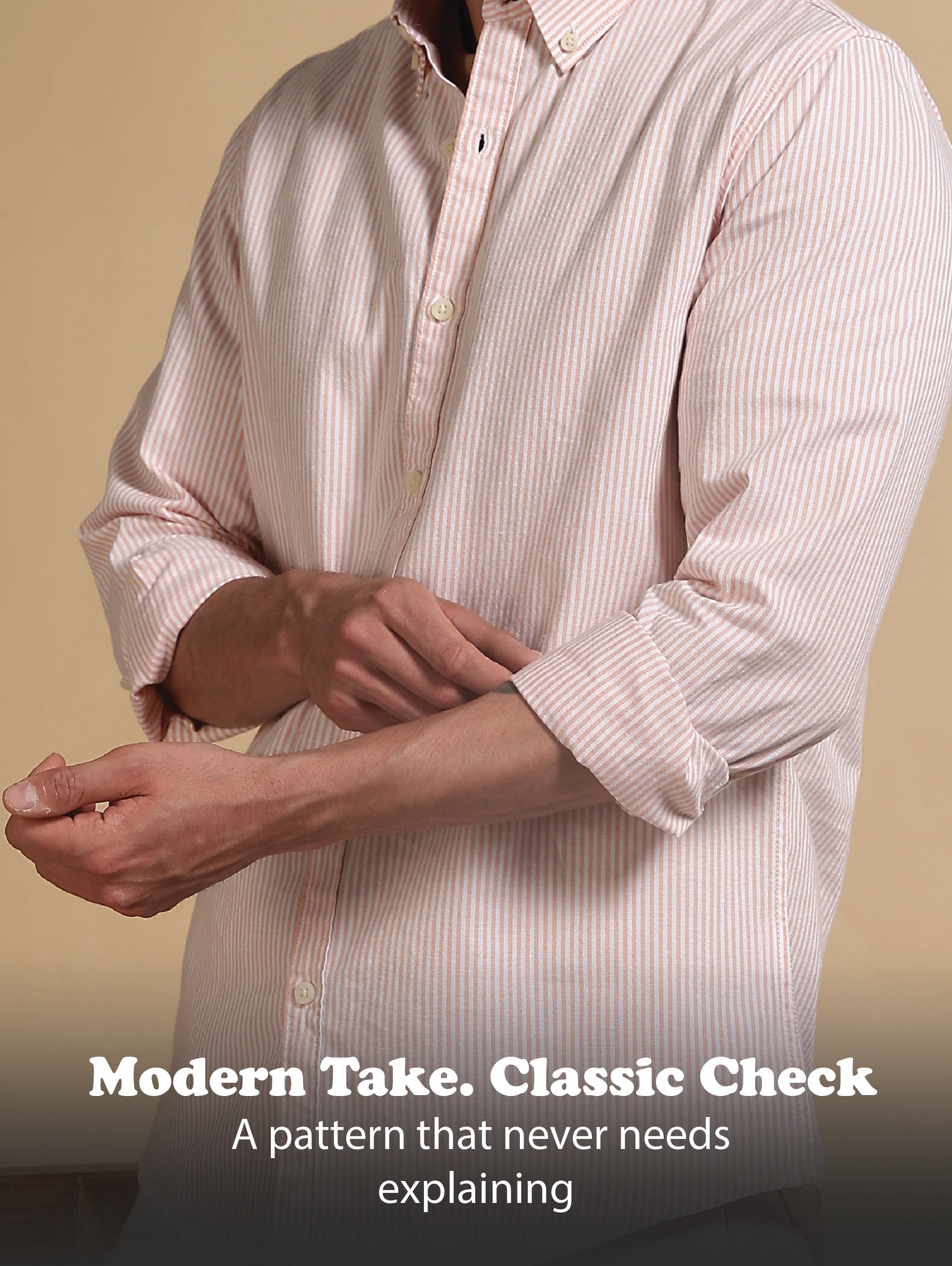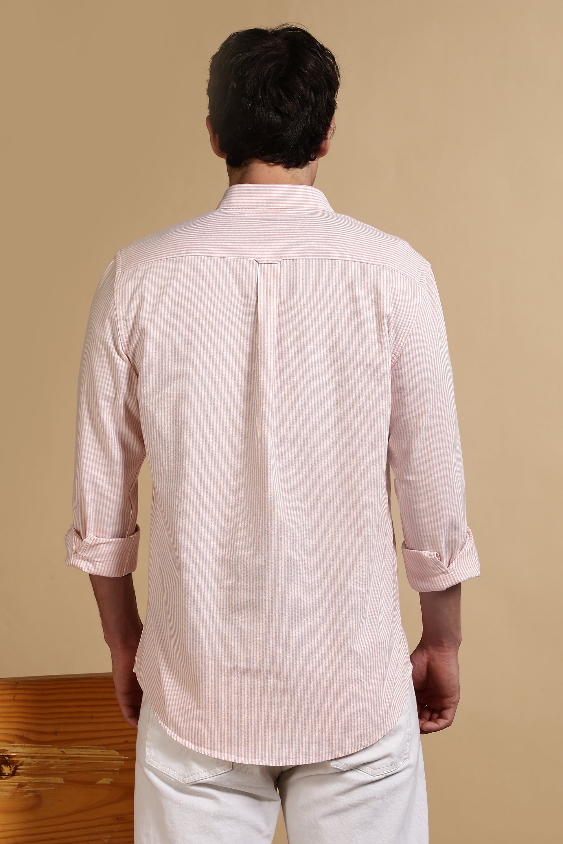Elevate your everyday style with this slim-fit shirt, crafted from premium 100% cotton oxford fabric. The subtle vertical stripes add a refined touch, giving you the perfect balance of casual ease and polished appeal. Designed without pockets for a clean silhouette, it features full sleeves and a classic collar for versatile styling.