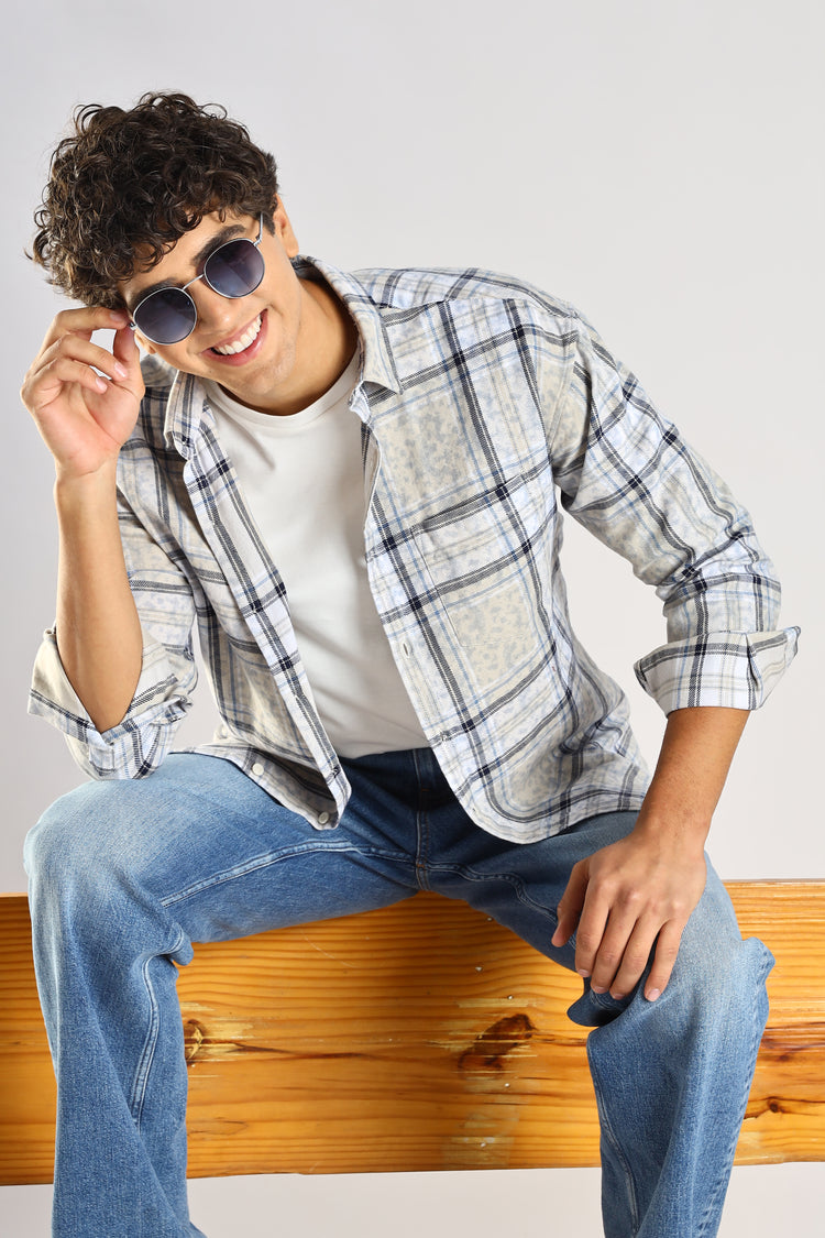 Add a touch of rugged charm to your casual wardrobe with this beige and blue checked shirt, crafted from 100% cotton for a breathable, soft feel. The slim-fit cut offers a sharp silhouette, while the classic check pattern brings timeless appeal.