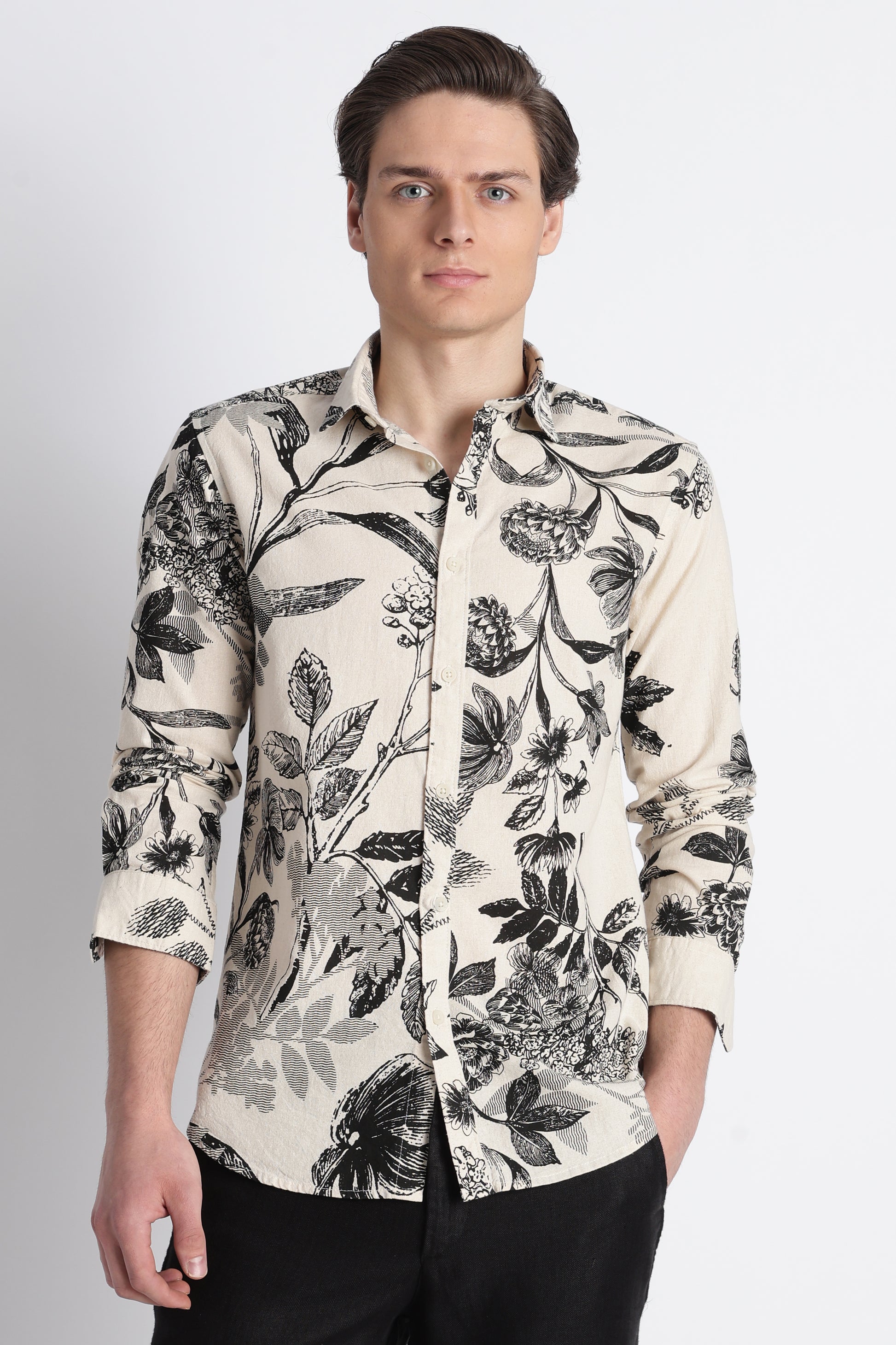 The slim fit keeps the look structured and refined, while the all-over block print adds character without overpowering your style. Designed with full sleeves and a clean, pocket-free front, this shirt stays minimal and versatile. The classic spread collar completes the look, making it easy to dress up or down depending on the occasion.