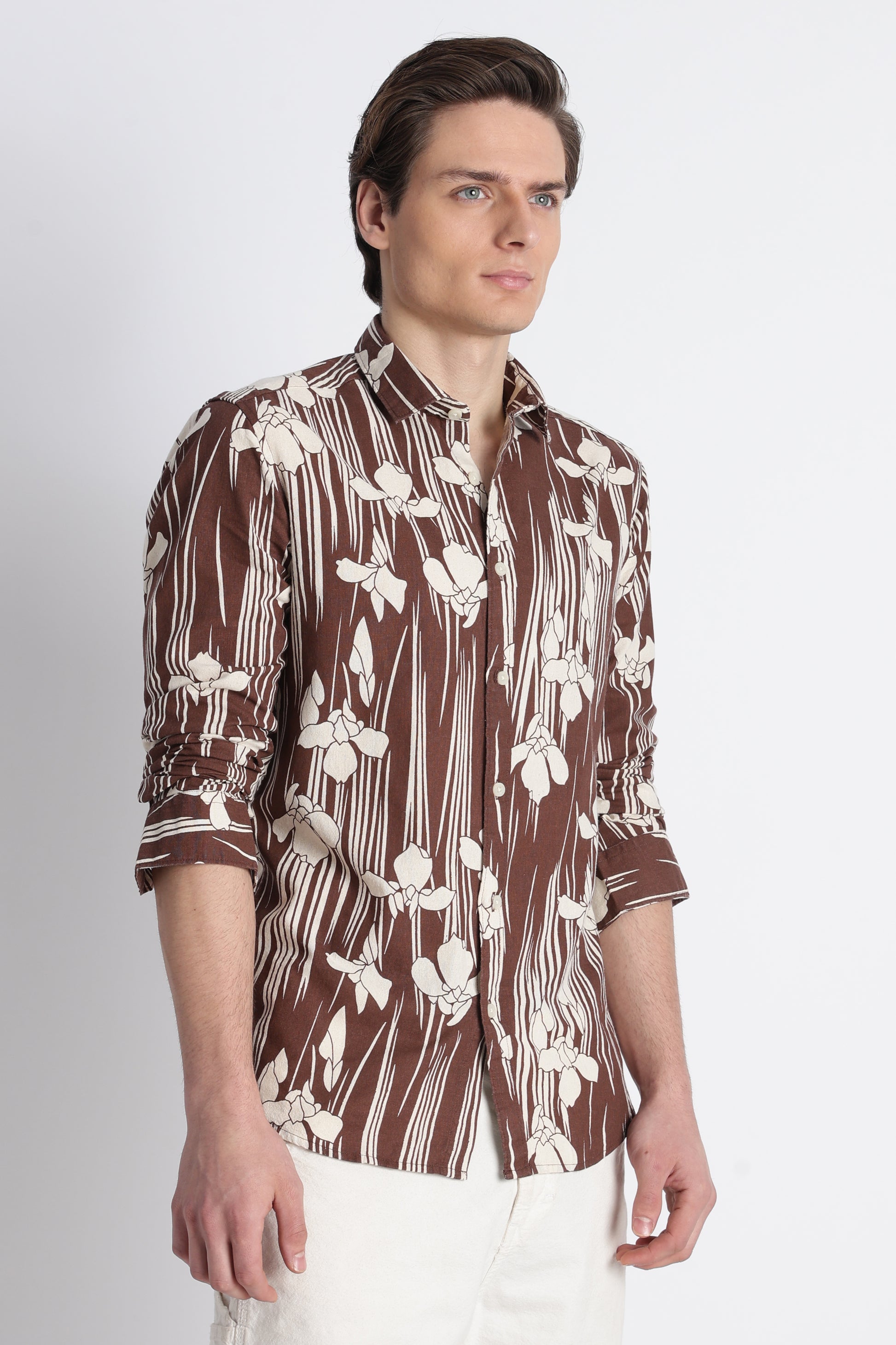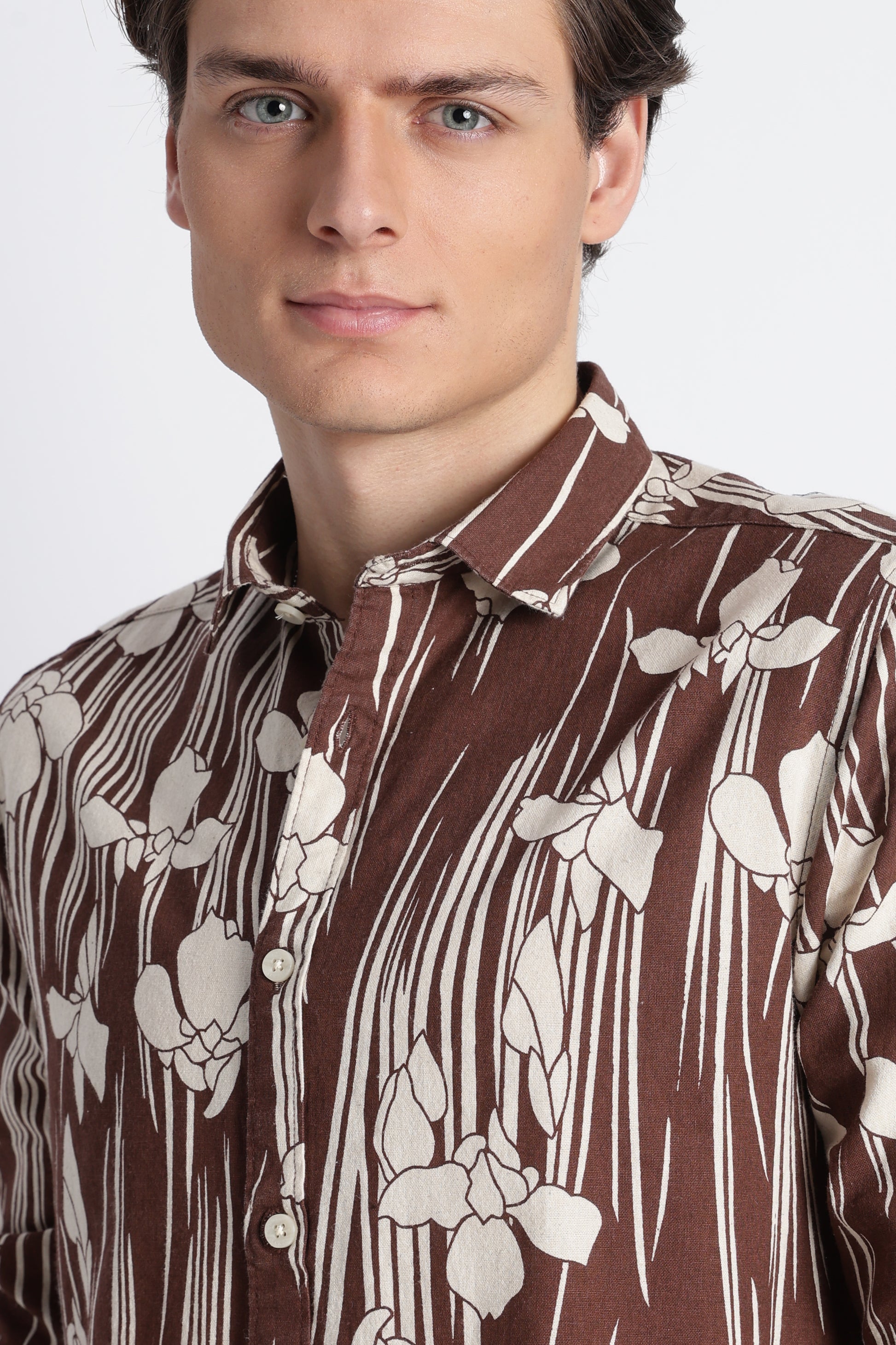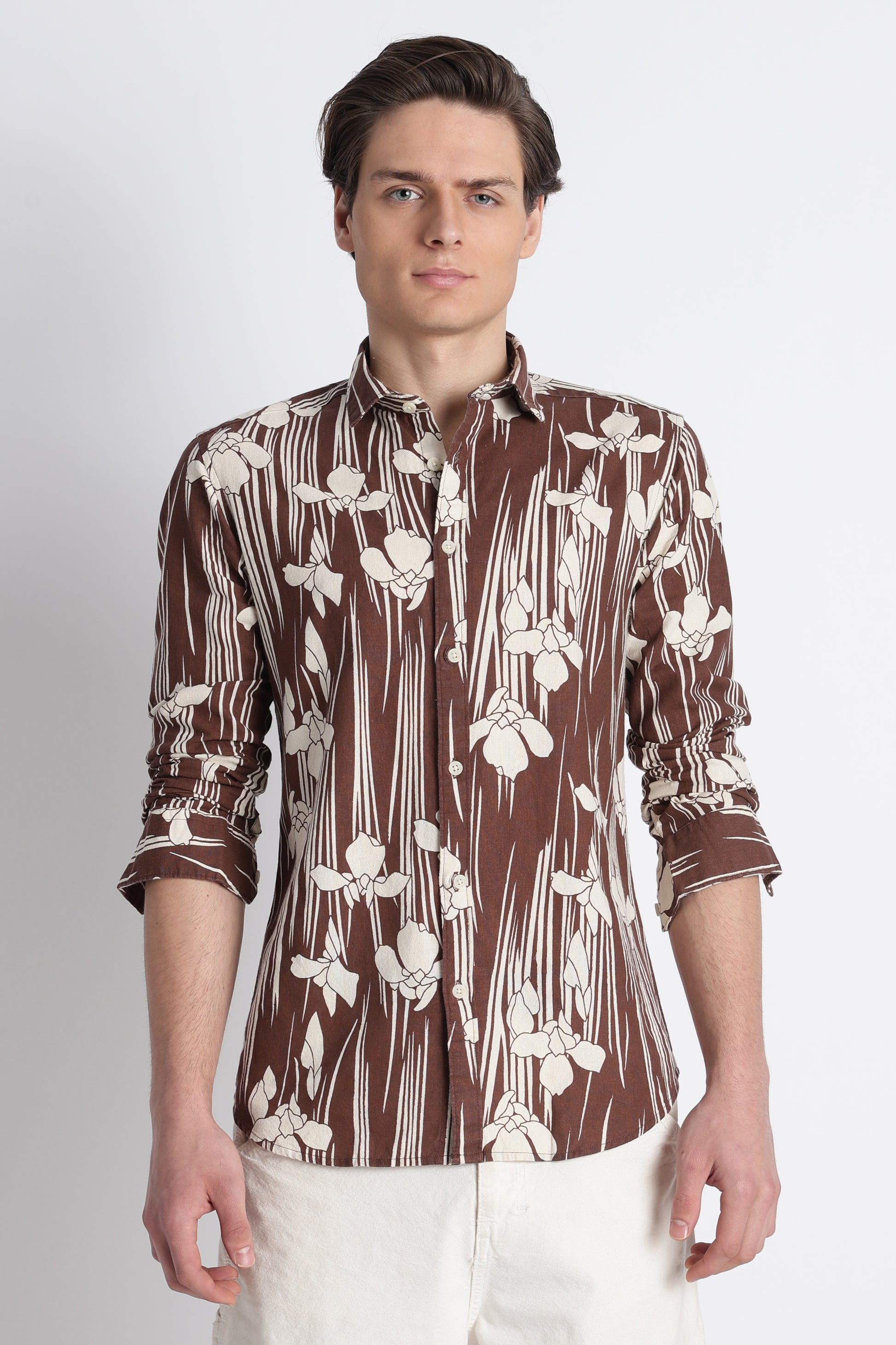 The slim fit keeps the look structured and refined, while the all-over block print adds character without overpowering your style. Designed with full sleeves and a clean, pocket-free front, this shirt stays minimal and versatile. The classic spread collar completes the look, making it easy to dress up or down depending on the occasion.