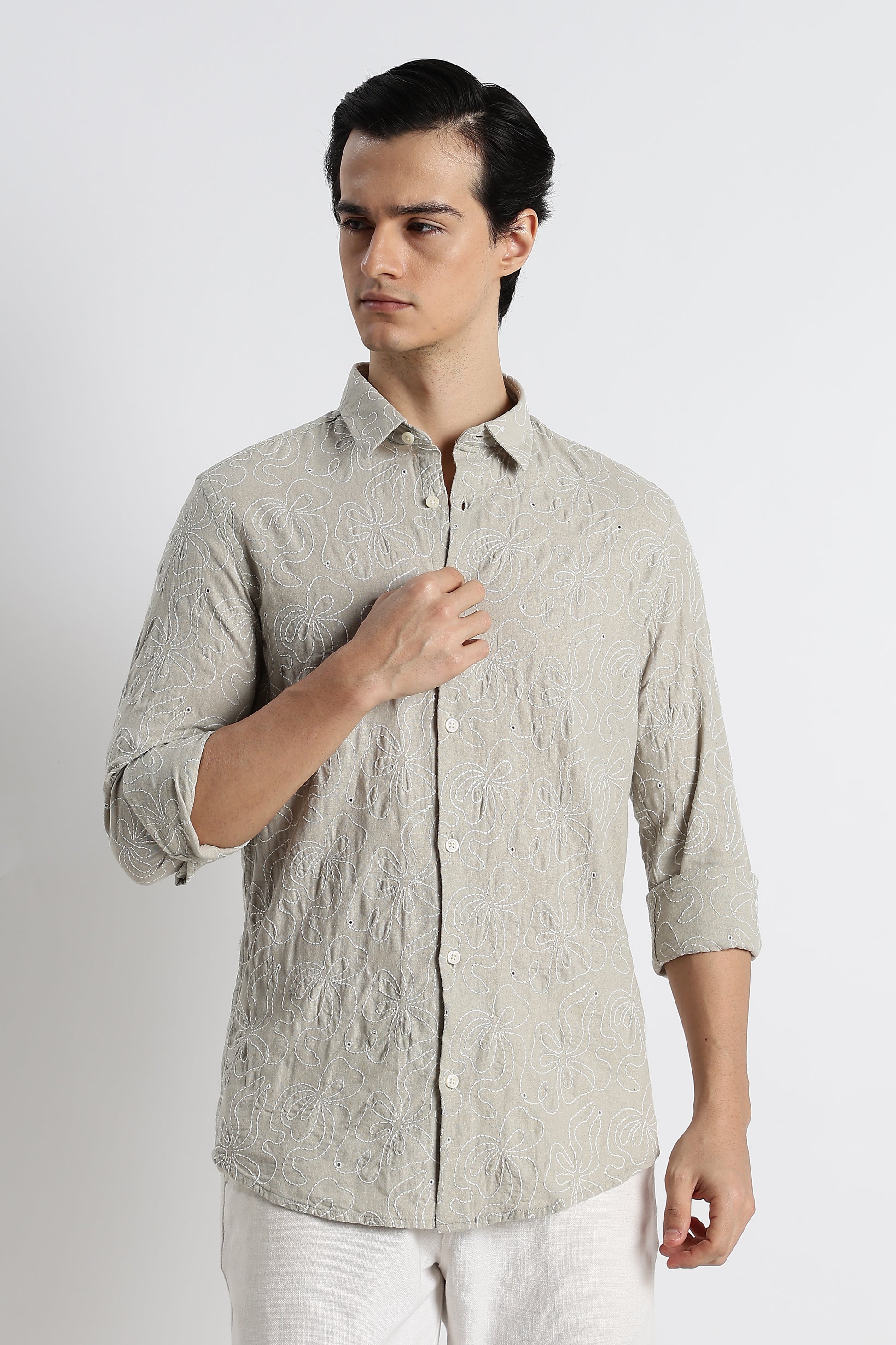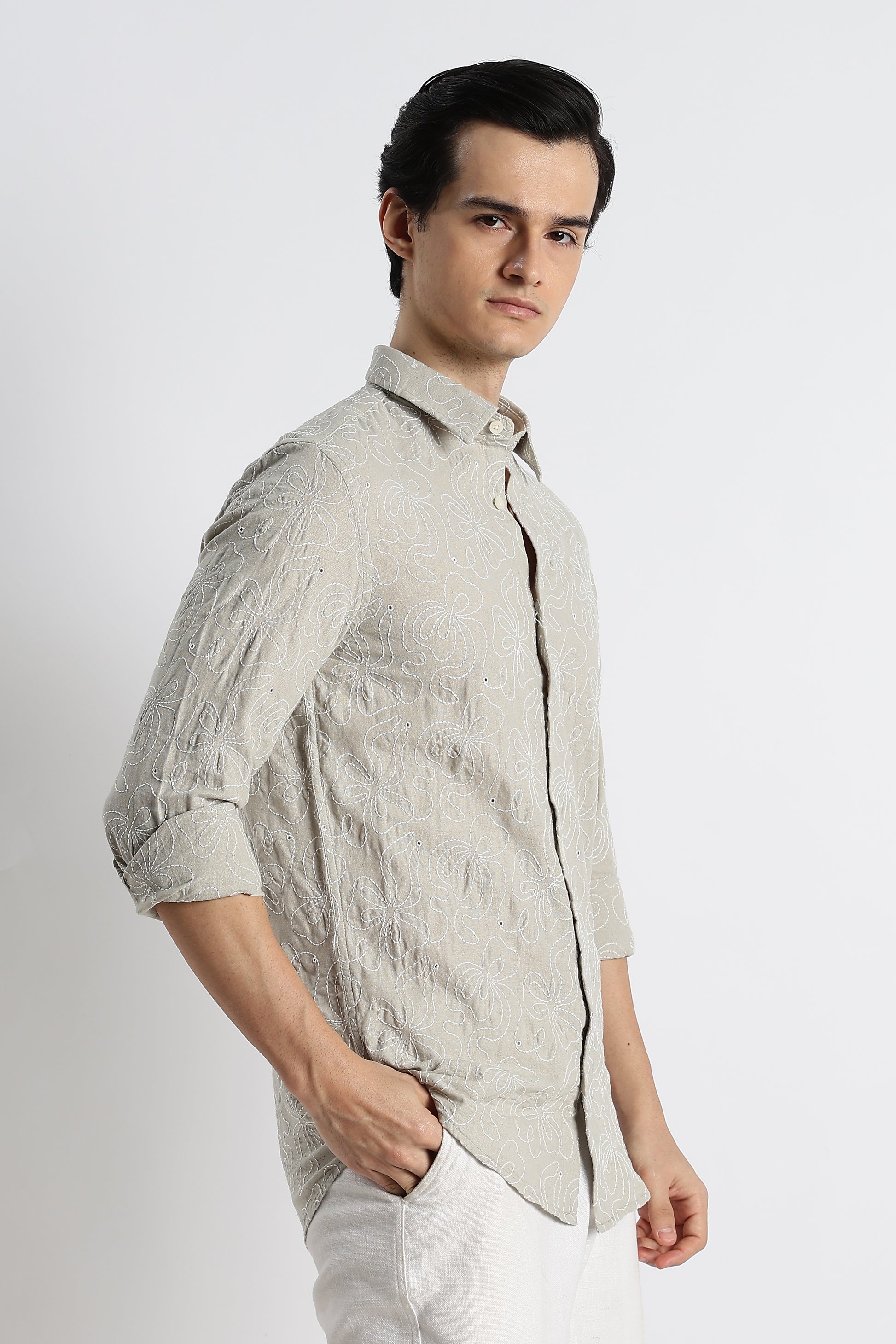 Crafted for those who appreciate detail without the noise, this beige embroidered shirt blends artisanal texture with everyday comfort.