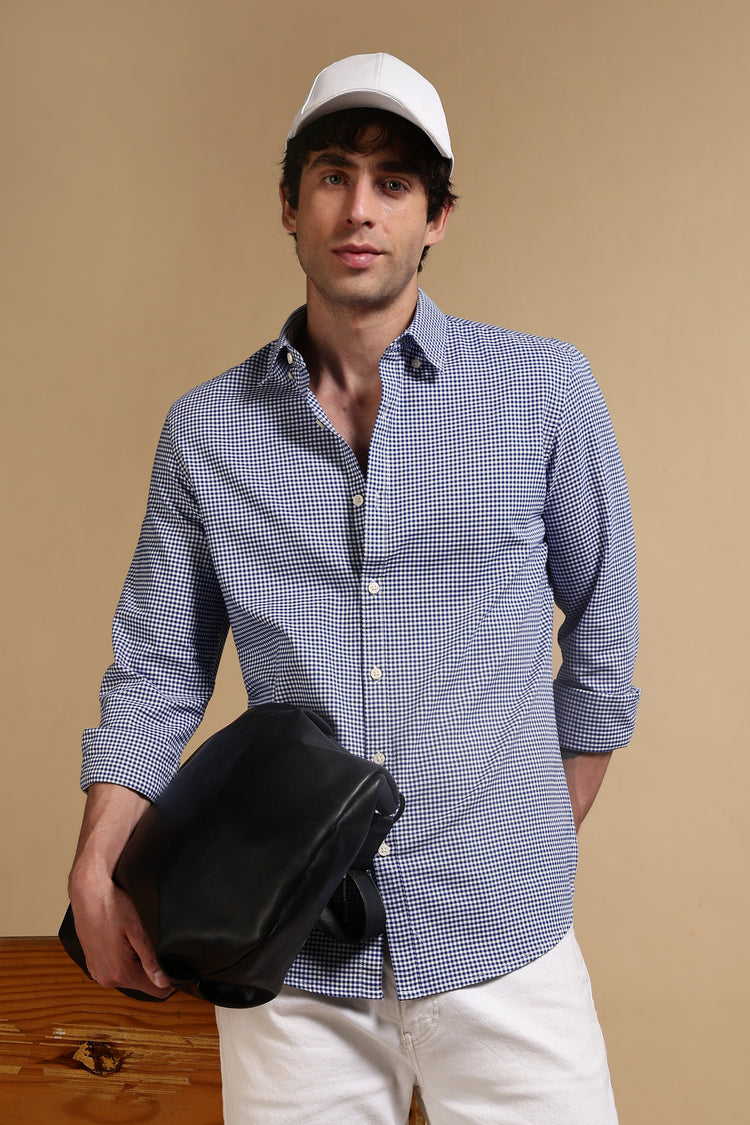 Cotton Oxford Slim Fit Mini Checks Shirt Navy