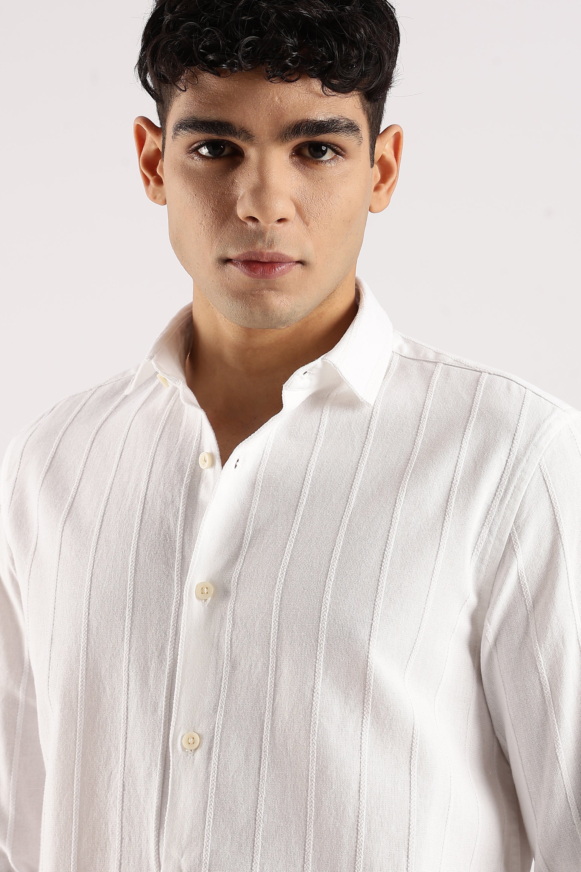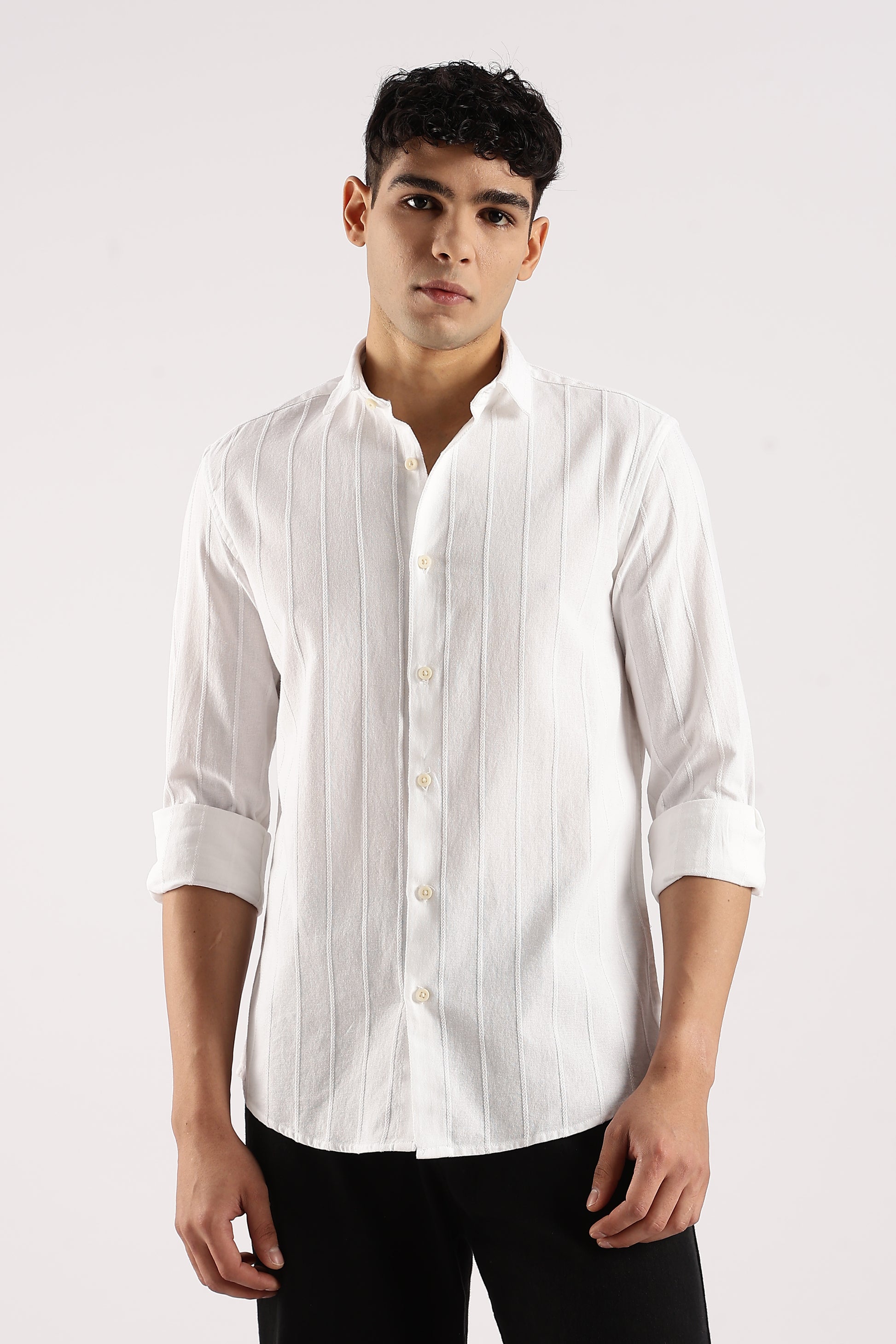 Crafted for comfort and clean style, this off-white slim-fit shirt is a wardrobe staple for the modern man. Made from 100% cotton, it features a subtle self-striped texture that adds quiet sophistication without overpowering your look.