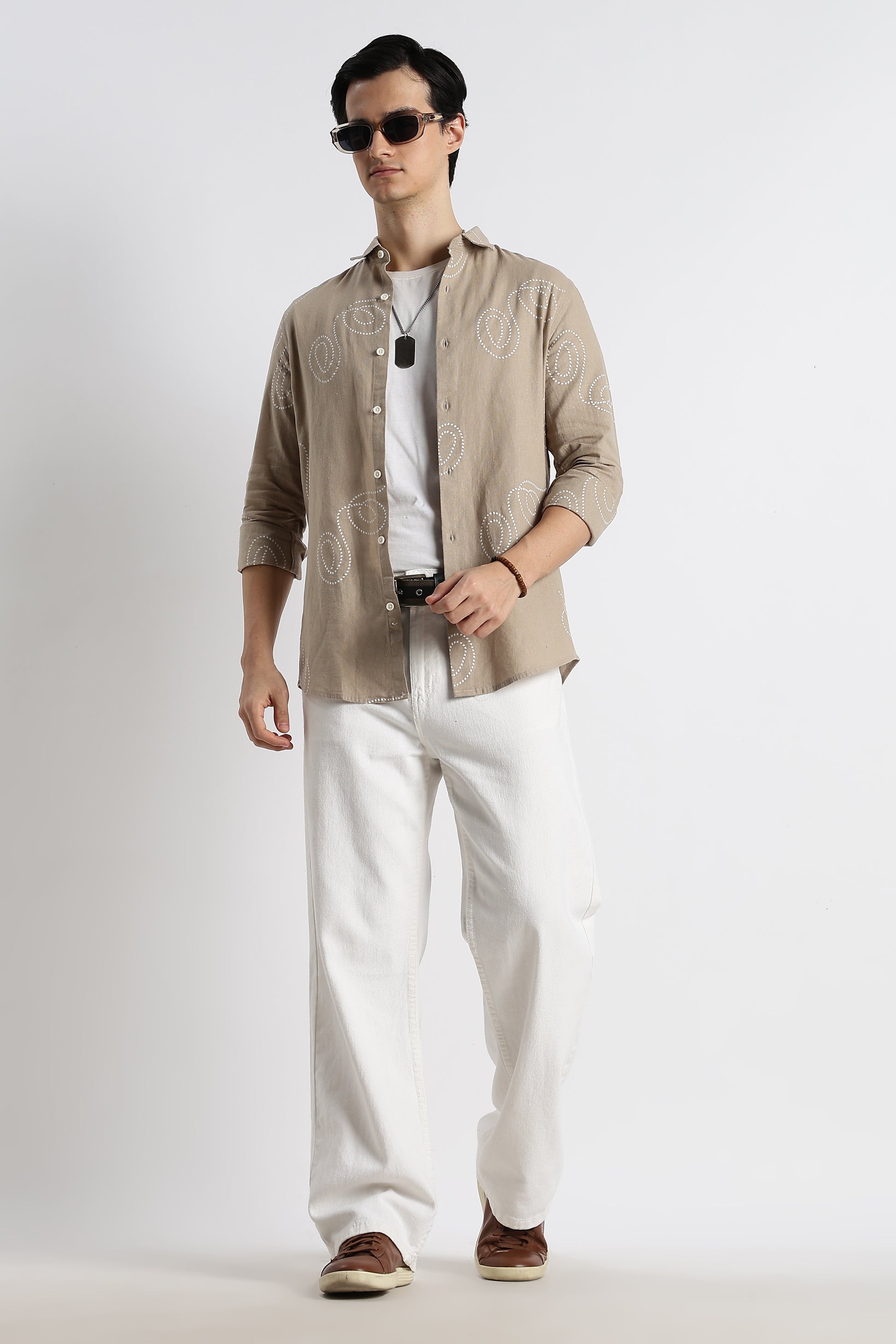 Effortless, airy, and quietly expressive — this Beige swirl-print shirt is crafted for the man who appreciates subtle detail over loud design. Made from a breathable cotton-linen blend, it offers a naturally textured hand-feel that stays light and comfortable all day long.