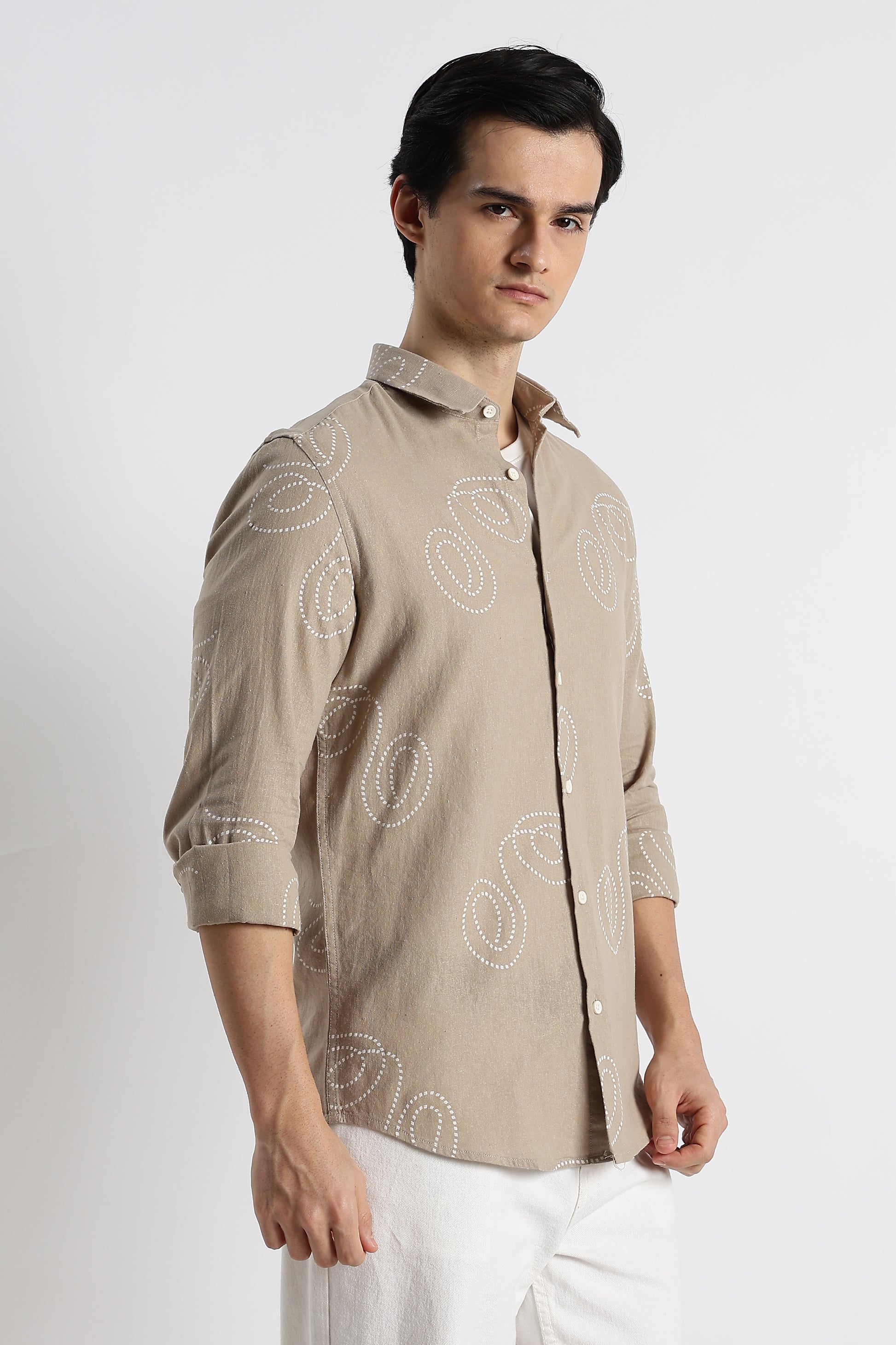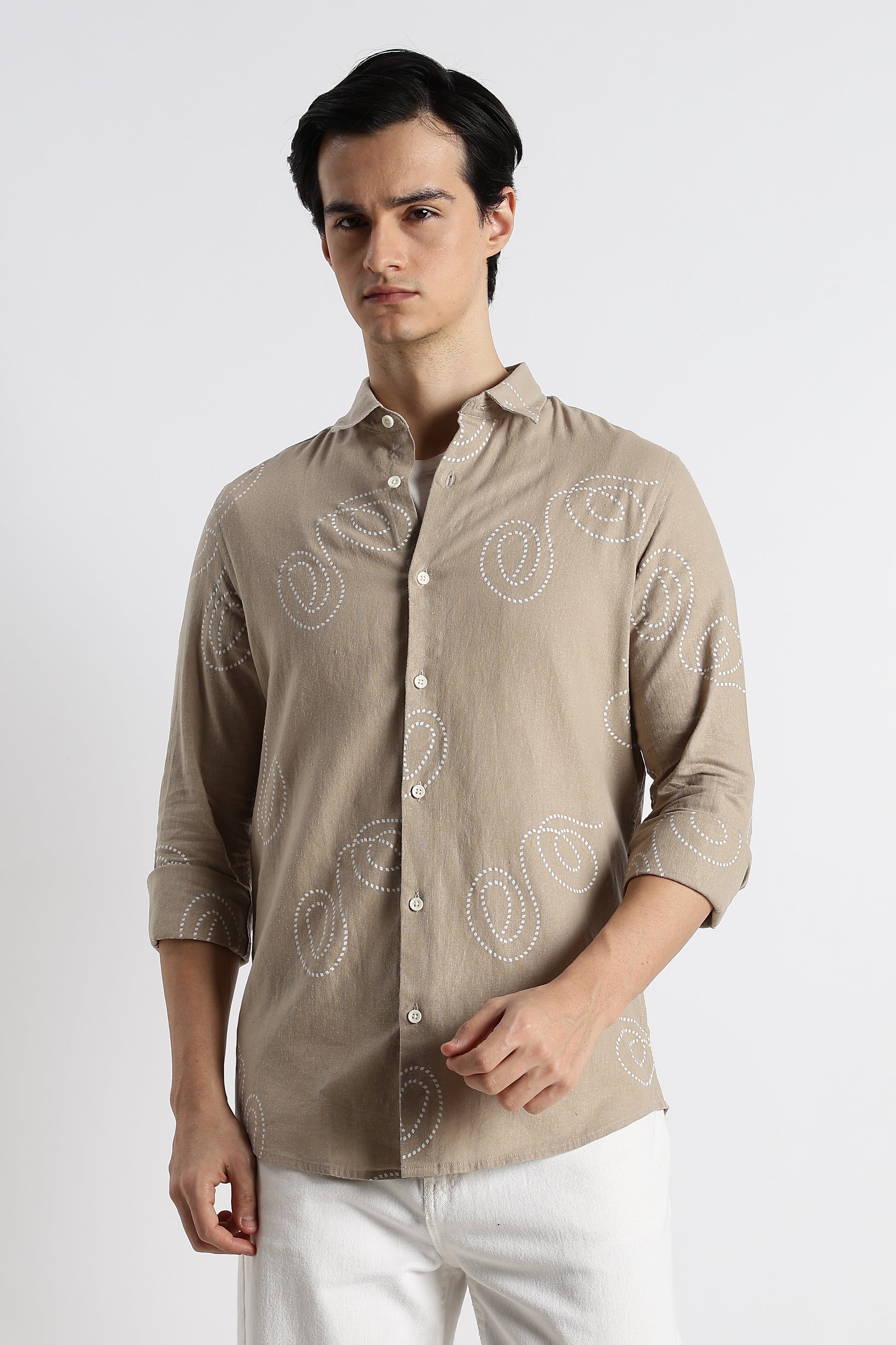 Dotted Swirl Printed Cotton Linen Shirt Beige