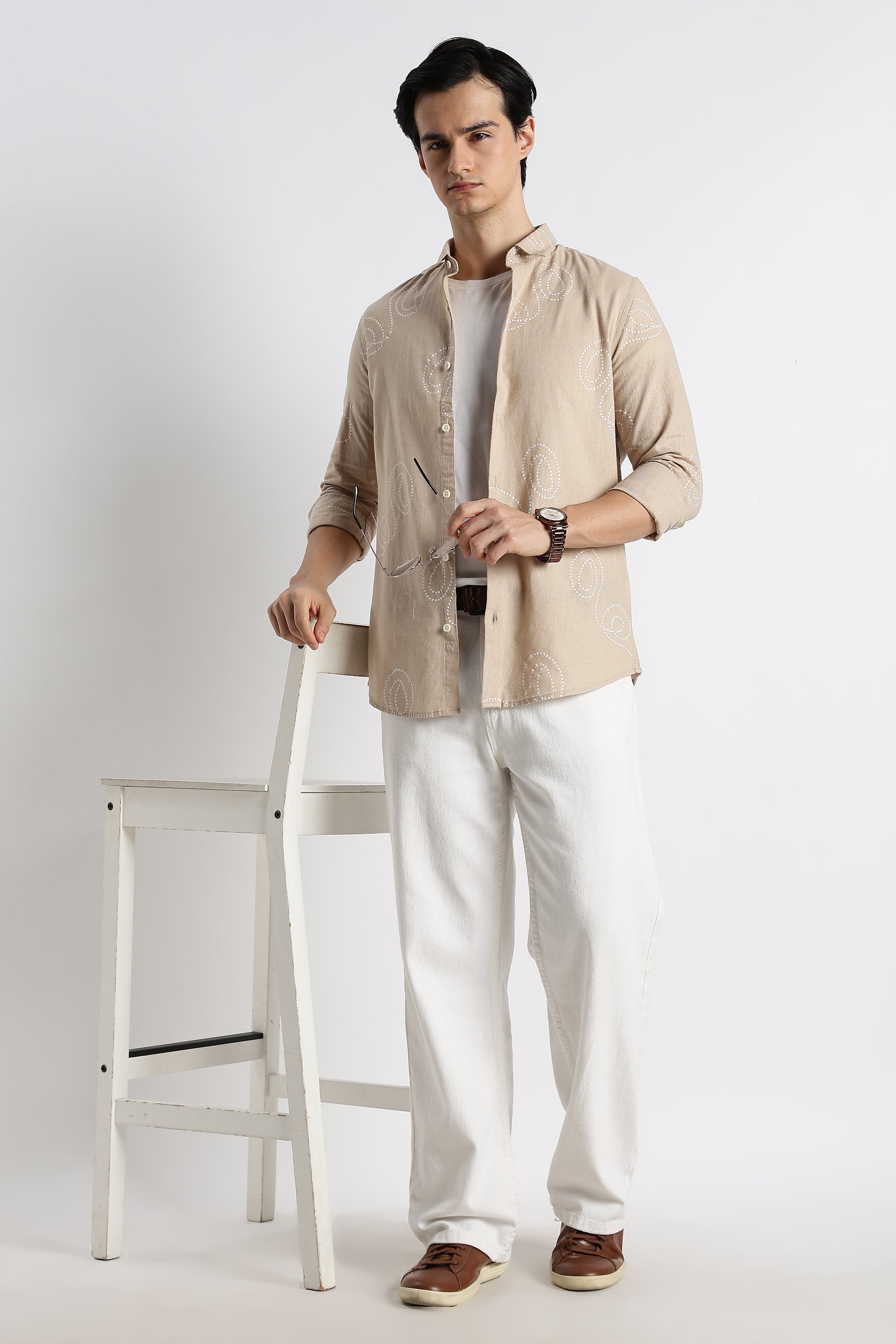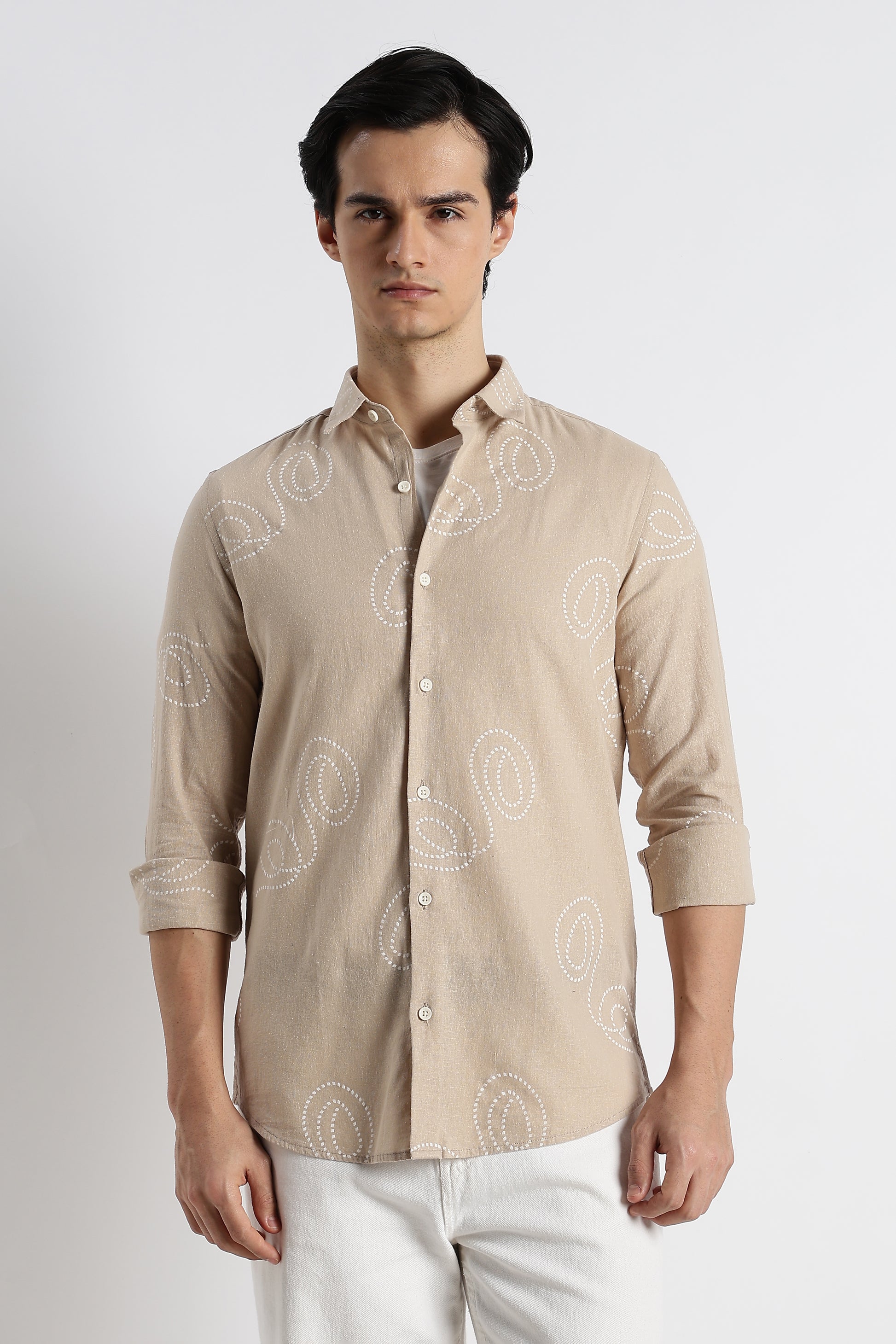 Effortless, airy, and quietly expressive — this Cream swirl-print shirt is crafted for the man who appreciates subtle detail over loud design. Made from a breathable cotton-linen blend, it offers a naturally textured hand-feel that stays light and comfortable all day long.