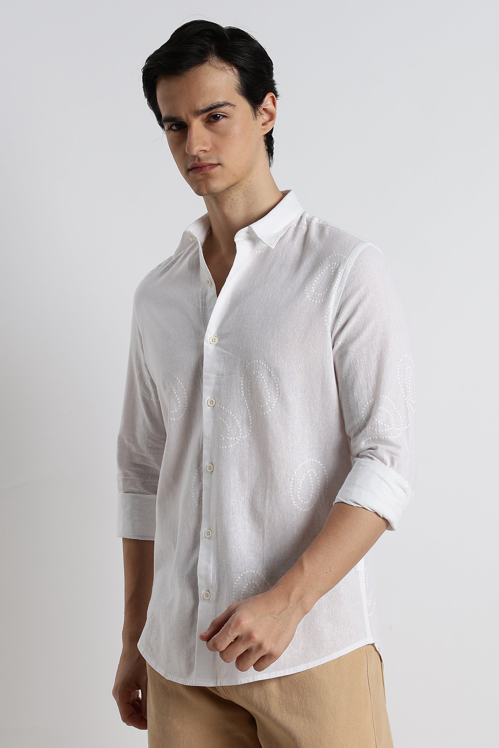 The dotted swirl pattern adds a refined artistic touch, making the shirt versatile enough for brunches, evening hangouts, or relaxed Fridays. Tailored in a slim fit, it shapes a clean silhouette while maintaining ease of movement. With a minimal, no-pocket design and a classic spread collar, it keeps your look crisp and contemporary.
