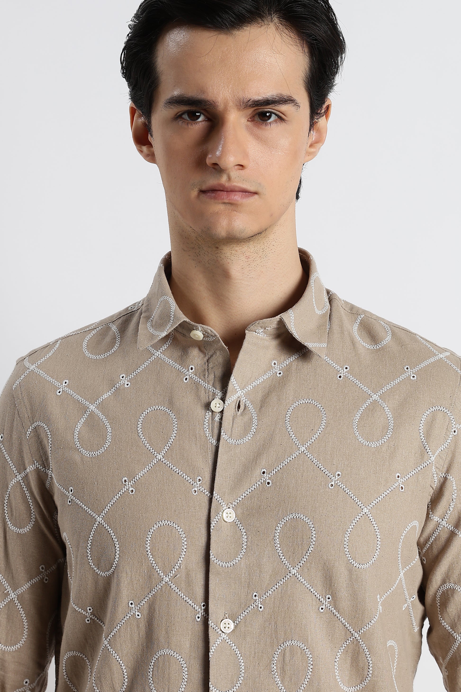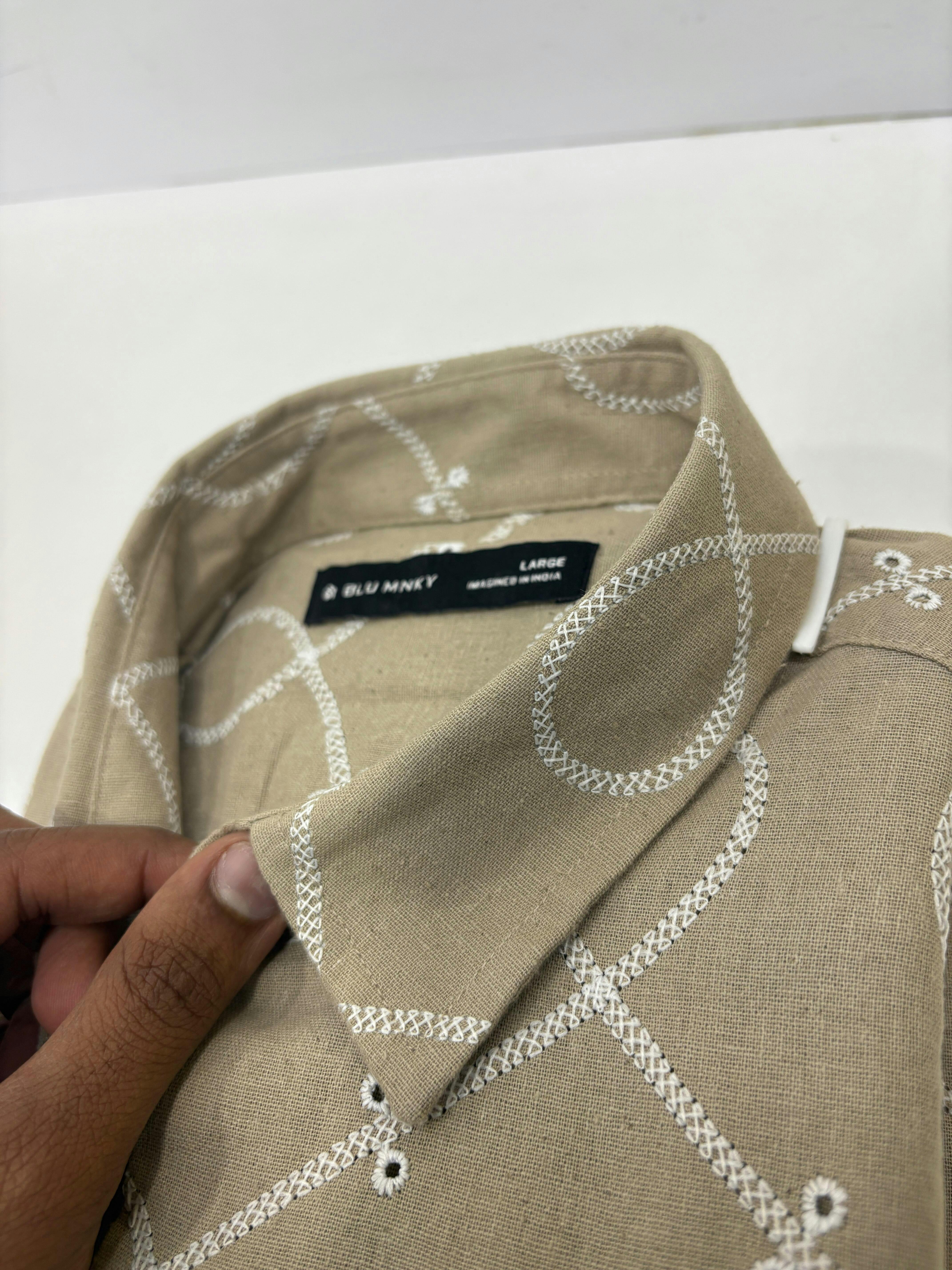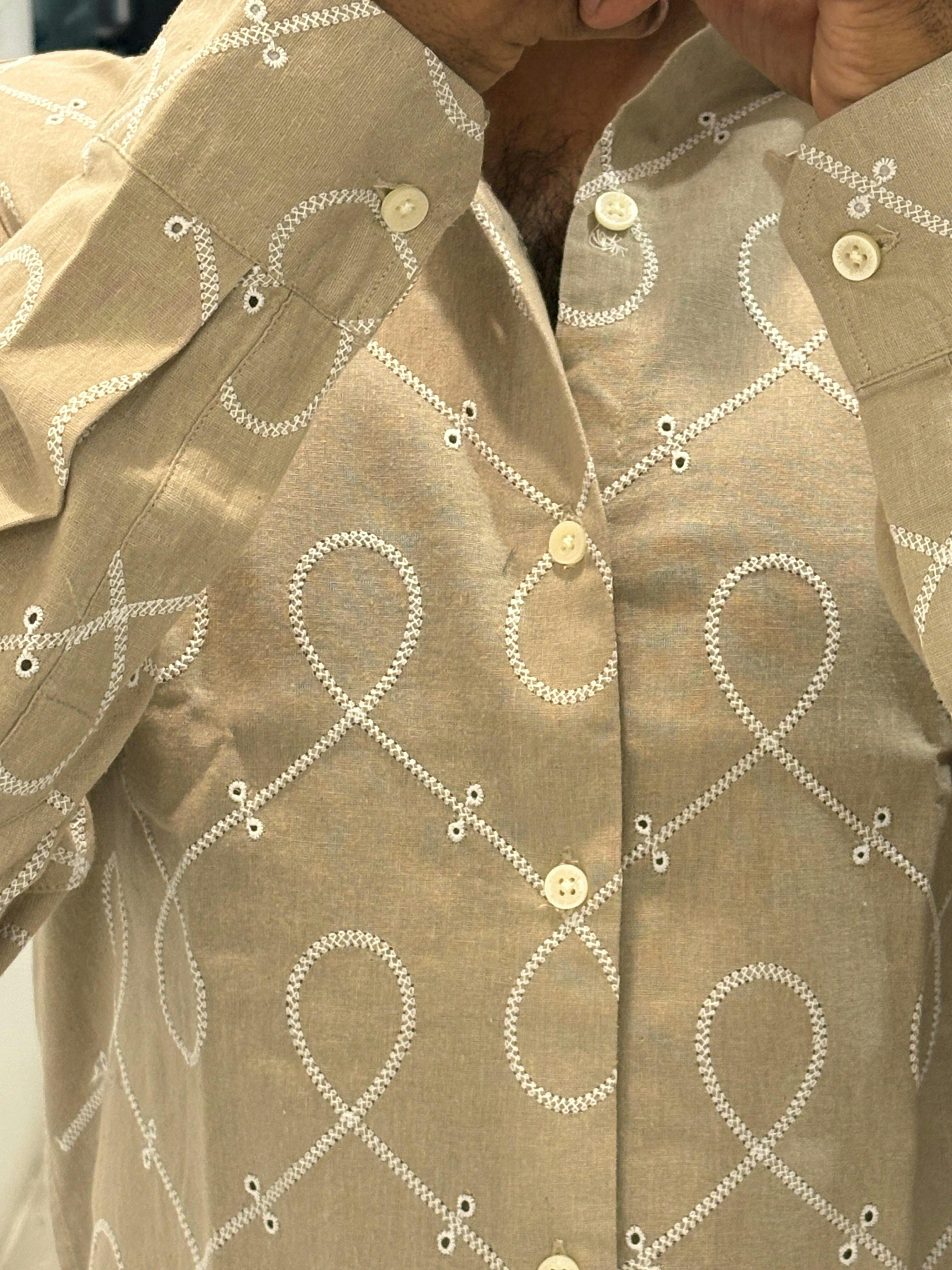 Crafted from a breathable 100% cotton-linen blend, this Lt Brown self-designed shirt features intricate loop embroidery that adds texture, character, and a handcrafted charm to your everyday style. The slim-fit silhouette keeps the look sharp, while the natural linen feel ensures comfort and ease throughout the day.