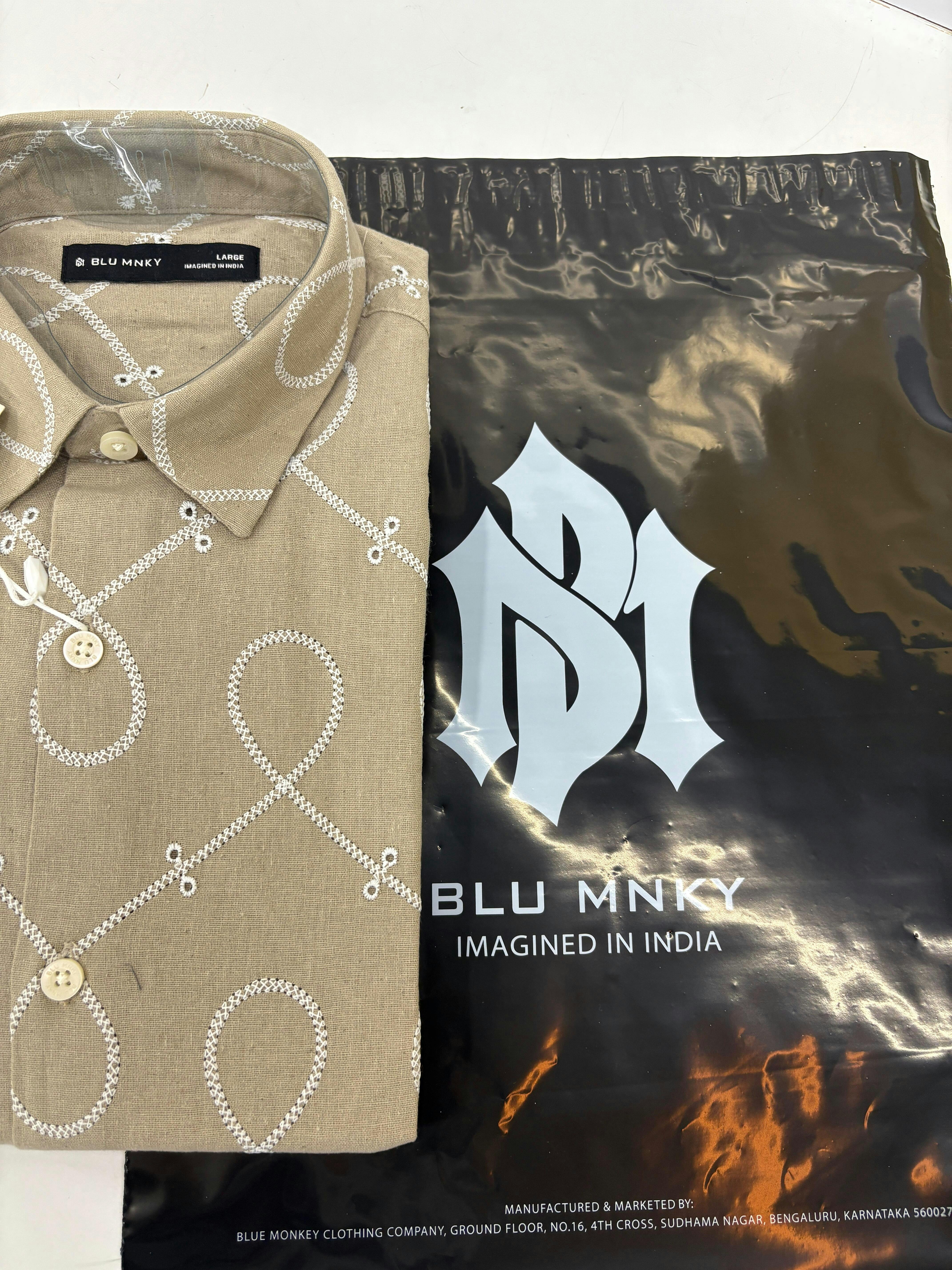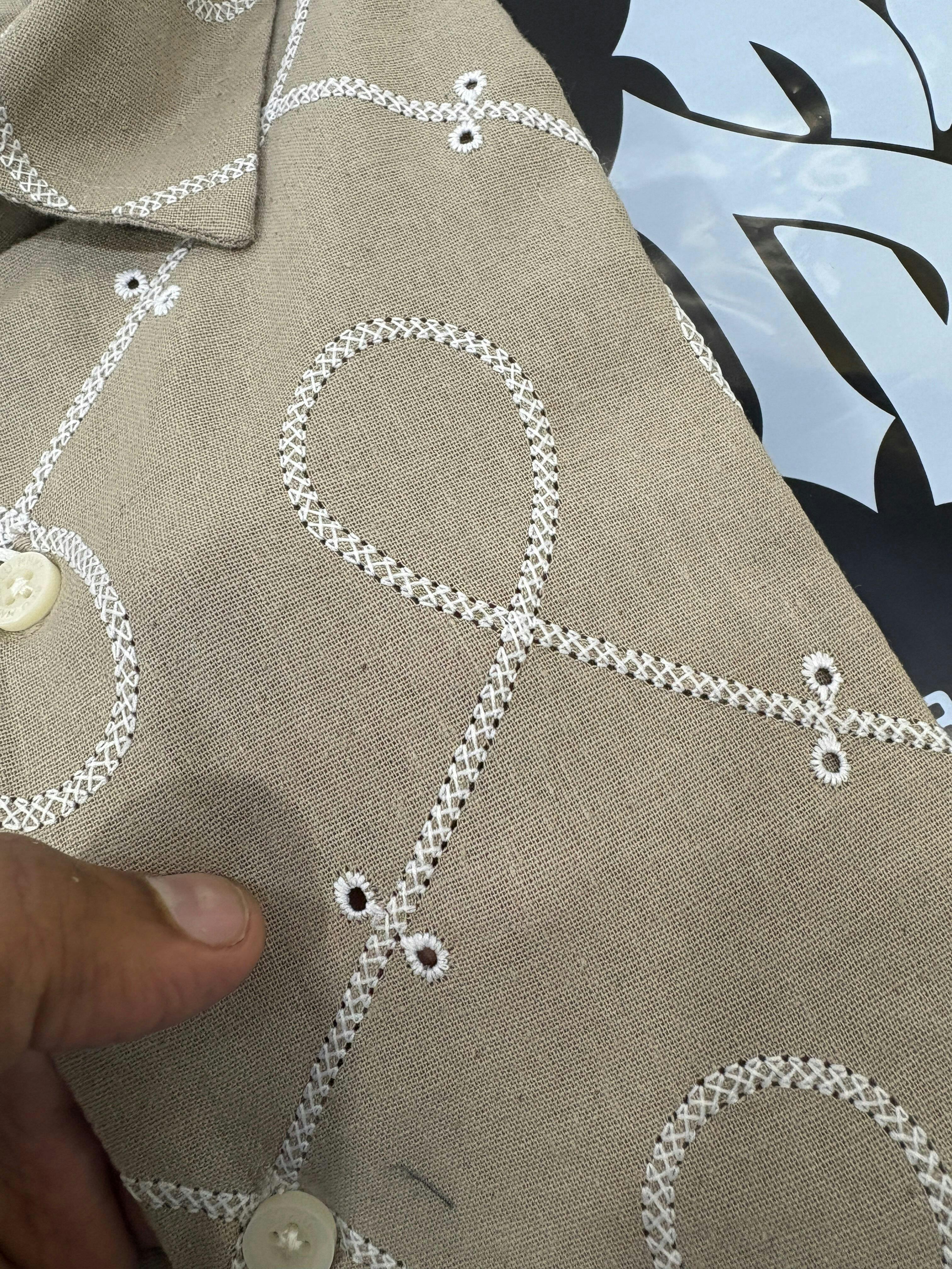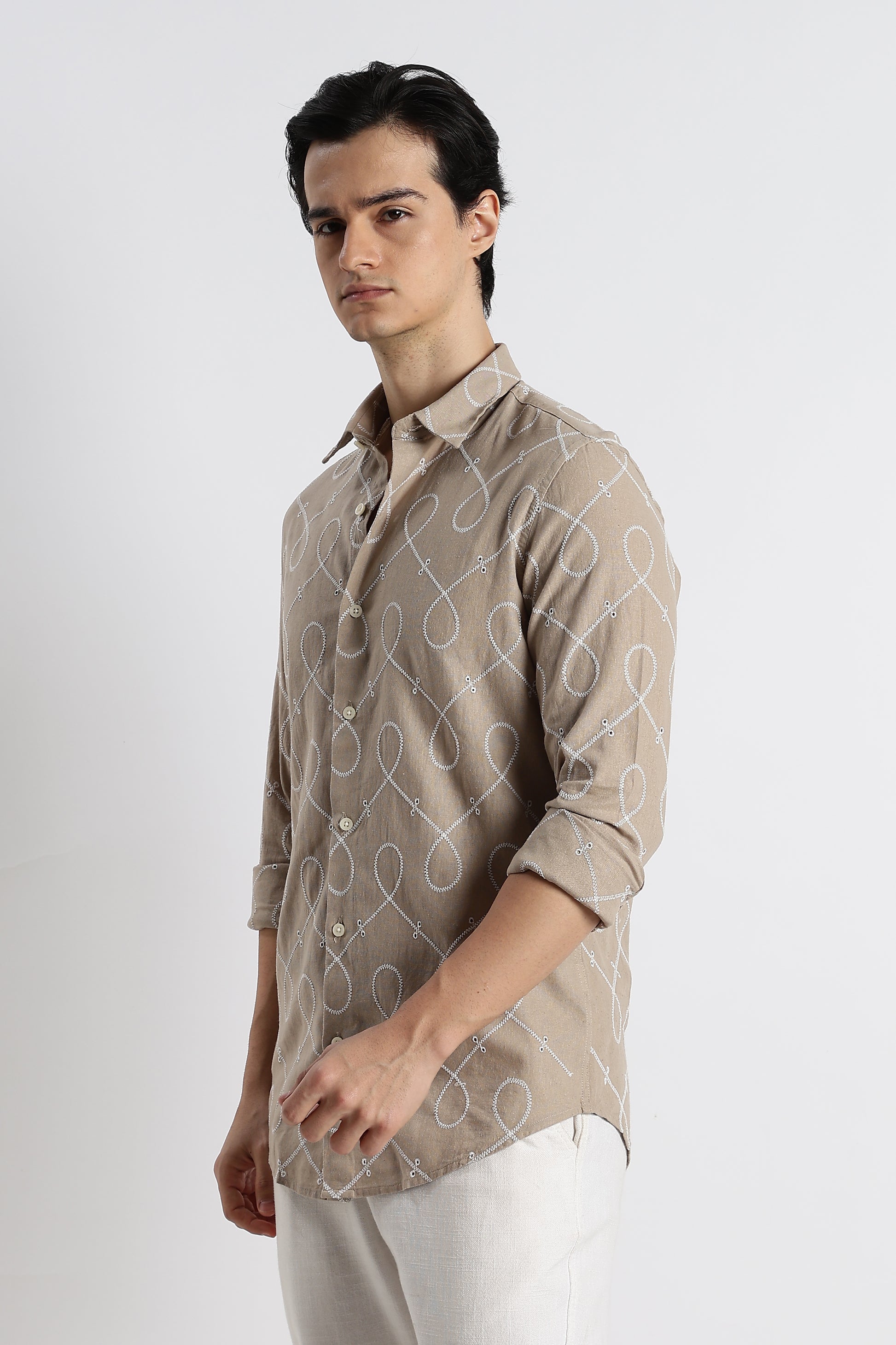 Crafted from a breathable 100% cotton-linen blend, this Lt Brown self-designed shirt features intricate loop embroidery that adds texture, character, and a handcrafted charm to your everyday style. The slim-fit silhouette keeps the look sharp, while the natural linen feel ensures comfort and ease throughout the day.