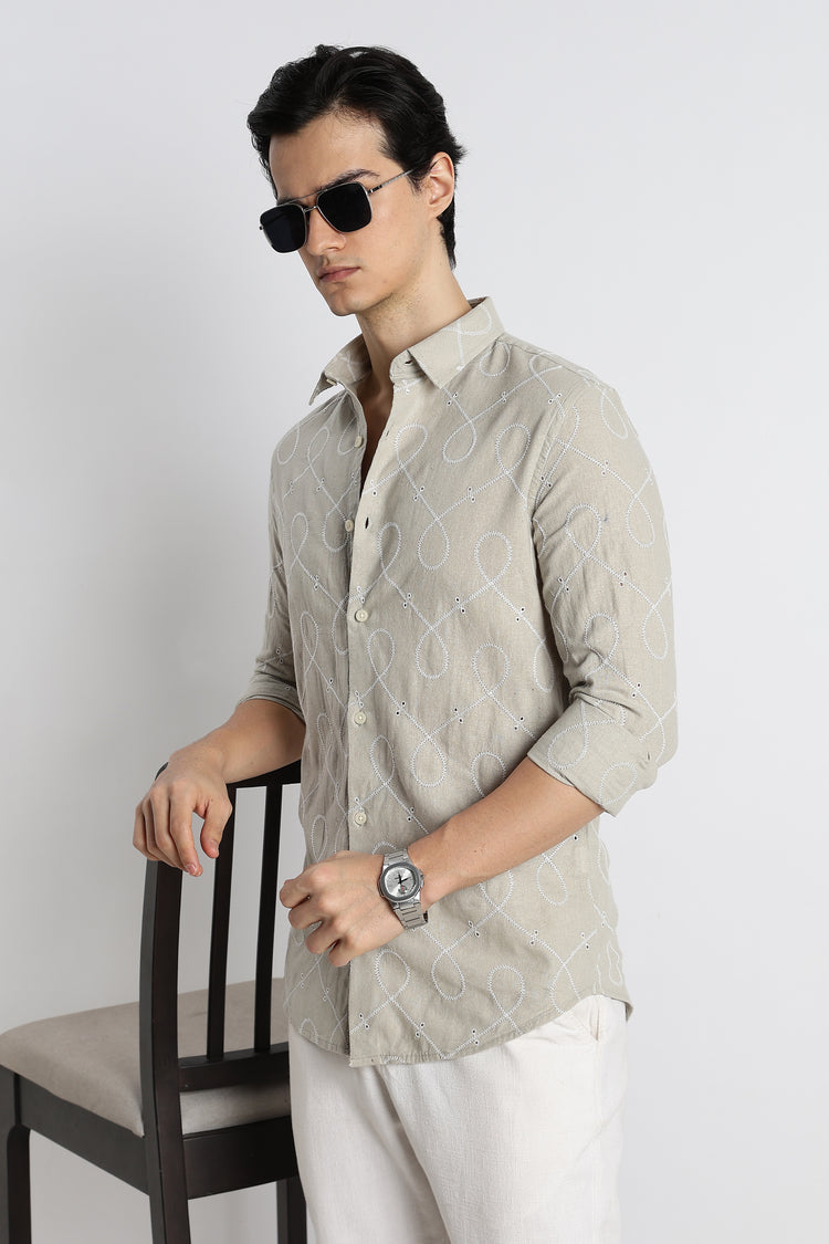 Crafted from a breathable 100% cotton-linen blend, this Lt Green self-designed shirt features intricate loop embroidery that adds texture, character, and a handcrafted charm to your everyday style. The slim-fit silhouette keeps the look sharp, while the natural linen feel ensures comfort and ease throughout the day.