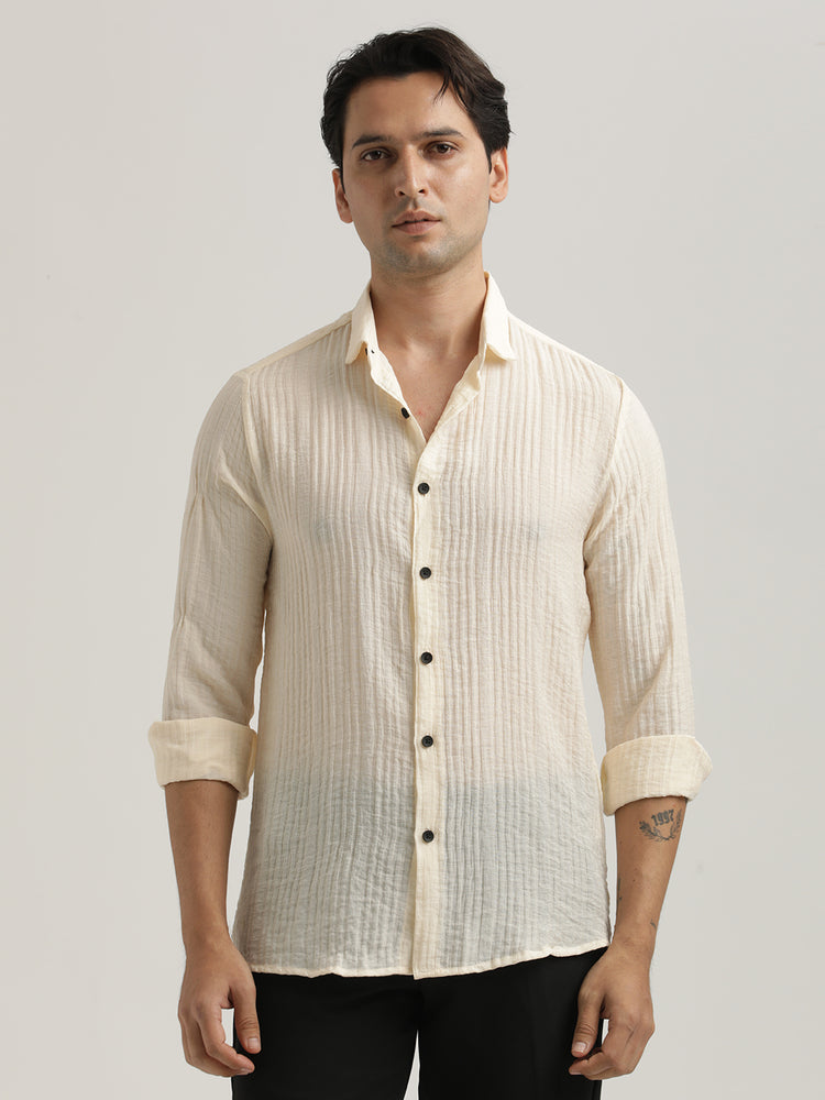Made to feel like nothing, but look like everything. This slim-fit shirt is crafted from a feather-light nylon blend with a subtle self-design. Full sleeves, no pockets, all presence. Minimal, breathable, and always in control.