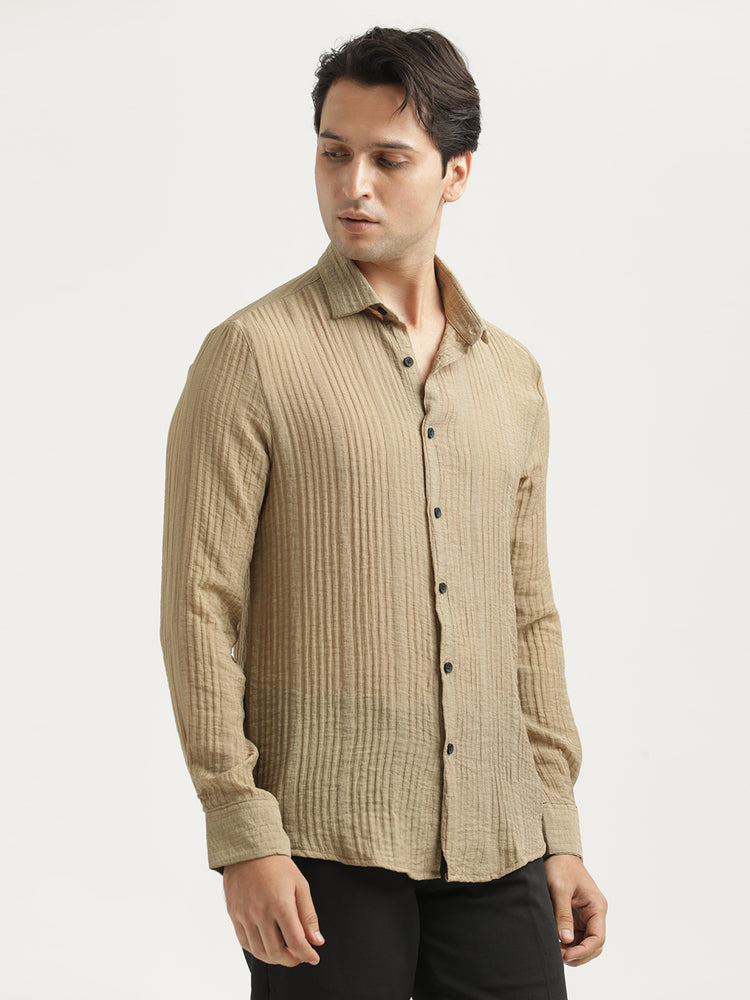 Made to feel like nothing, but look like everything. This slim-fit shirt is crafted from a feather-light nylon blend with a subtle self-design. Full sleeves, no pockets, all presence. Minimal, breathable, and always in control.