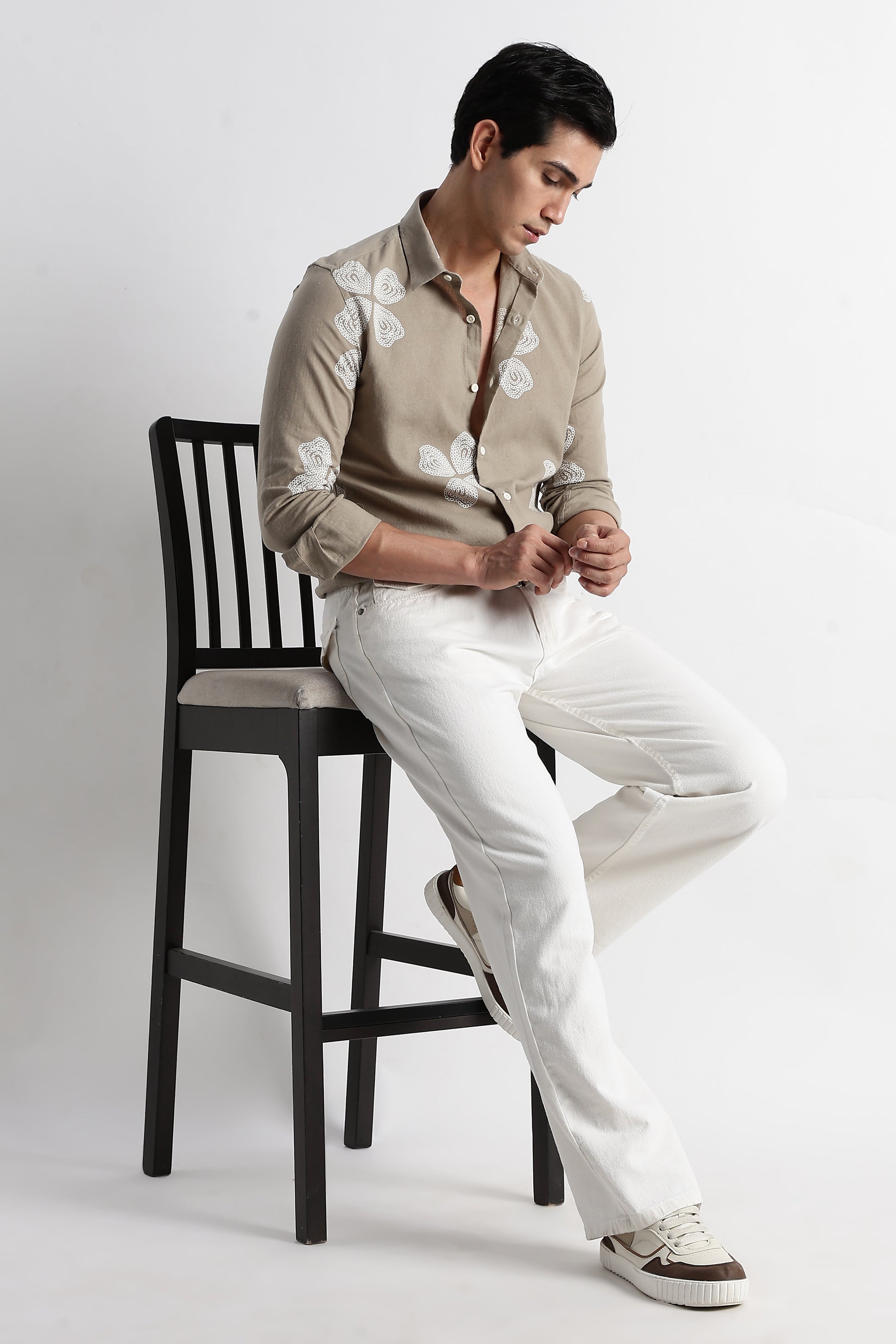 Elevate your everyday style with this Grey self-designed shirt, crafted in a breathable cotton-linen blend. The shirt features intricate white embroidered motifs placed thoughtfully across the fabric, giving it a refined yet artistic edge.