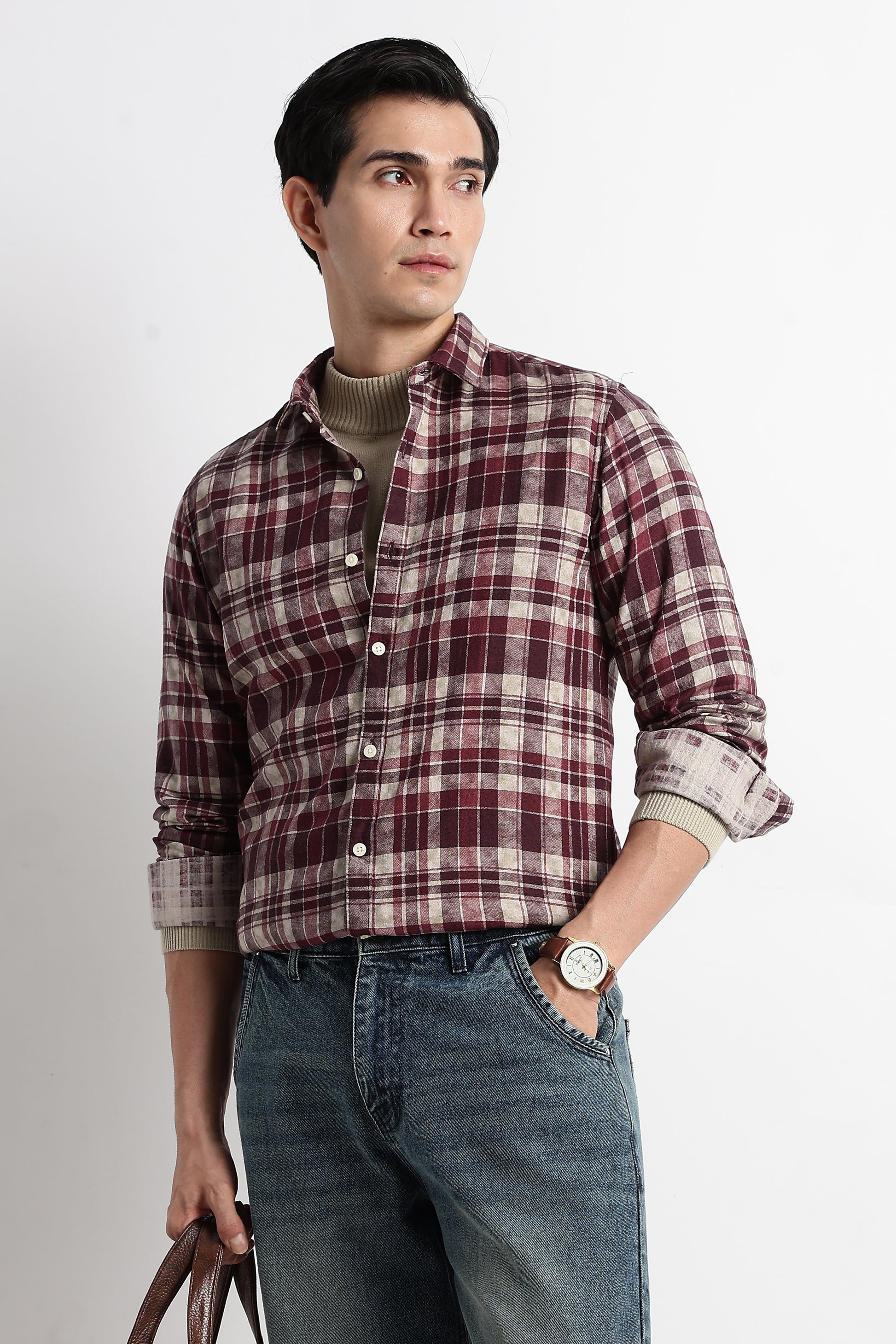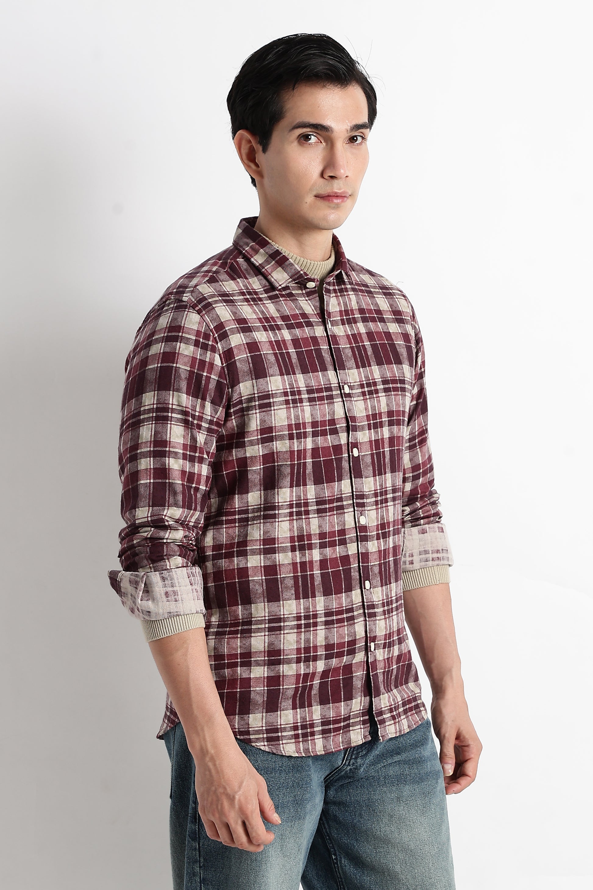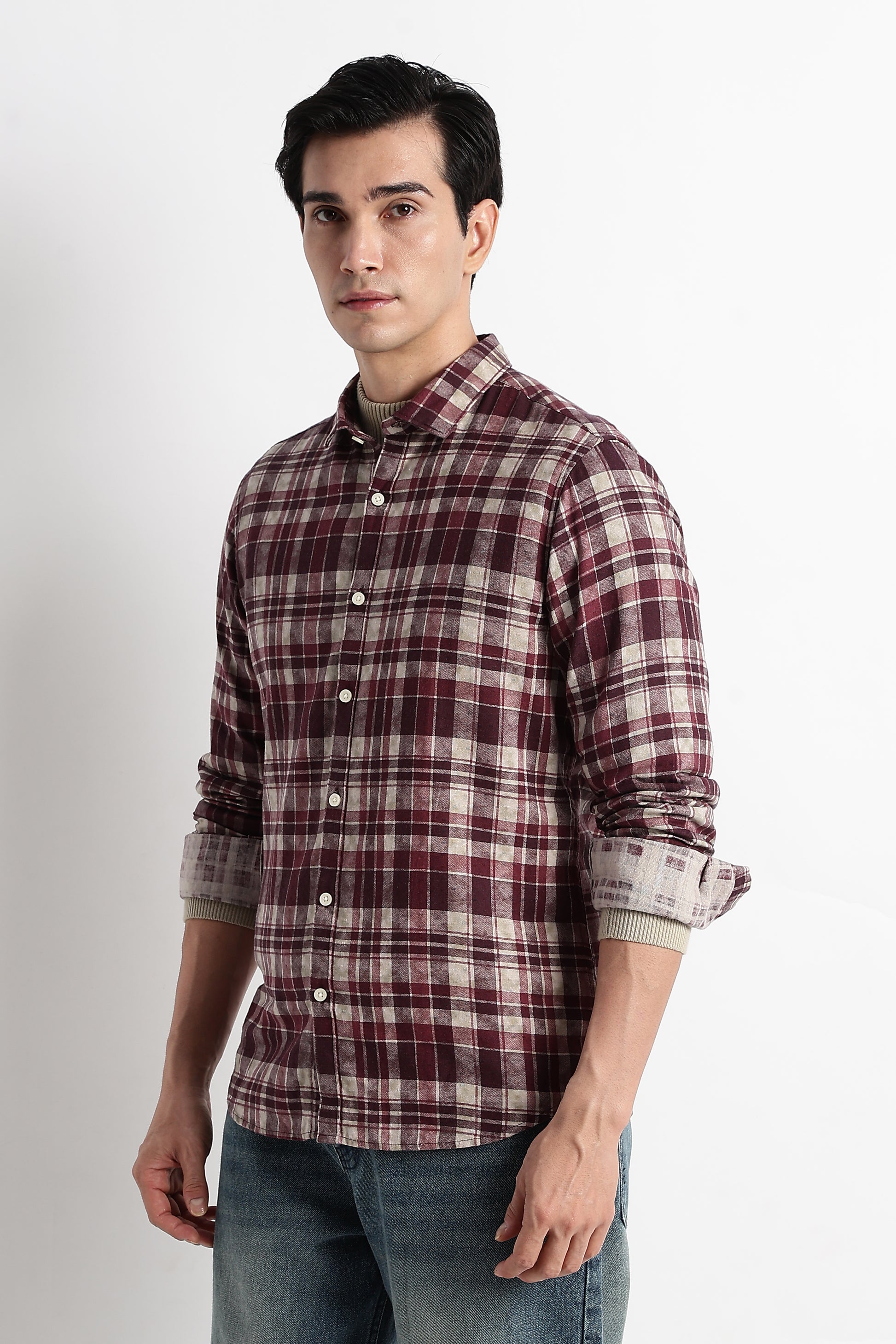 This slim-fit check shirt is crafted from 100% pure cotton, giving you breathable comfort with a soft, natural feel. The muted Maroon check pattern adds a refined edge — subtle, versatile, and perfect for everyday wear.