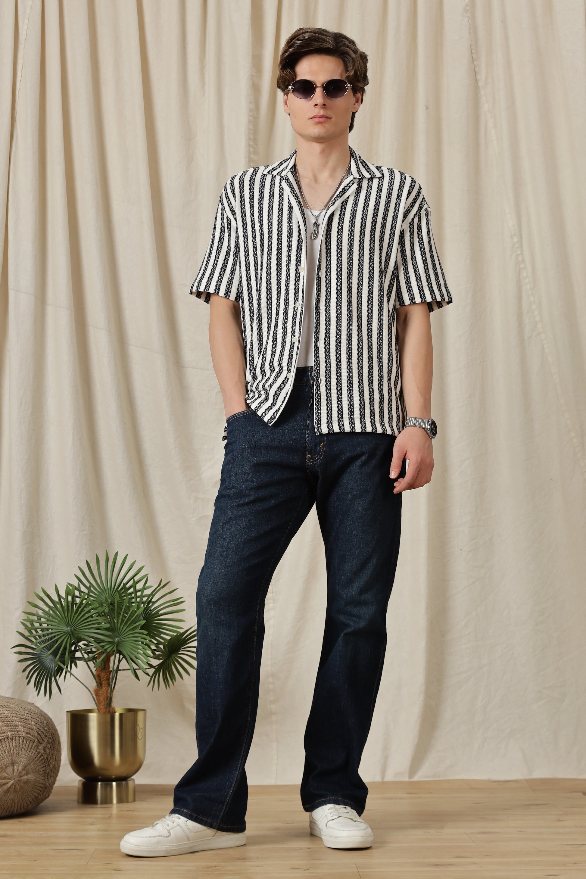 The loose fit creates a laid-back, contemporary profile, while the half sleeves keep the look breezy and season-ready. The textured fabric adds depth without being loud, and the clean, pocket-free front ensures a refined finish. Designed with an open resort collar, this shirt balances casual ease with a fashion-forward edge.