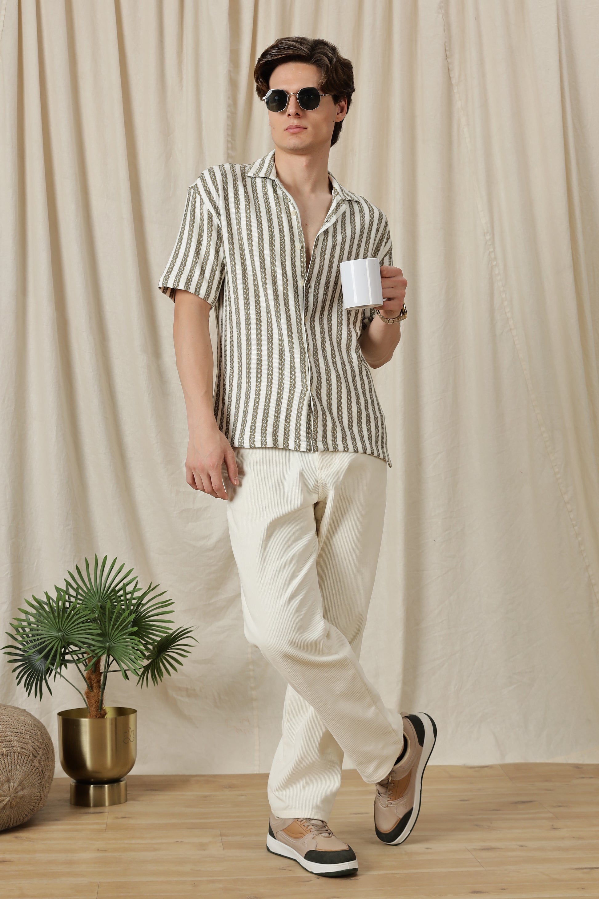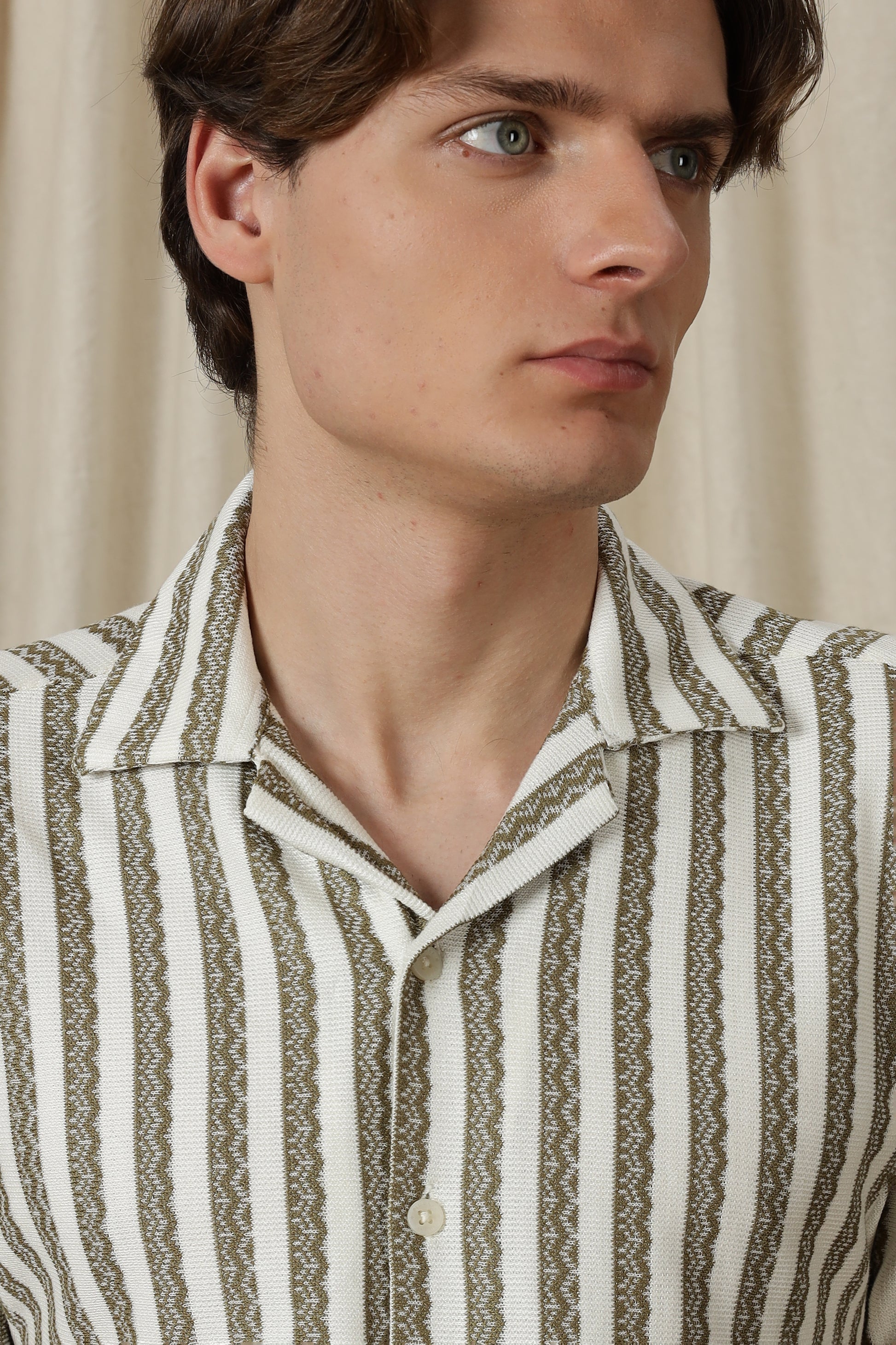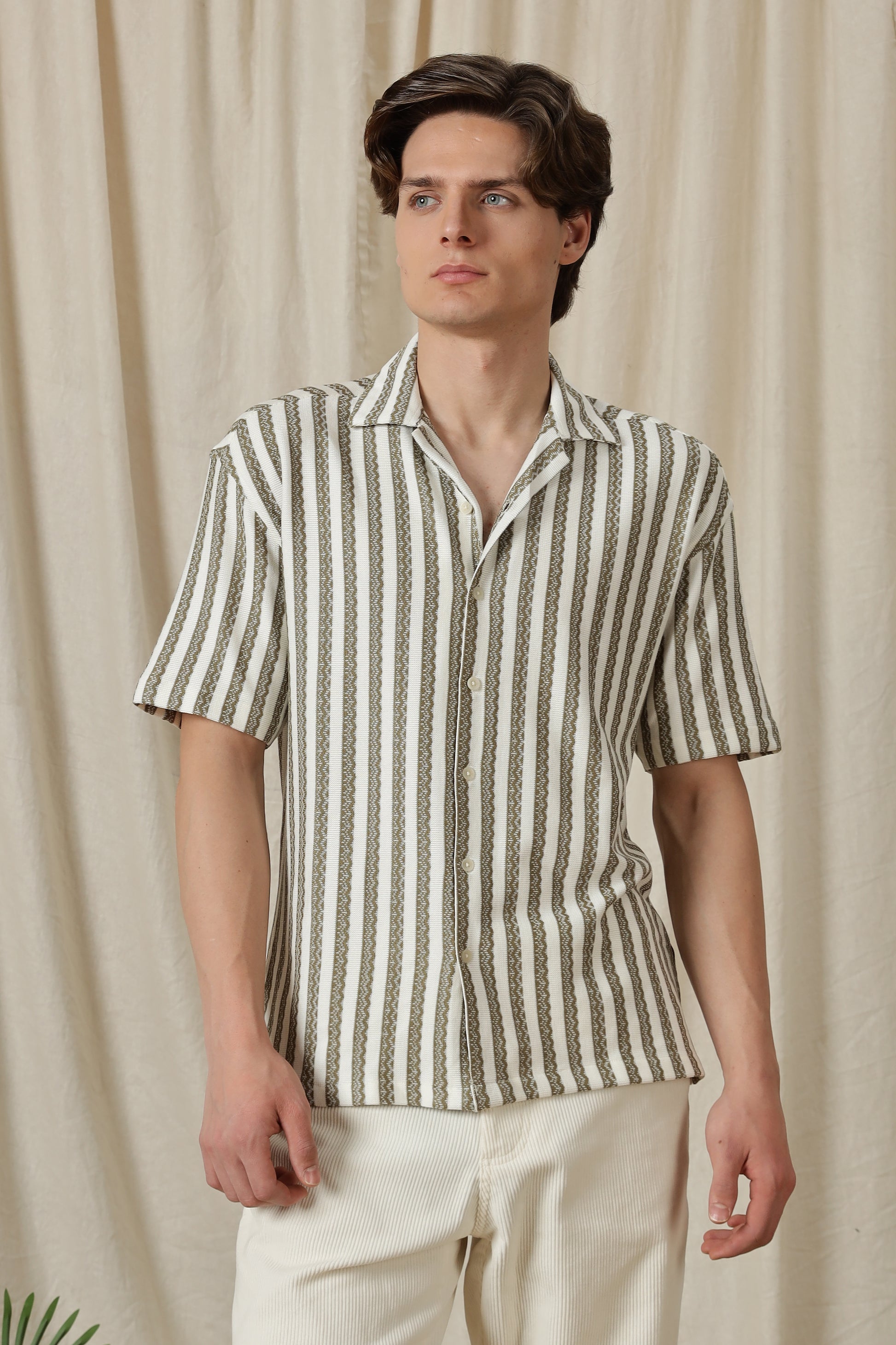 The loose fit creates a laid-back, contemporary profile, while the half sleeves keep the look breezy and season-ready. The textured fabric adds depth without being loud, and the clean, pocket-free front ensures a refined finish. Designed with an open resort collar, this shirt balances casual ease with a fashion-forward edge.