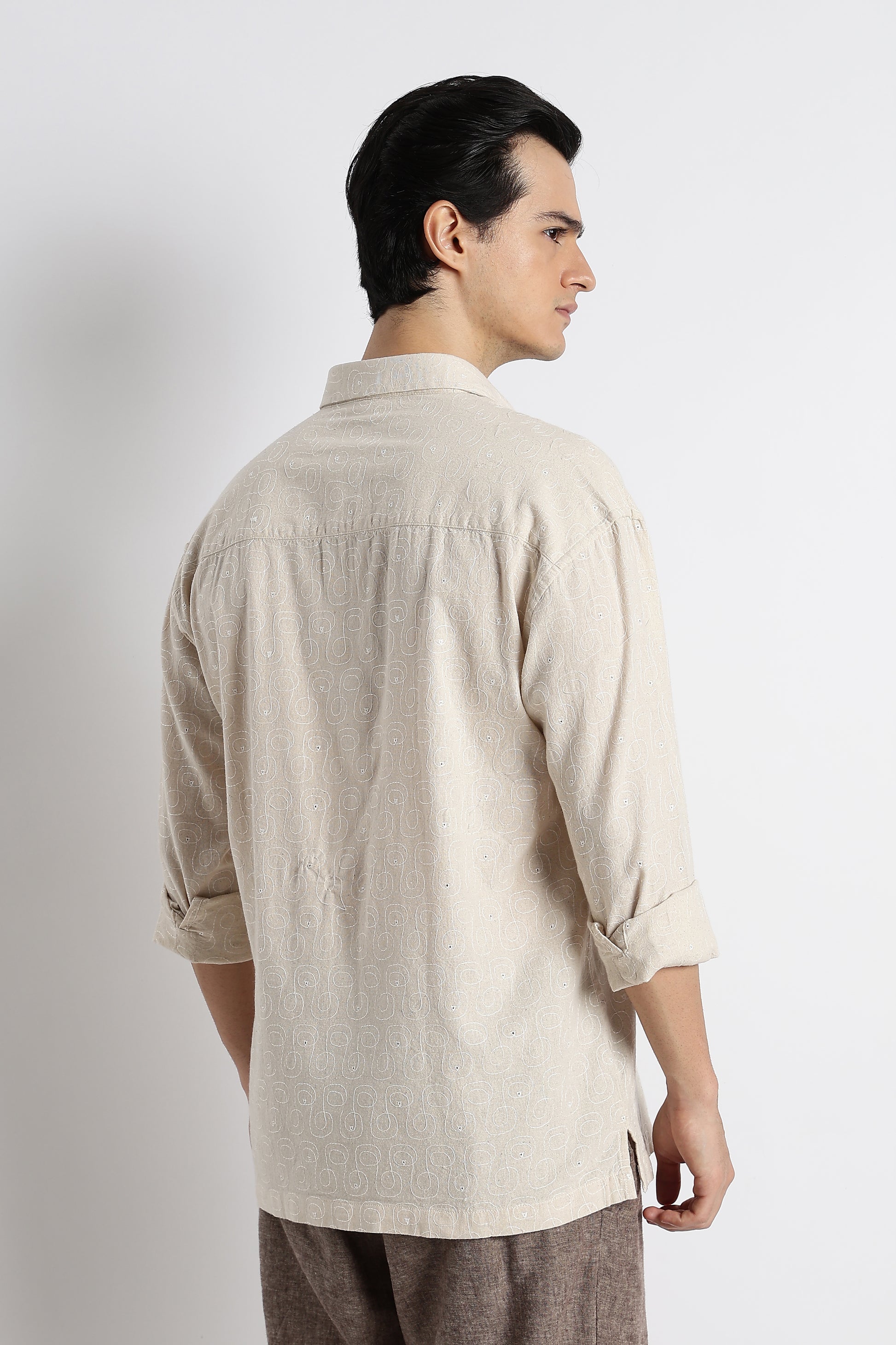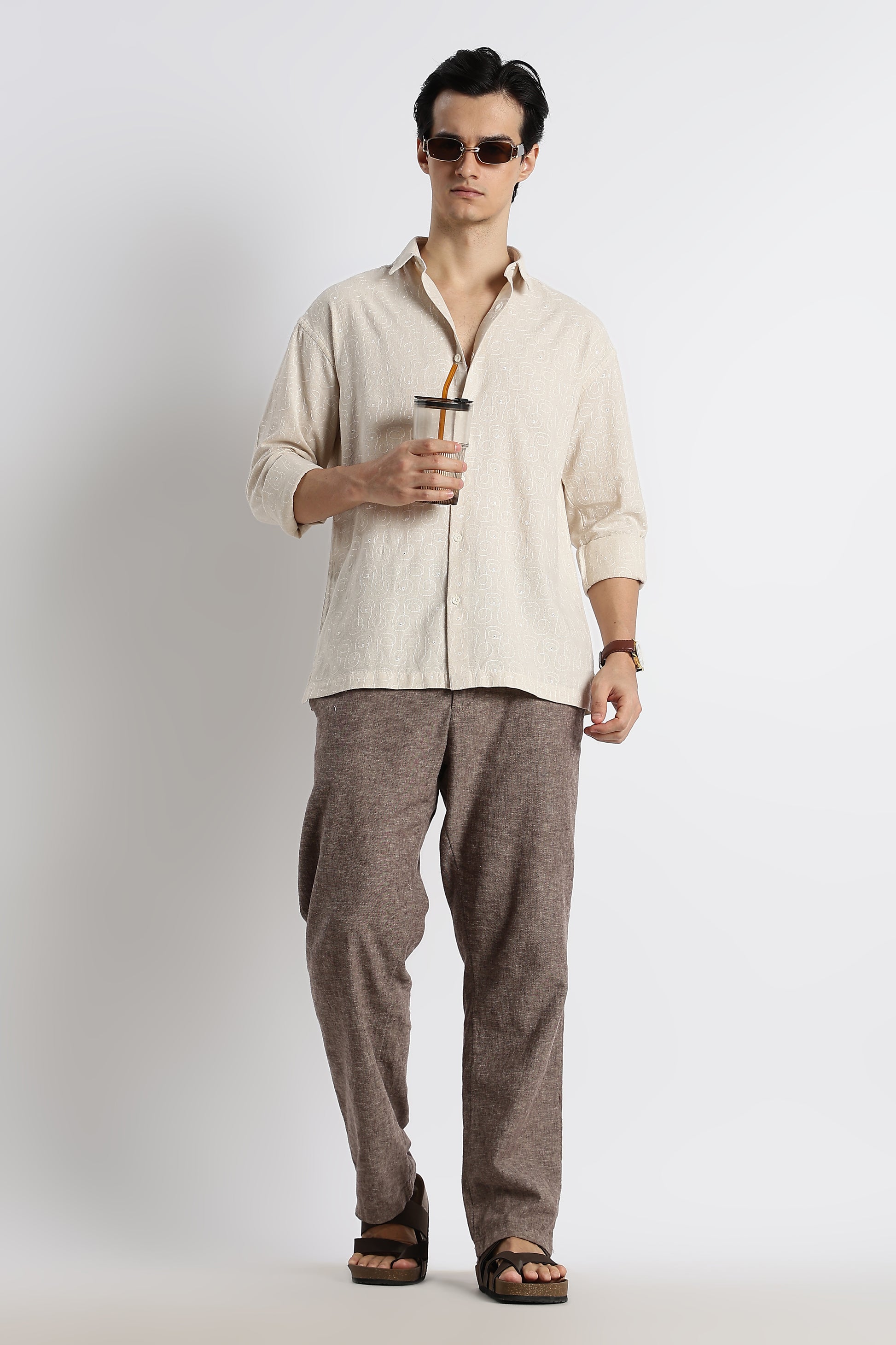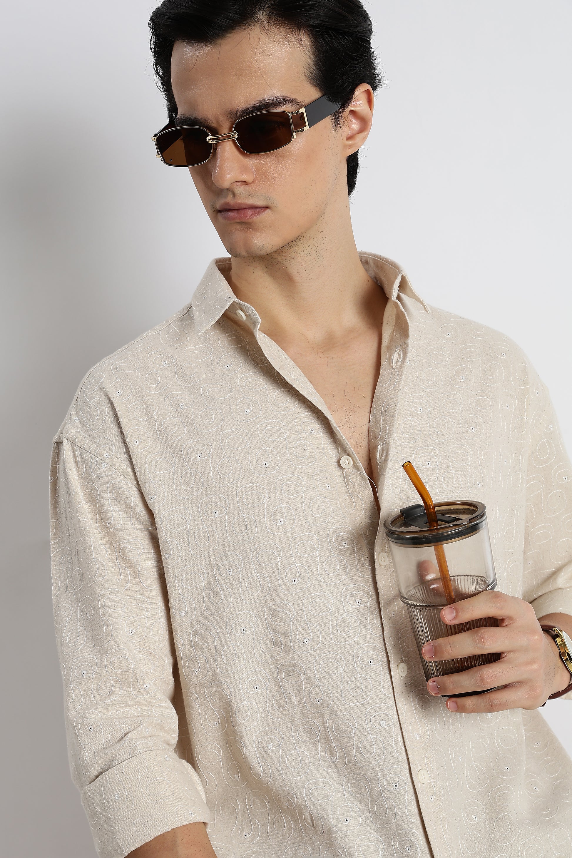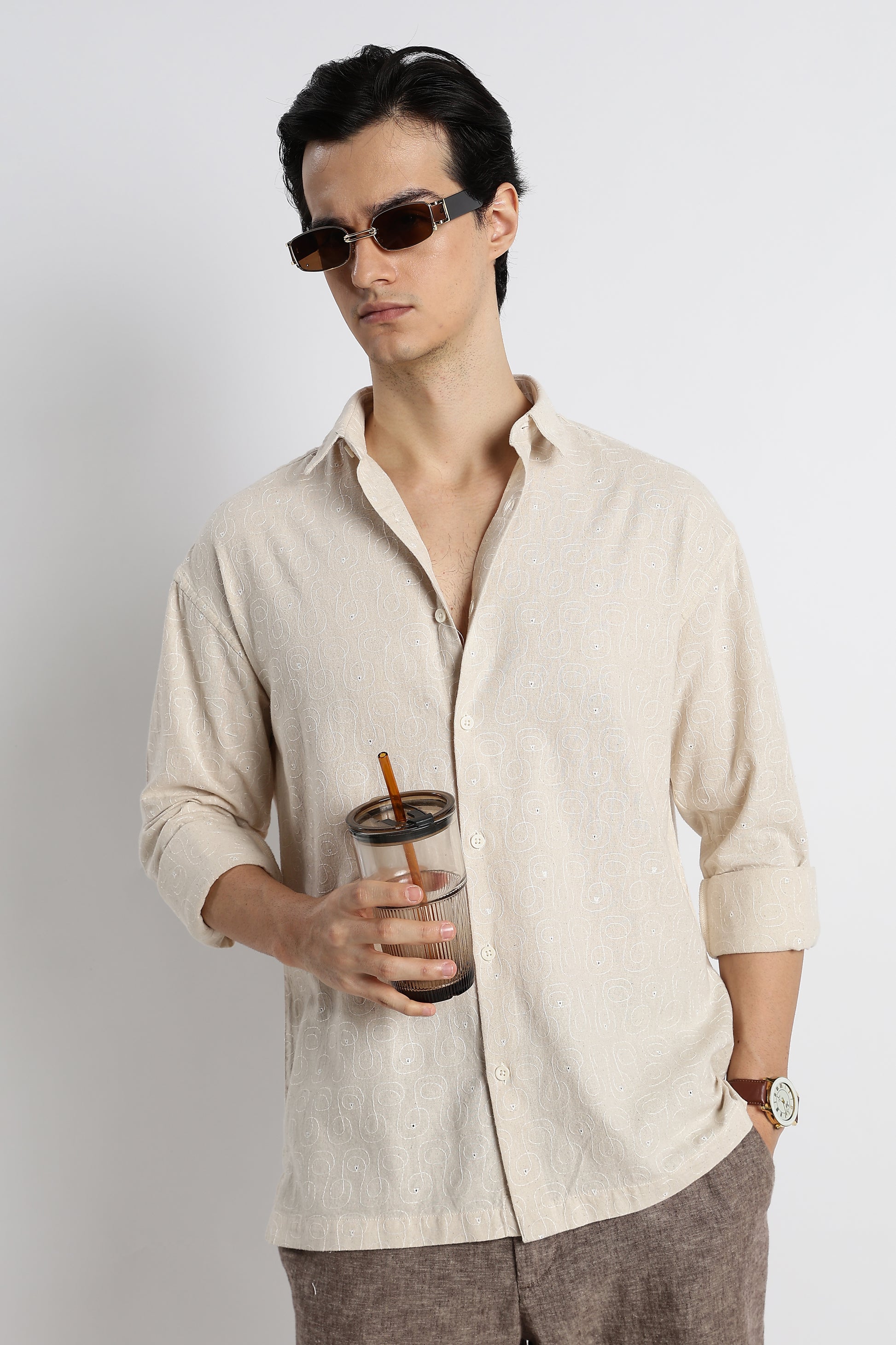 Crafted from 100% breathable cotton, this Cream embroidered shirt features a subtle all-over textured pattern that adds depth without overpowering your look. Designed in a slim-fit silhouette, it stays sharp while offering day-long comfort.
