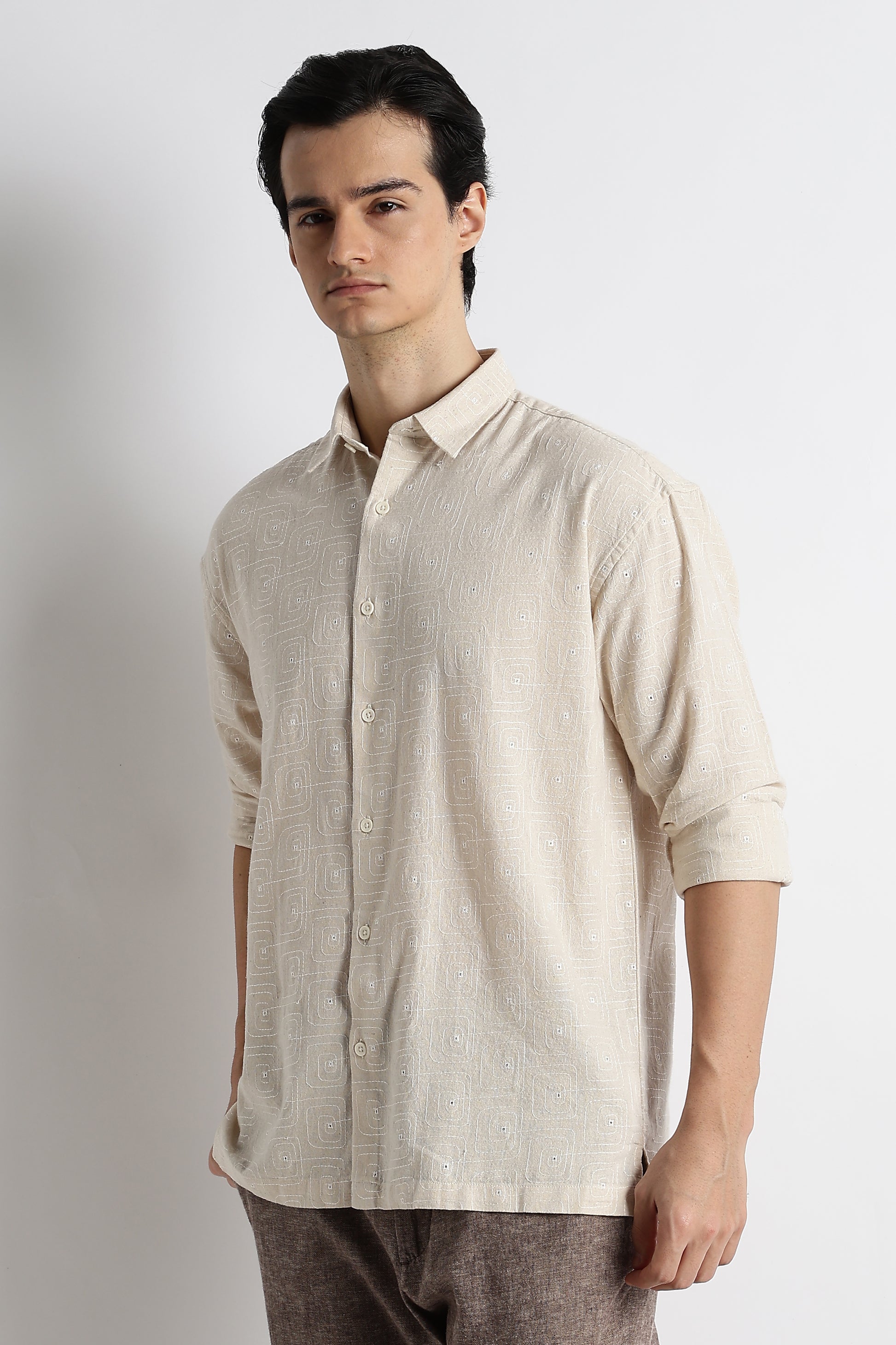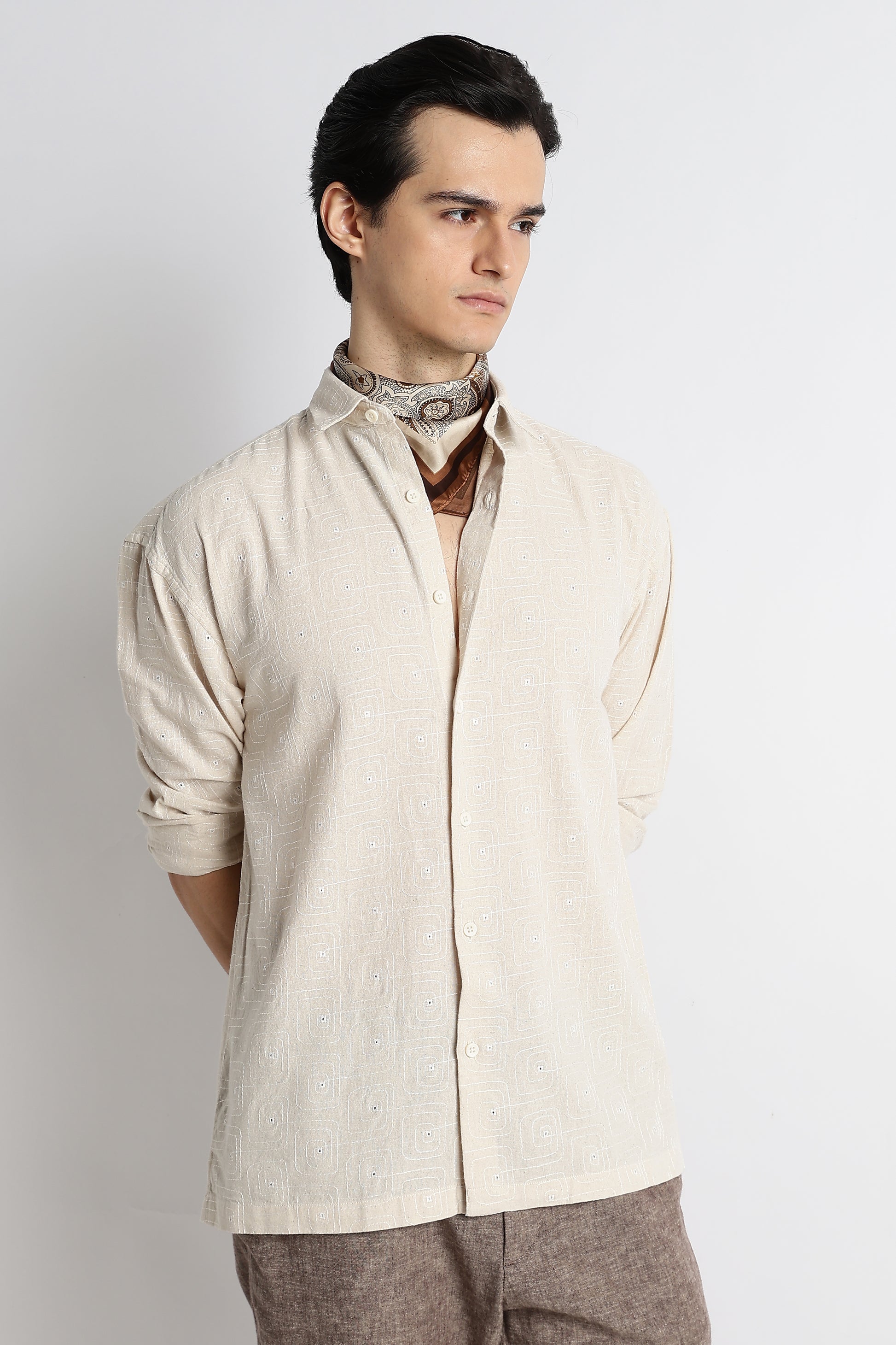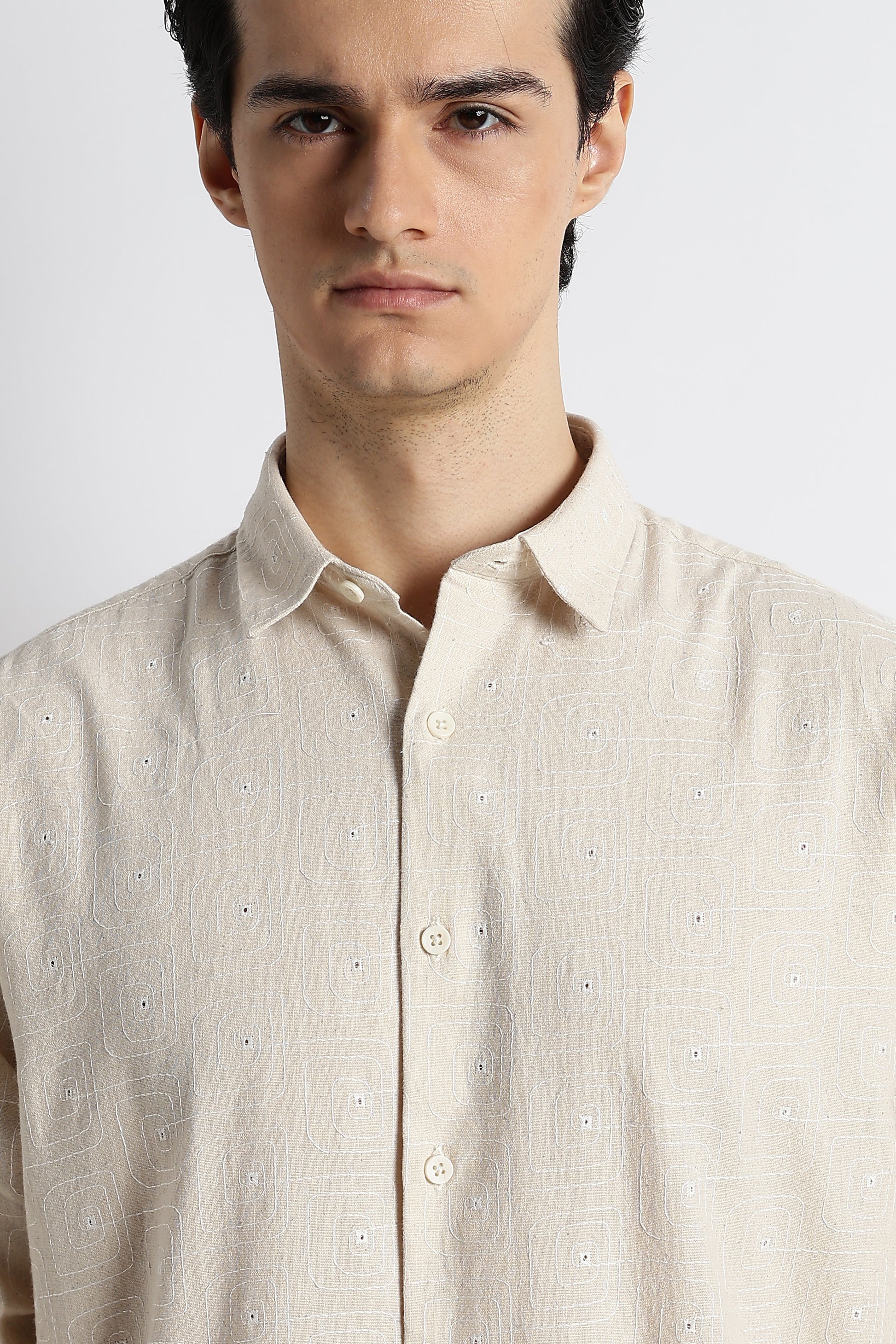 Crafted from 100% breathable cotton, this Cream embroidered shirt features a subtle all-over textured pattern that adds depth without overpowering your look. Designed in a slim-fit silhouette, it stays sharp while offering day-long comfort.