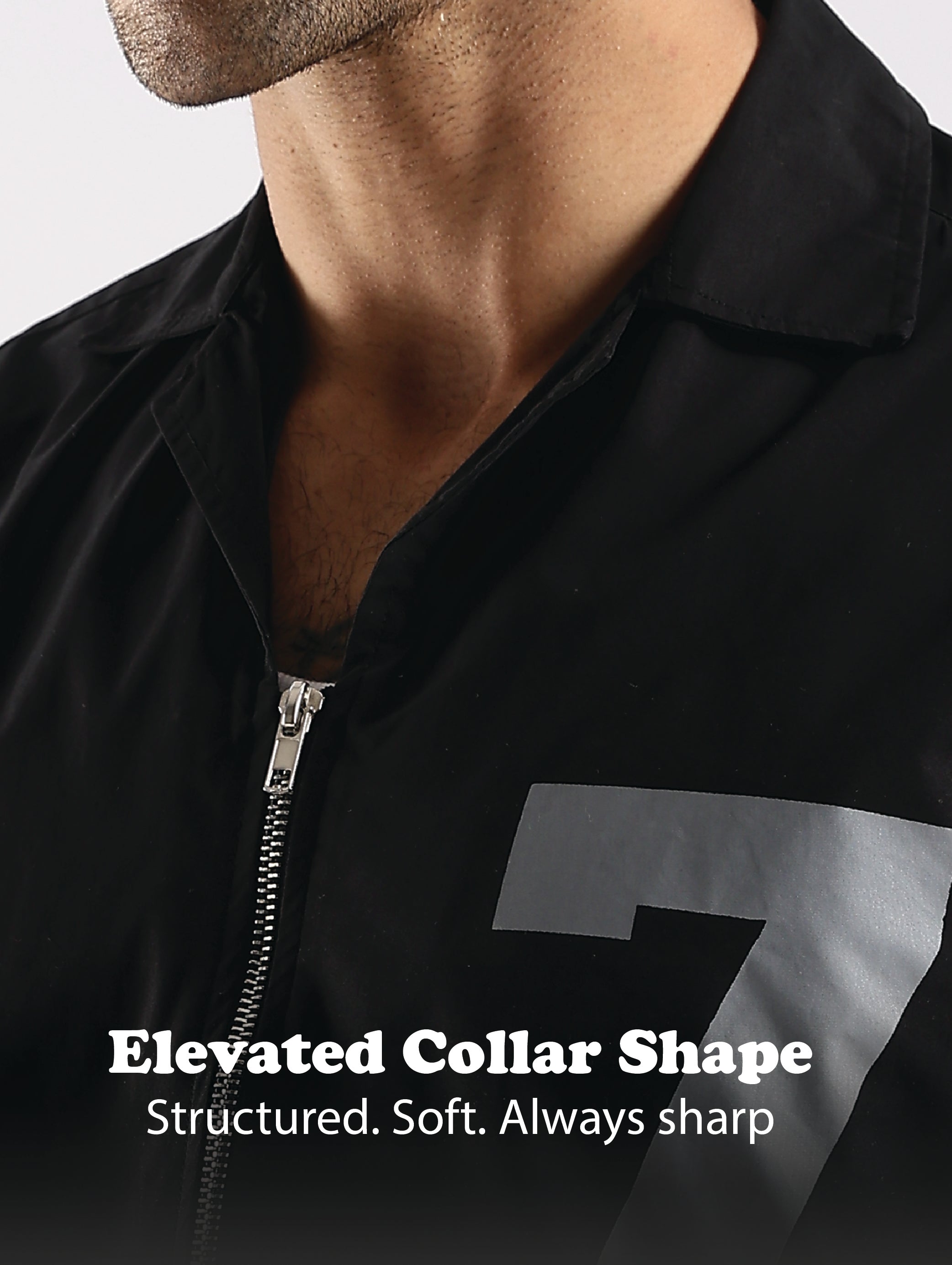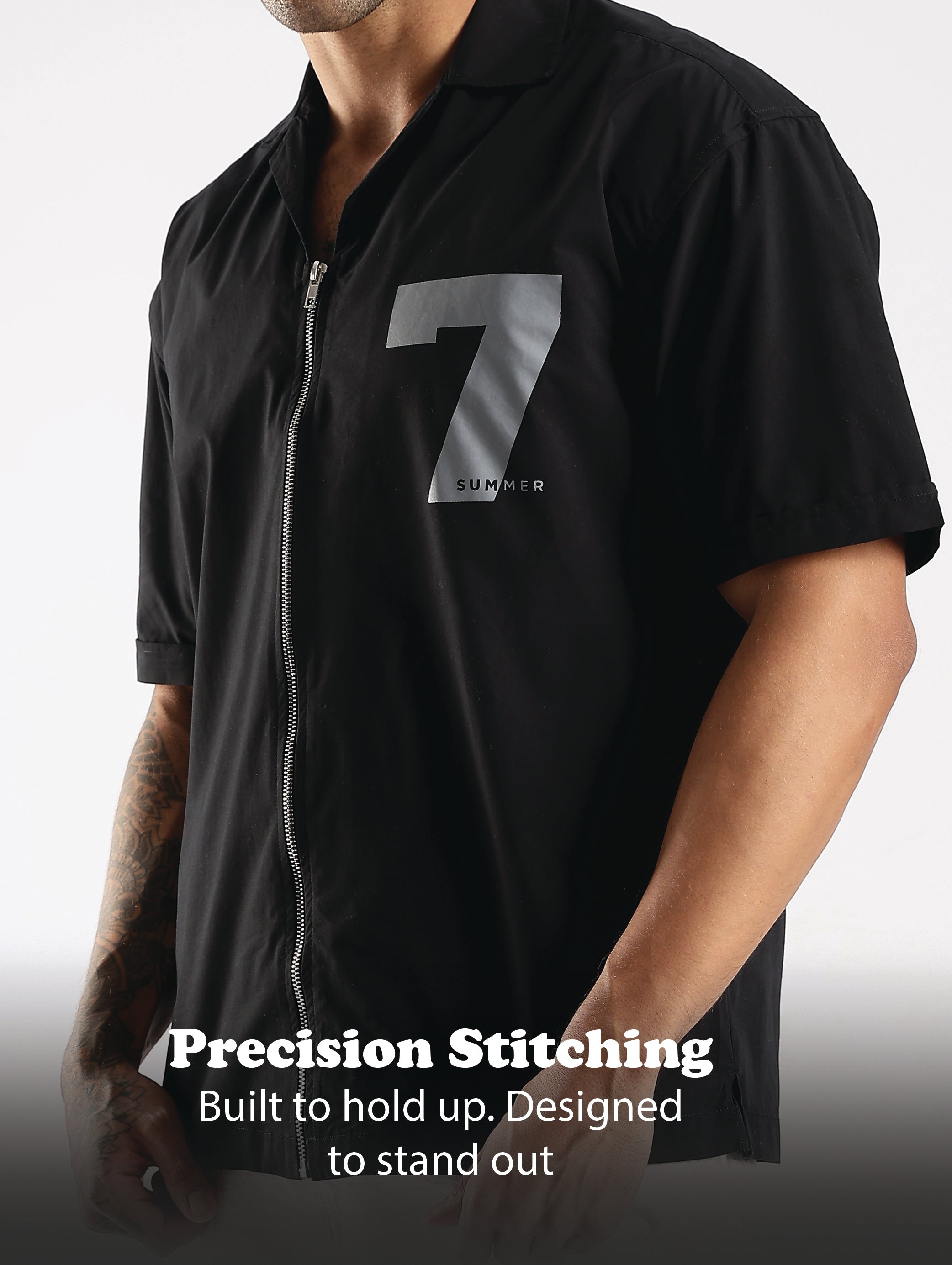 Add a sporty twist to your casual wear with this navy slim-fit shirt, crafted in a durable yet lightweight poly cotton fabric. Featuring a sleek zip-up closure in place of traditional buttons, it brings a bold, contemporary update to the classic shirt. The minimal solid base is enhanced with a subtle printed "7" motif on the chest, giving it a modern streetwear vibe.