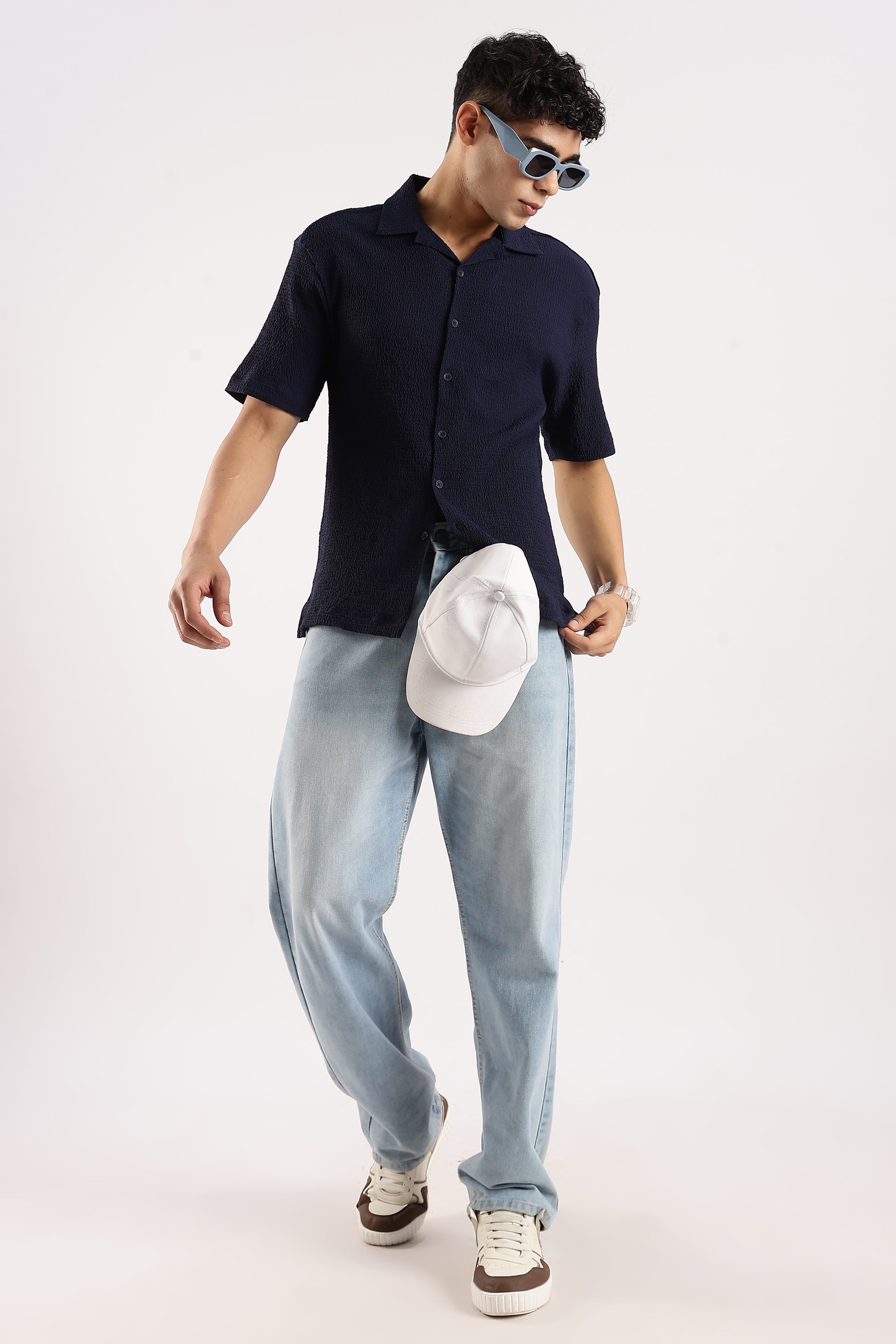 Effortless, light, and laid-back — this sky-blue oversized shirt is made for days that flow easy. Crafted from premium poly fabric with a unique textured finish, it delivers both comfort and character. The self-designed weave adds depth while keeping it breathable and cool against the skin.