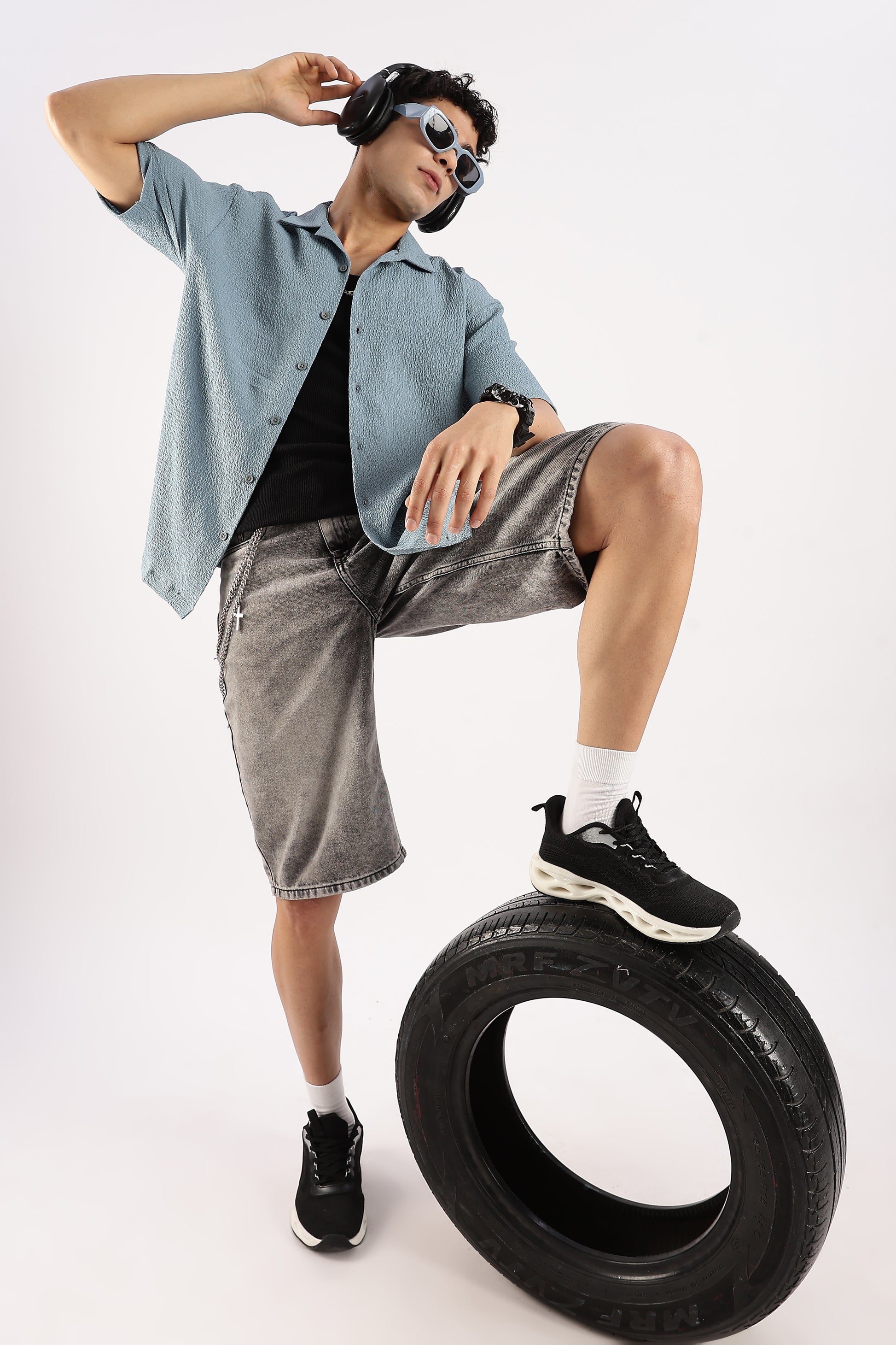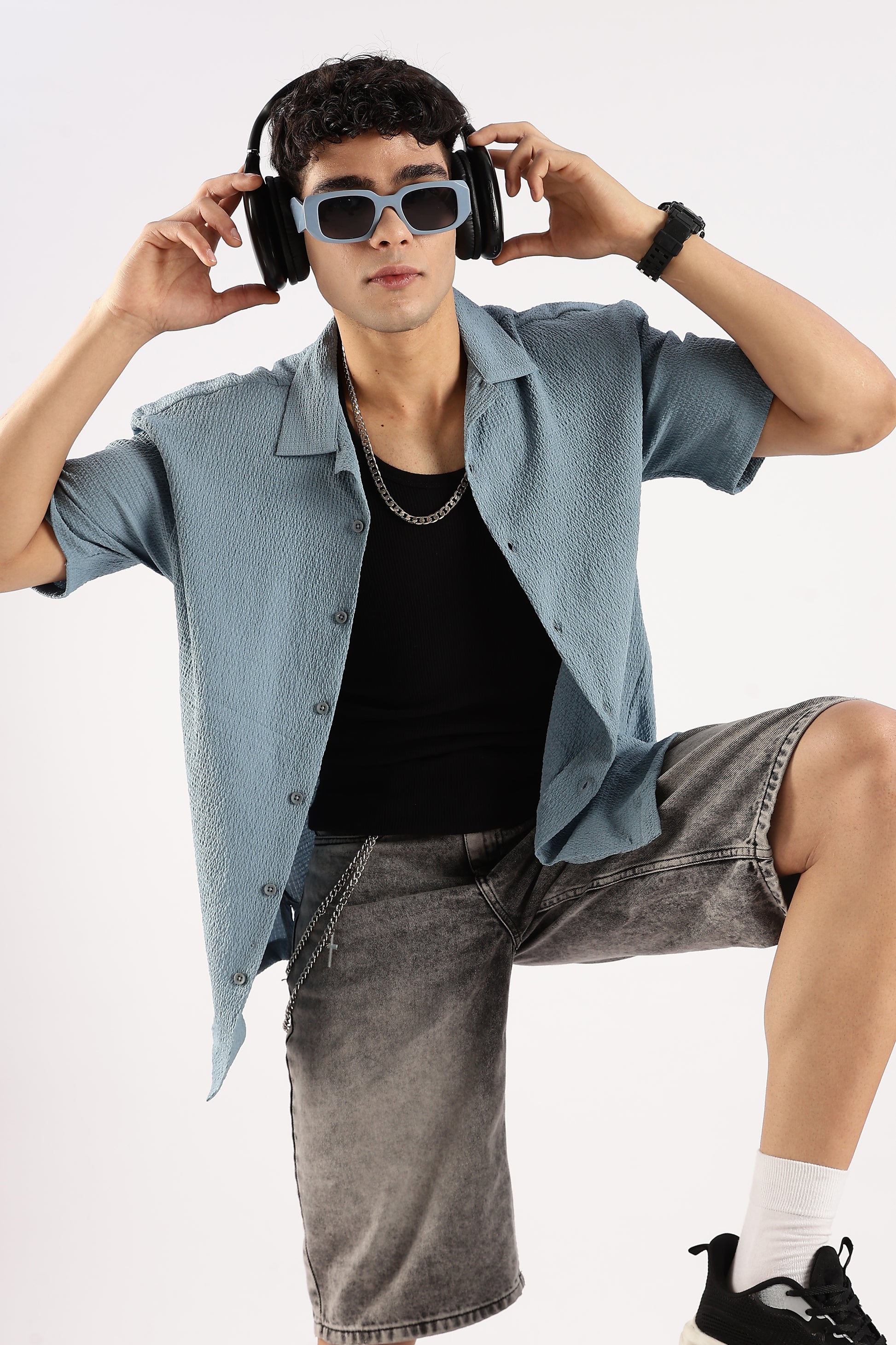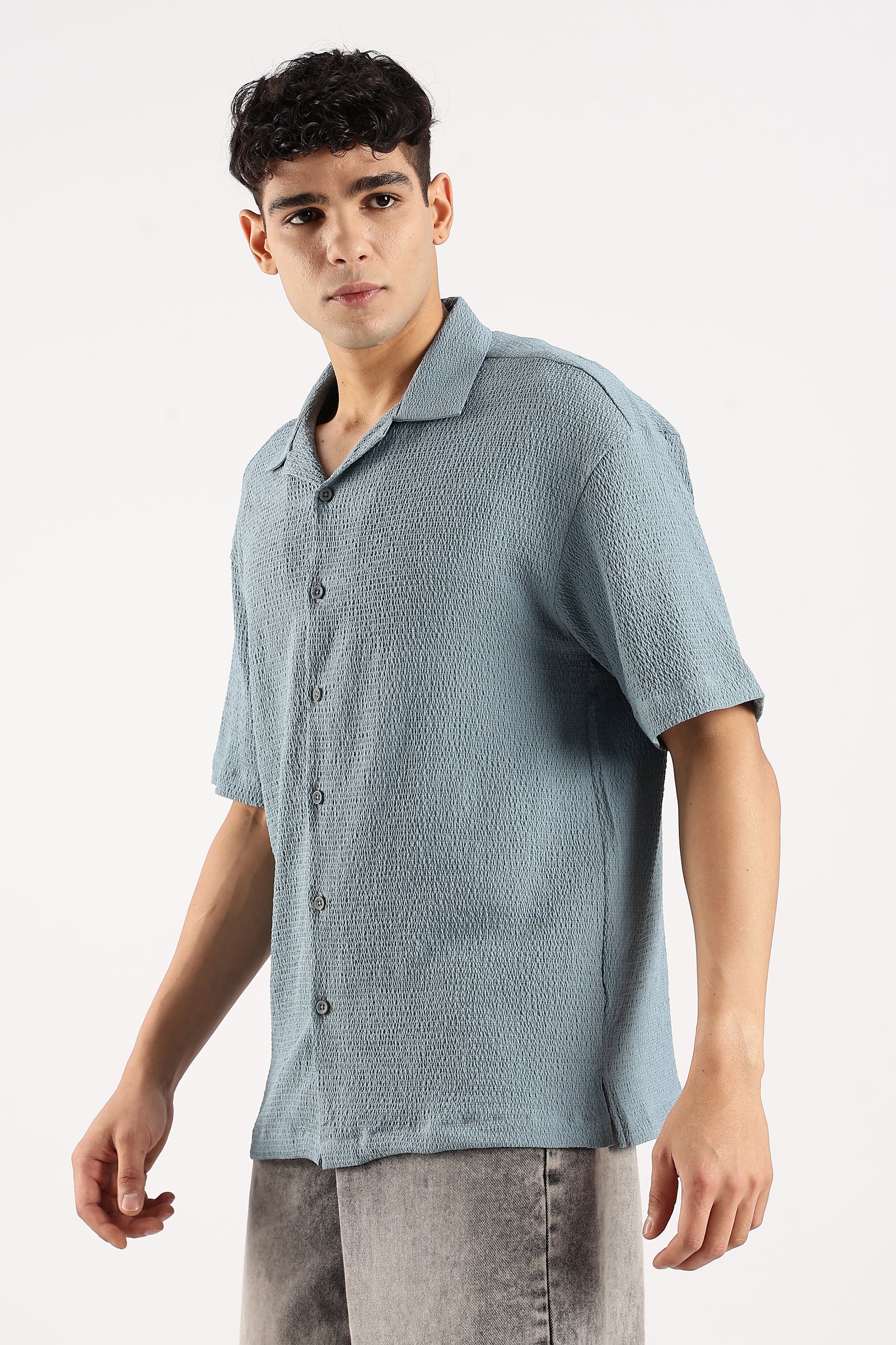 Effortless, light, and laid-back — this sky-blue oversized shirt is made for days that flow easy. Crafted from premium poly fabric with a unique textured finish, it delivers both comfort and character. The self-designed weave adds depth while keeping it breathable and cool against the skin.