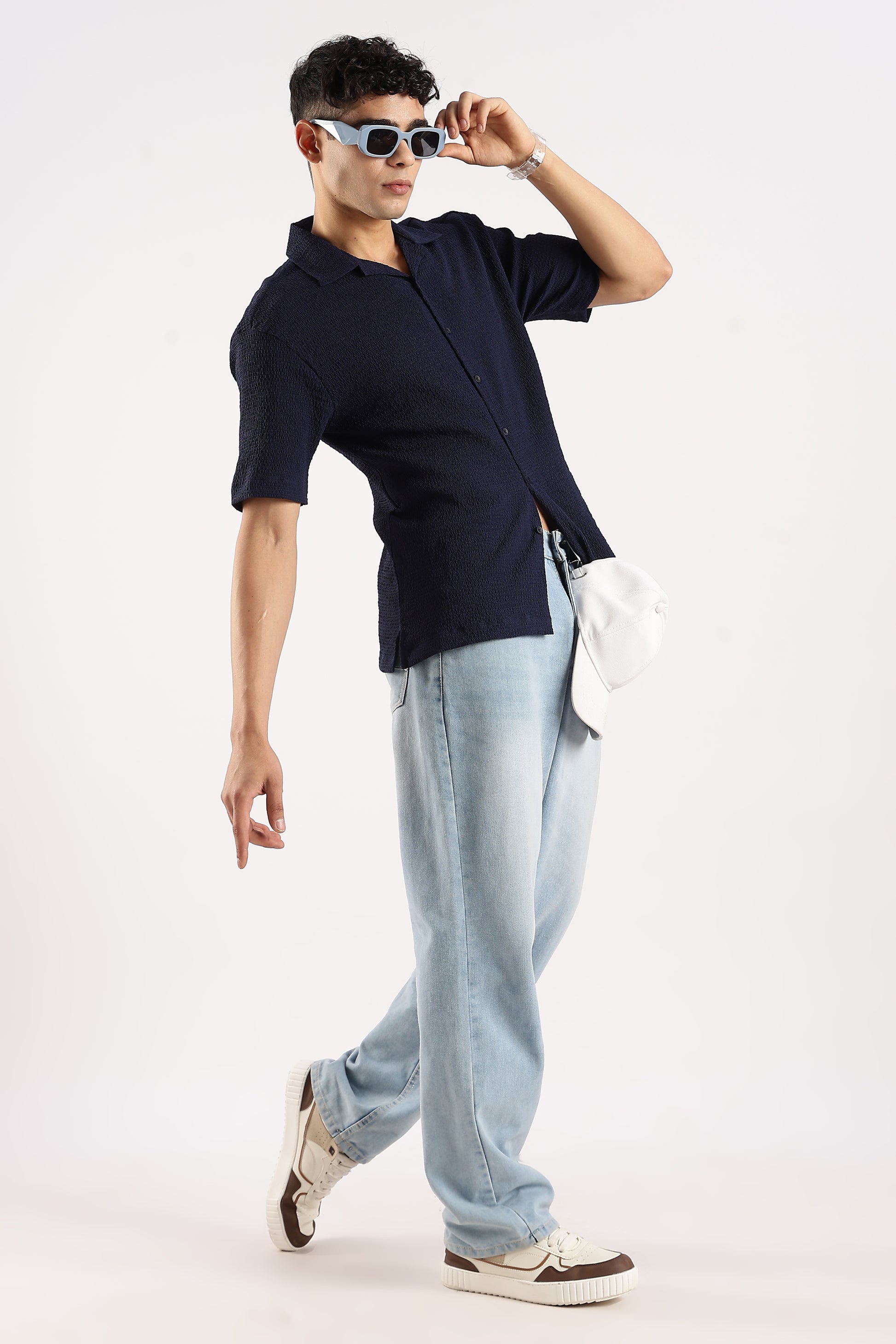 Effortless, light, and laid-back — this sky-blue oversized shirt is made for days that flow easy. Crafted from premium poly fabric with a unique textured finish, it delivers both comfort and character. The self-designed weave adds depth while keeping it breathable and cool against the skin.