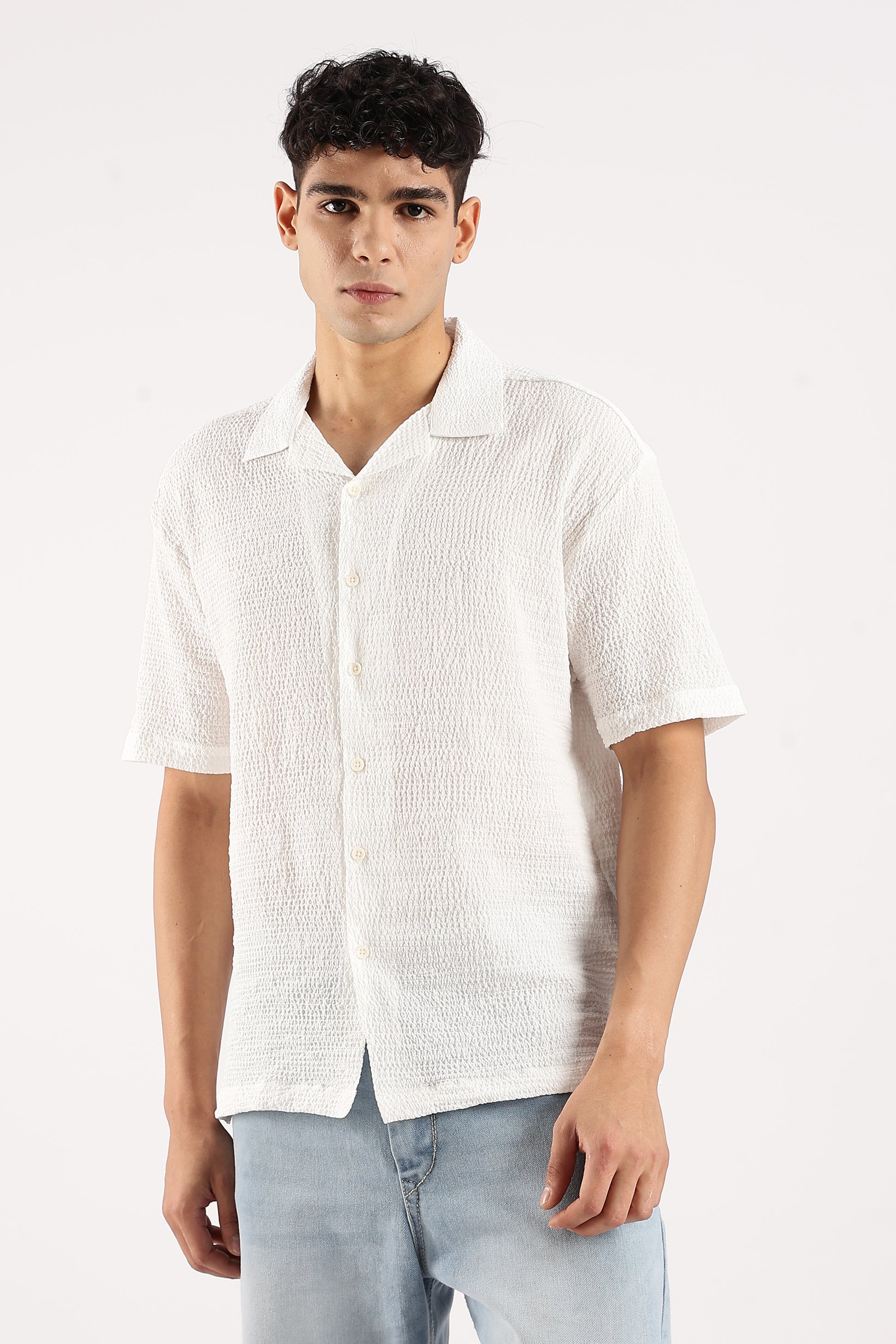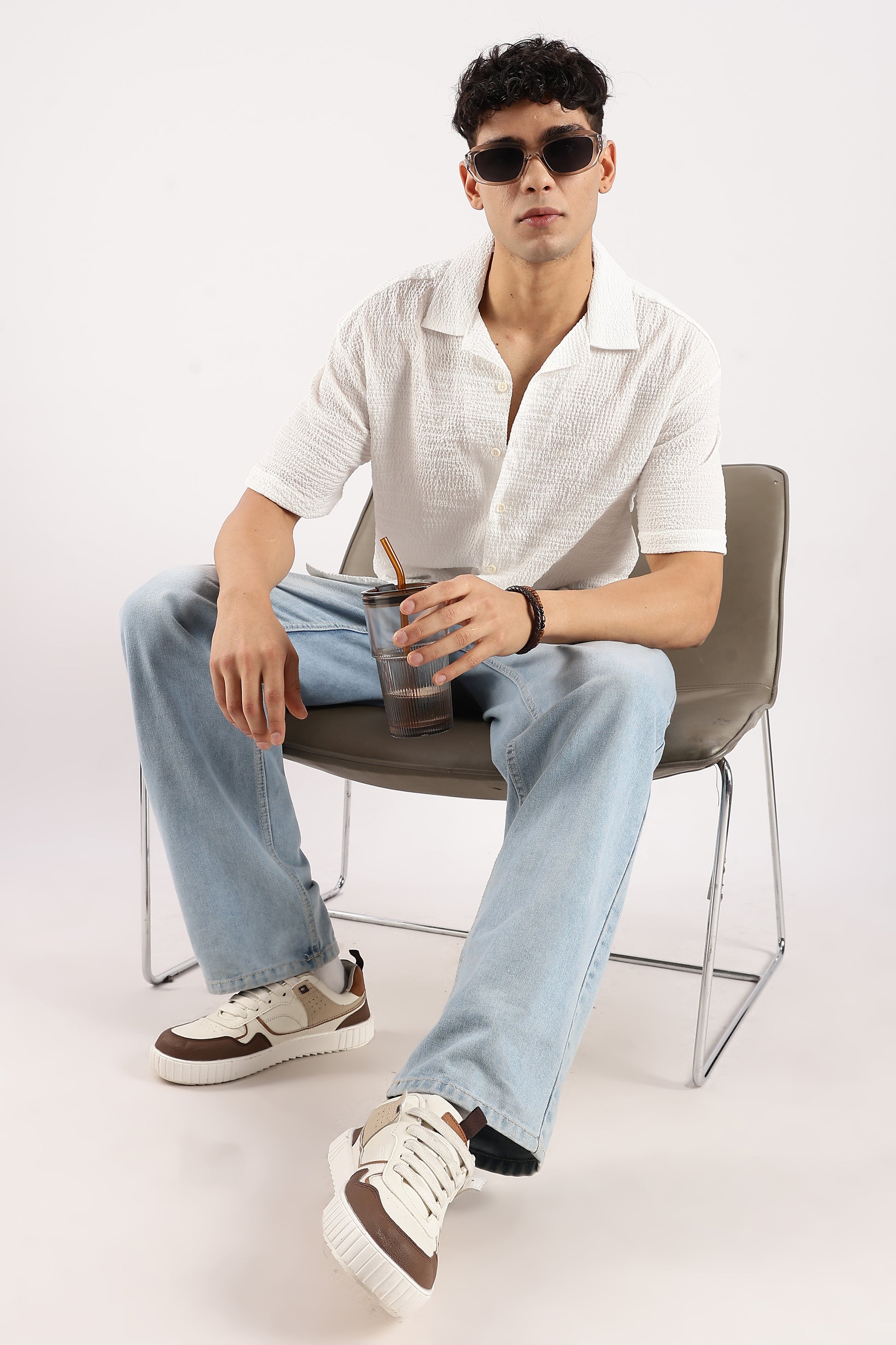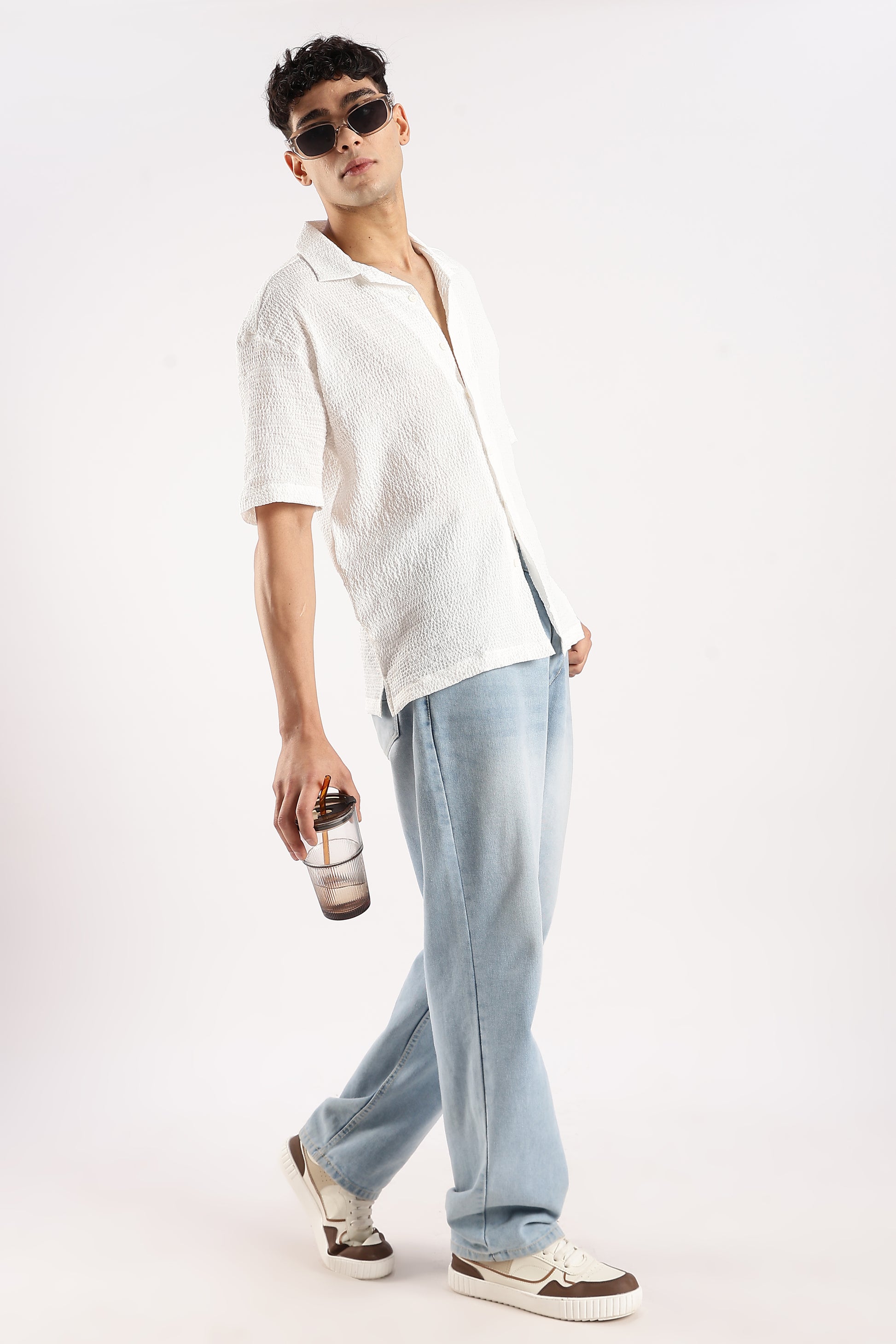 Effortless, light, and laid-back — this sky-blue oversized shirt is made for days that flow easy. Crafted from premium poly fabric with a unique textured finish, it delivers both comfort and character. The self-designed weave adds depth while keeping it breathable and cool against the skin.