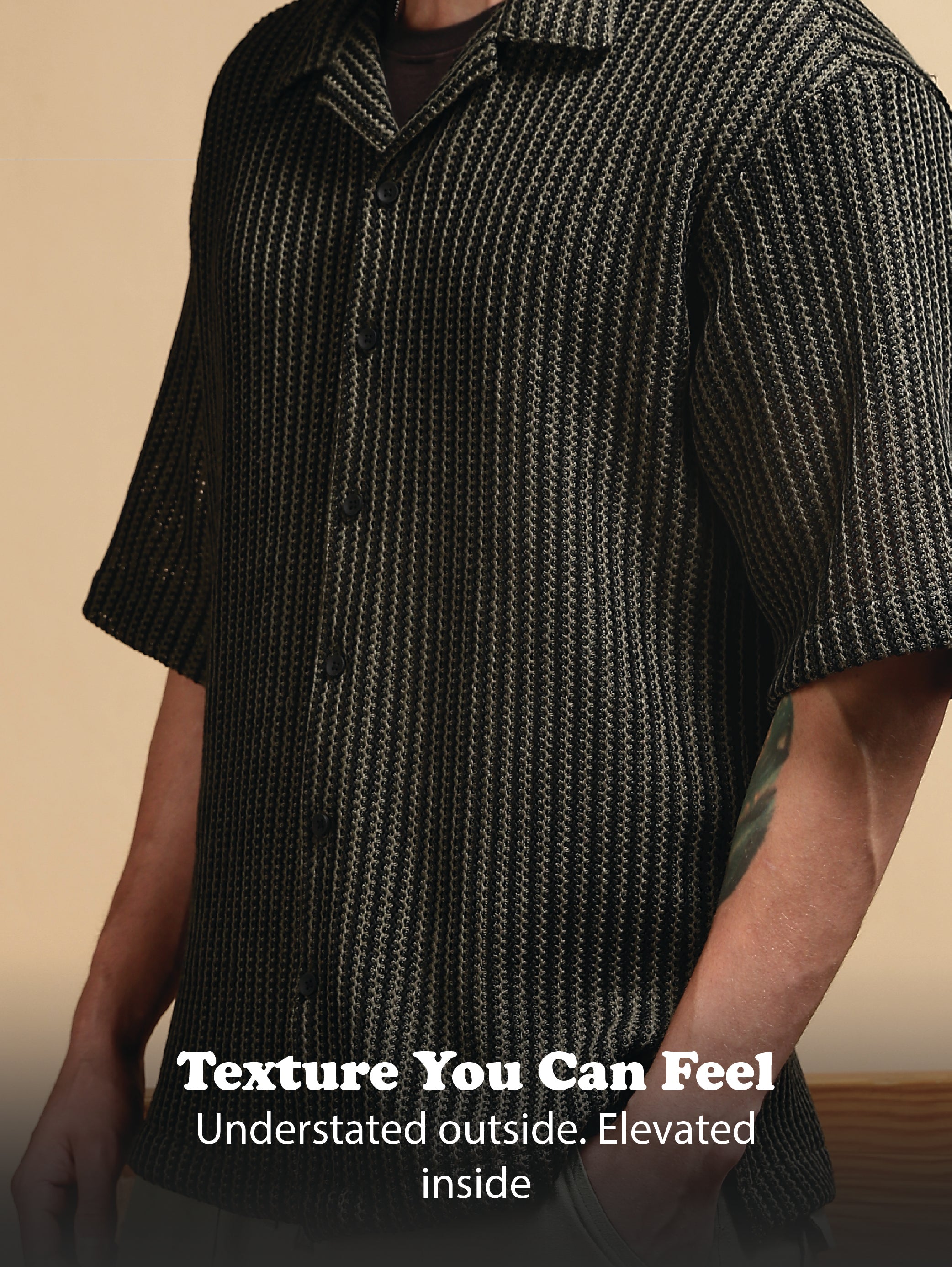 Refresh your wardrobe with this relaxed-fit shirt, crafted in soft polyester for lightweight comfort and breathability. Featuring a unique self-designed textured weave, it blends minimalism with modern detail. The half sleeves and button-down front make it an easy, versatile choice for casual outings.
