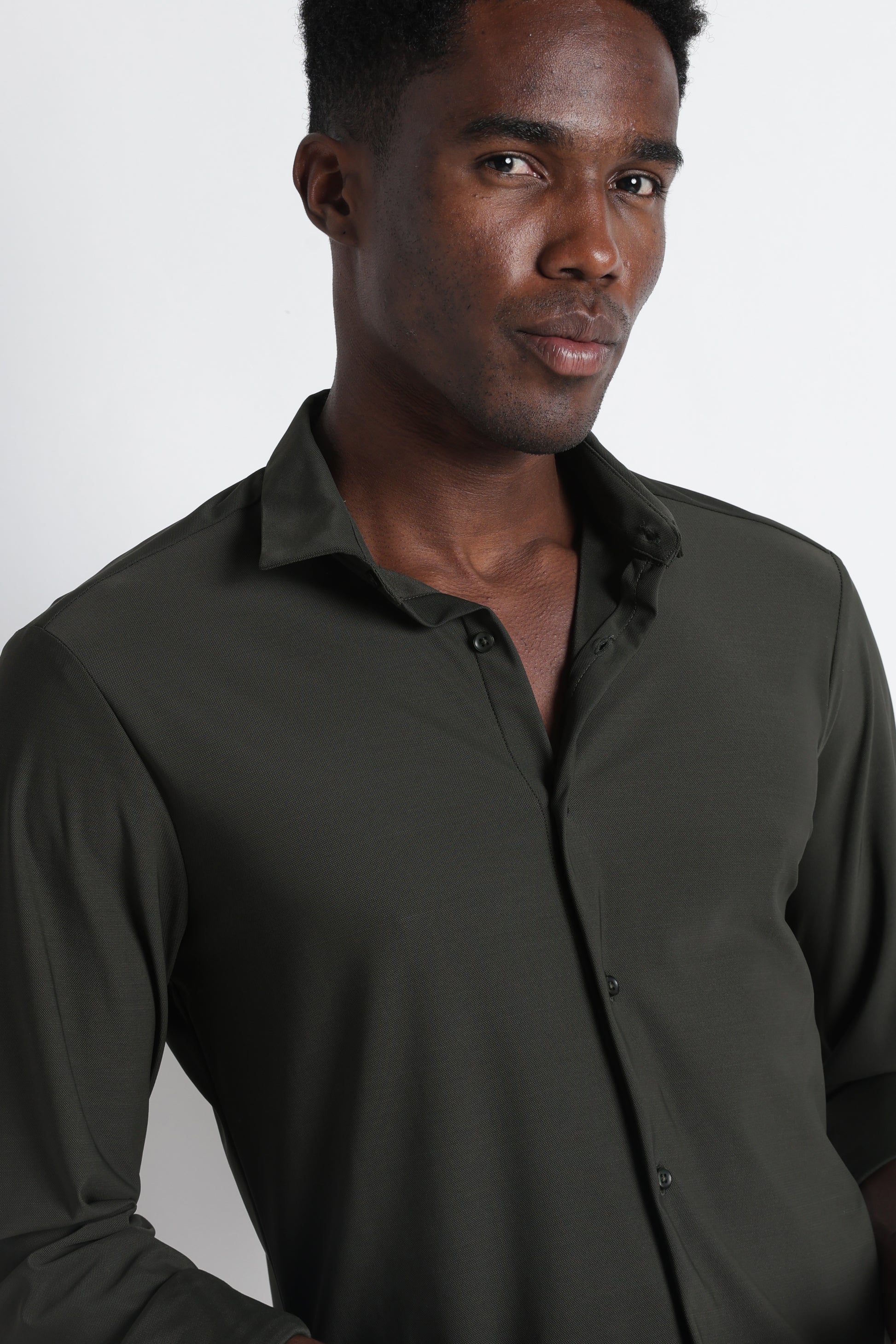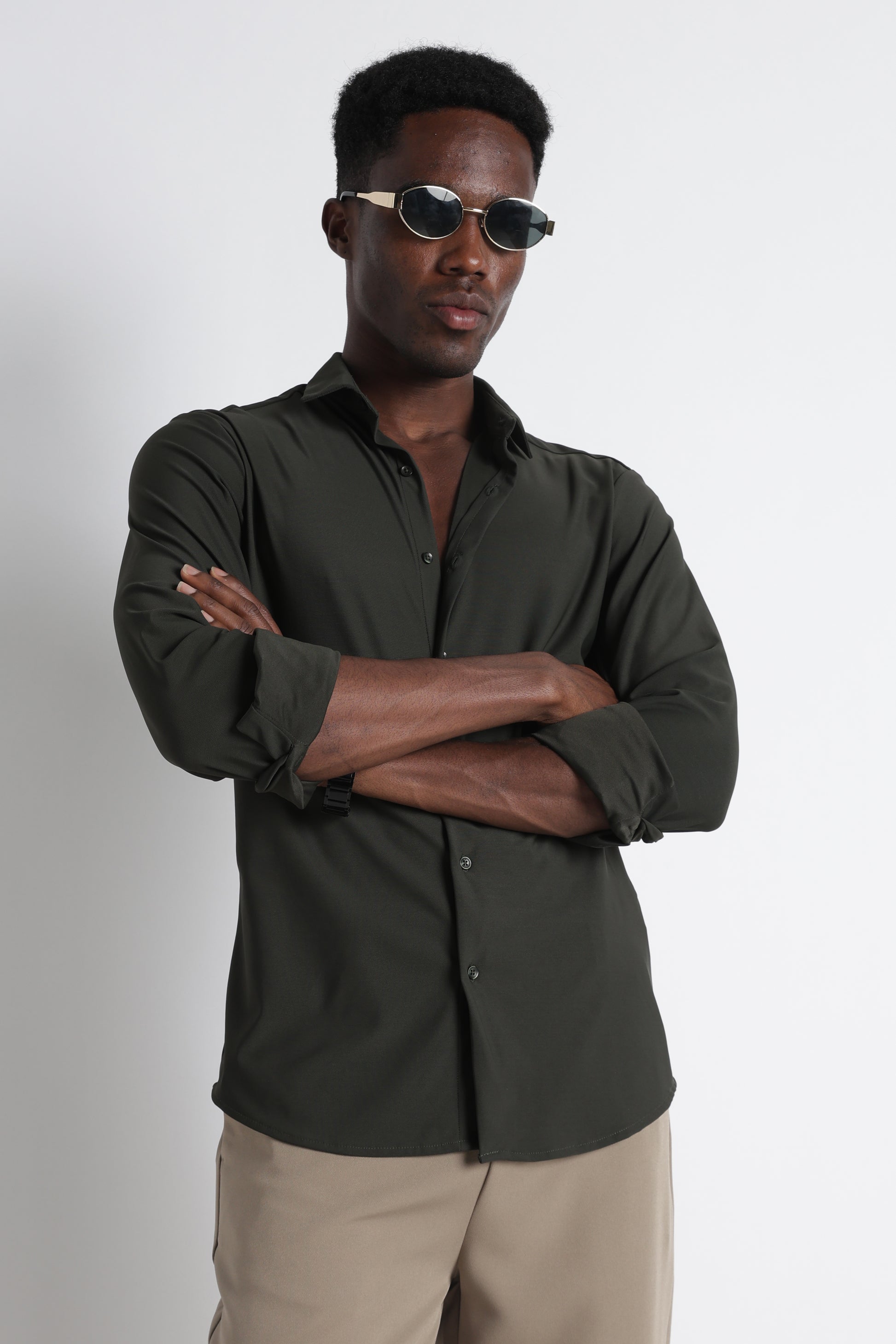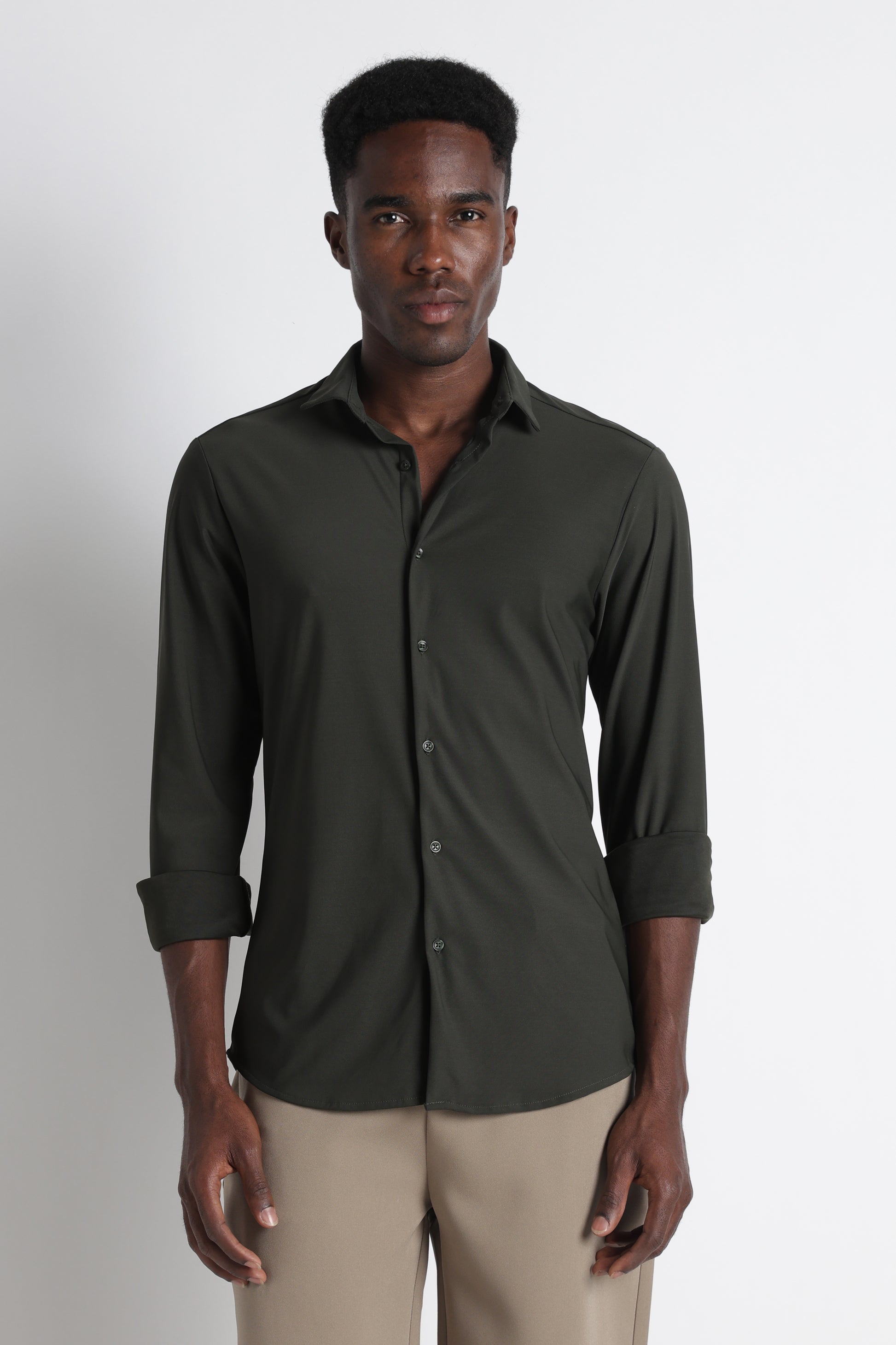 Designed with a slim fit, the shirt sits close to the body without feeling restrictive, making it ideal for long wear. The smooth, pocket-free front keeps the design minimal and elevated, while full sleeves and a refined spread collar add versatility—easy to dress up or down.