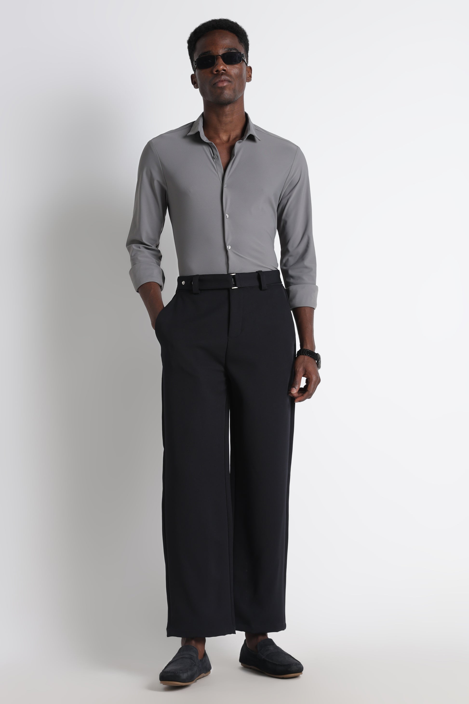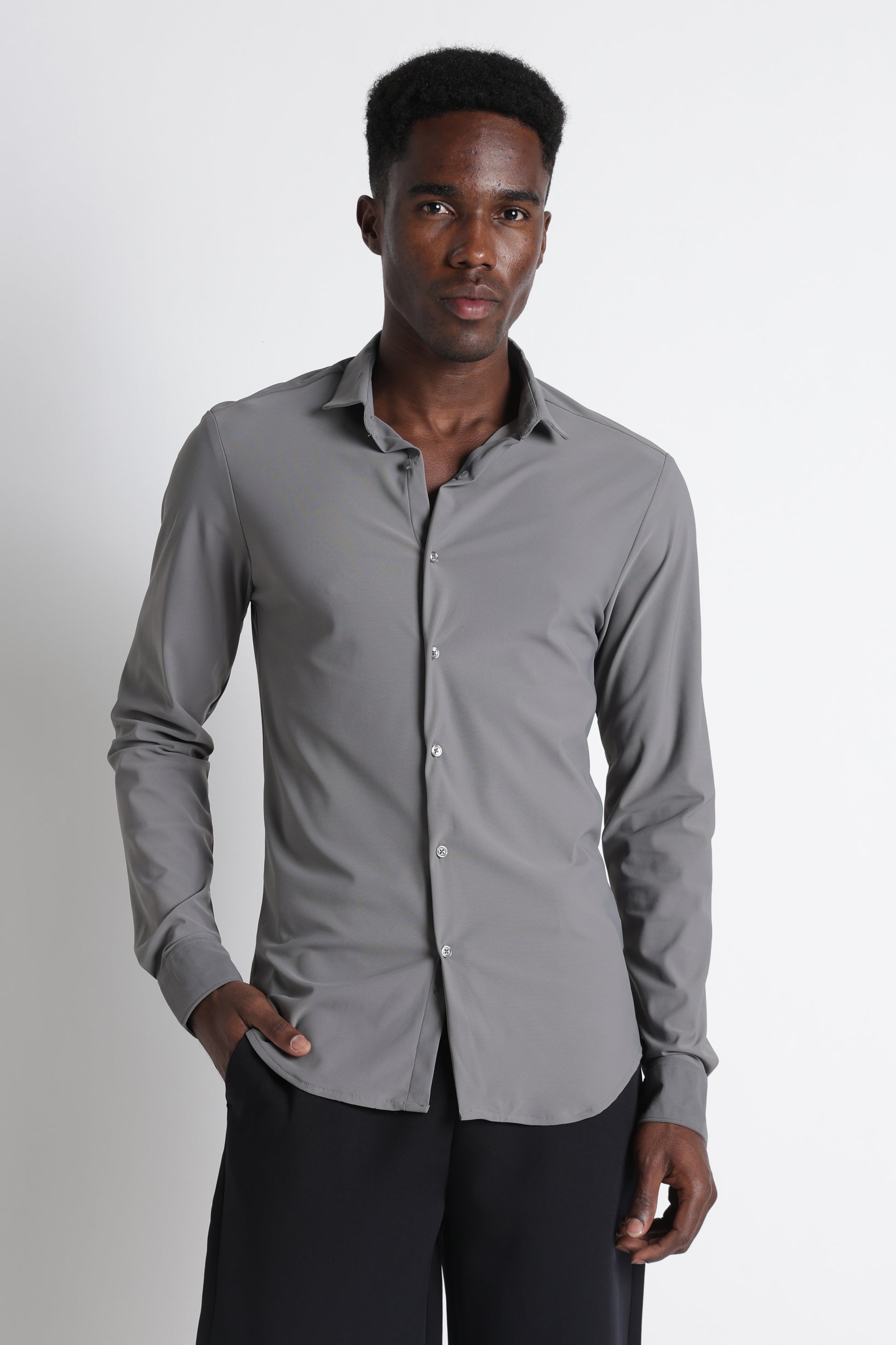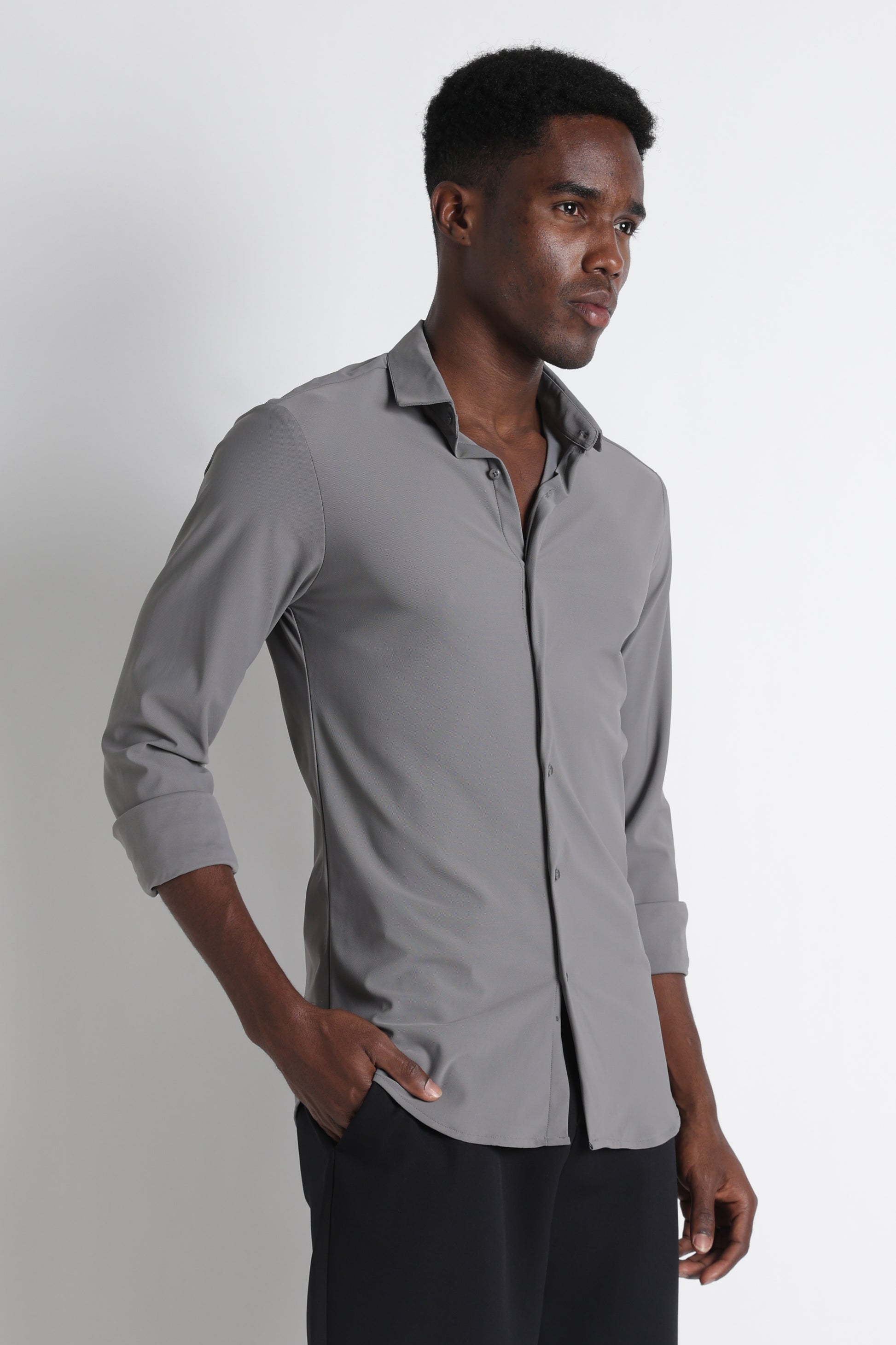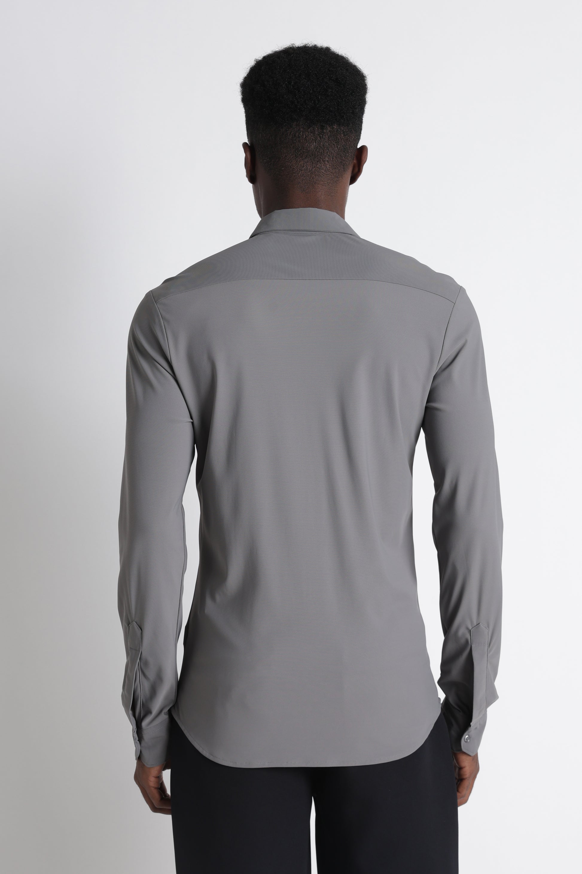 Designed with a slim fit, the shirt sits close to the body without feeling restrictive, making it ideal for long wear. The smooth, pocket-free front keeps the design minimal and elevated, while full sleeves and a refined spread collar add versatility—easy to dress up or down.