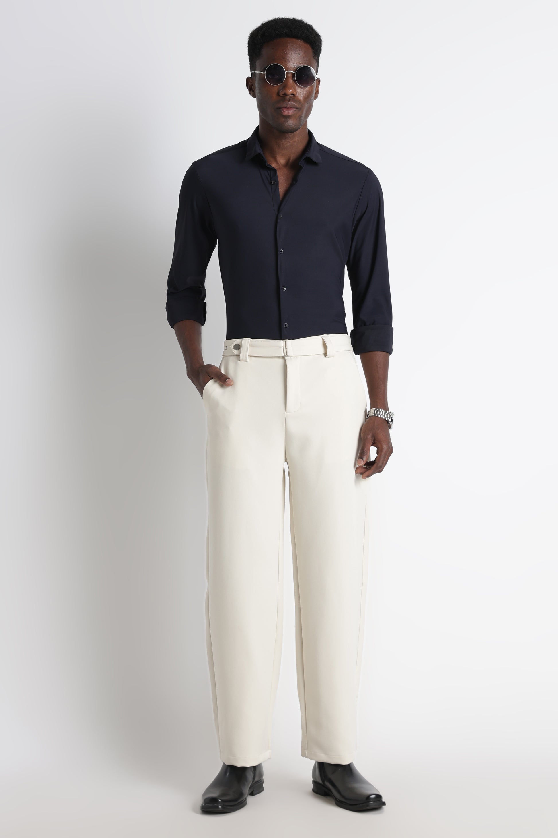 Designed with a slim fit, the shirt sits close to the body without feeling restrictive, making it ideal for long wear. The smooth, pocket-free front keeps the design minimal and elevated, while full sleeves and a refined spread collar add versatility—easy to dress up or down.