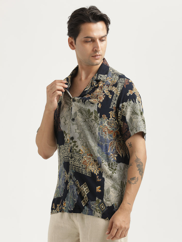 This half-sleeve shirt in soft viscose-rayon blends floral and geometric motifs on a deep black base. Lightweight, slim-fit, and pocket-free — it's your go-to for standout summer style with zero effort.
