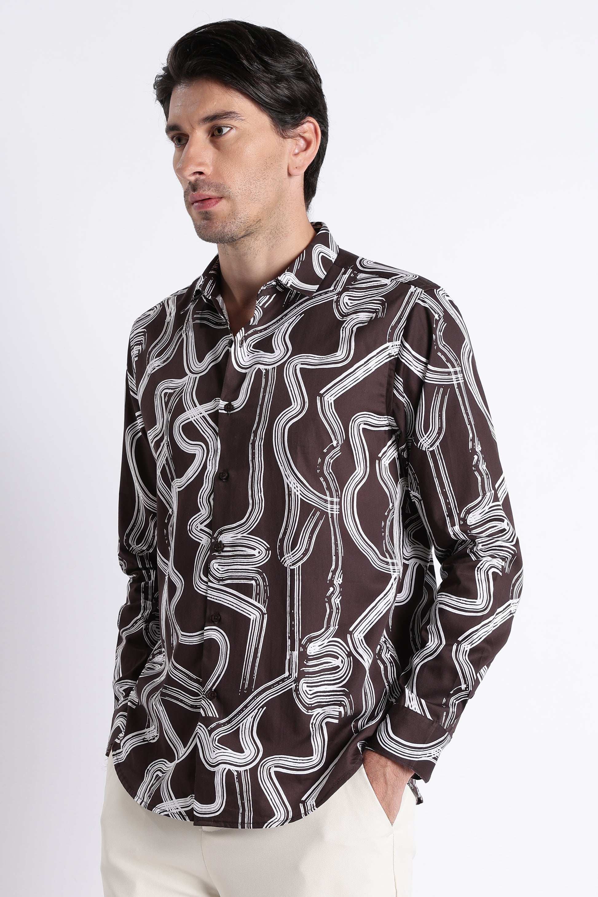 Make a statement without raising your voice. This slim fit printed shirt is crafted from premium cotton satin with digital print, giving it a smooth hand feel with a subtle sheen that elevates the overall look. The fabric drapes cleanly on the body while maintaining structure, making it ideal for refined casual styling.