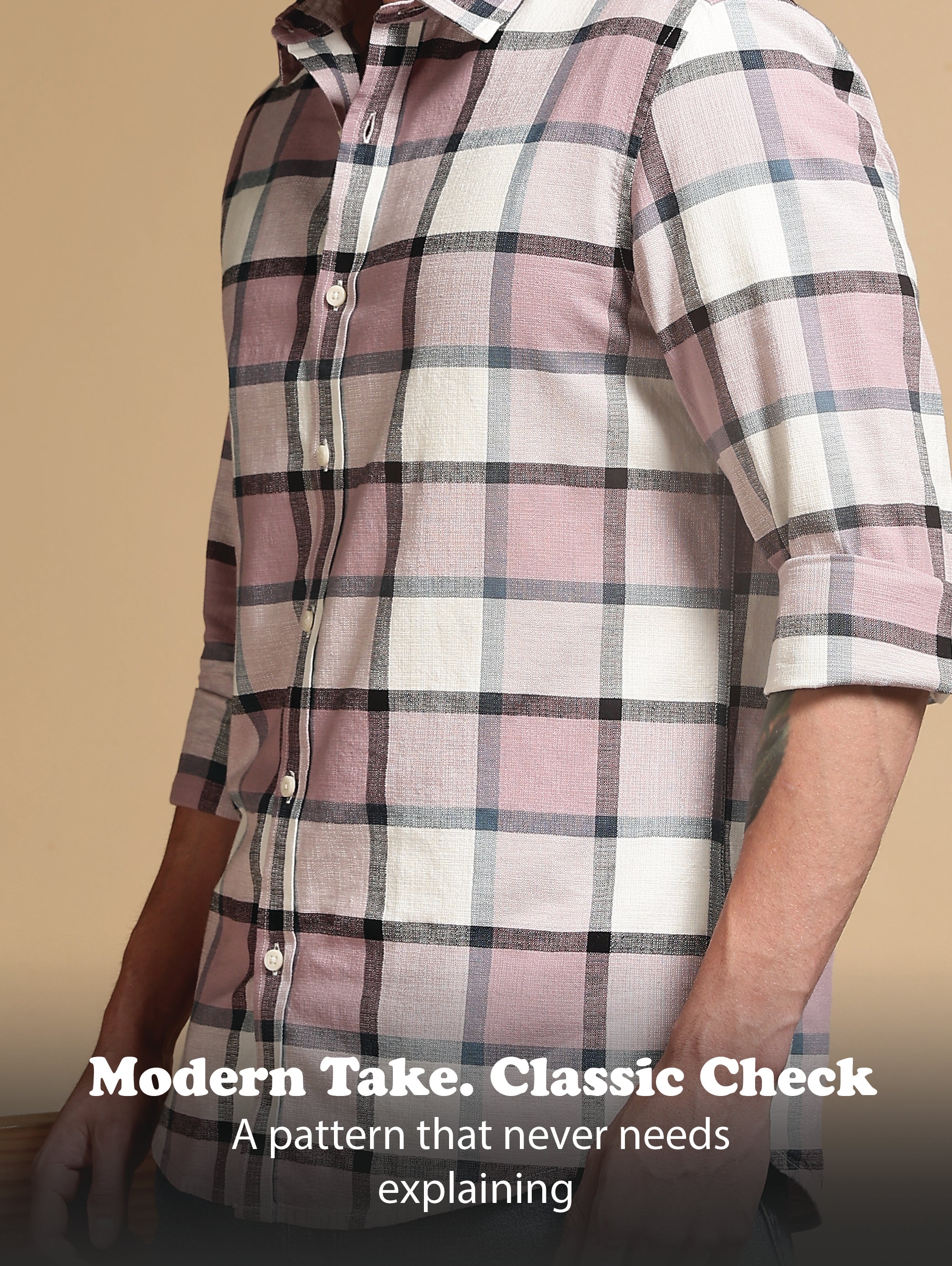 Keep it classic yet contemporary with this slim-fit check shirt, crafted from 100% cotton for breathability and everyday comfort. Designed with a timeless check pattern, this shirt is an easy wardrobe staple that balances versatility with effortless style.