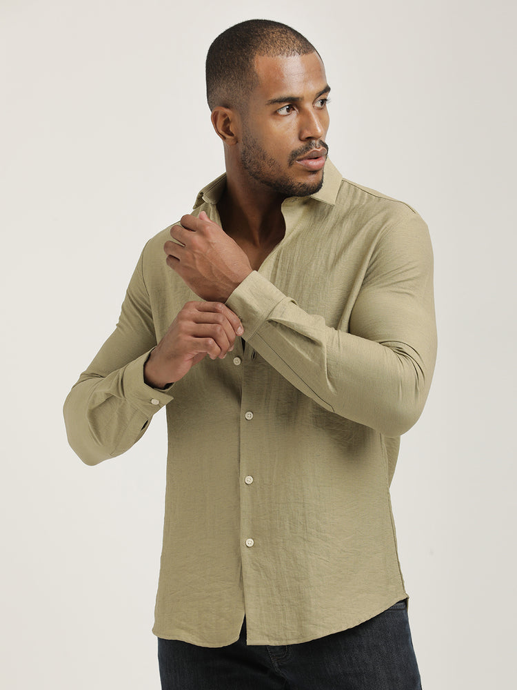 Slim Fit Nylon Shirt with Linen Look Khaki
