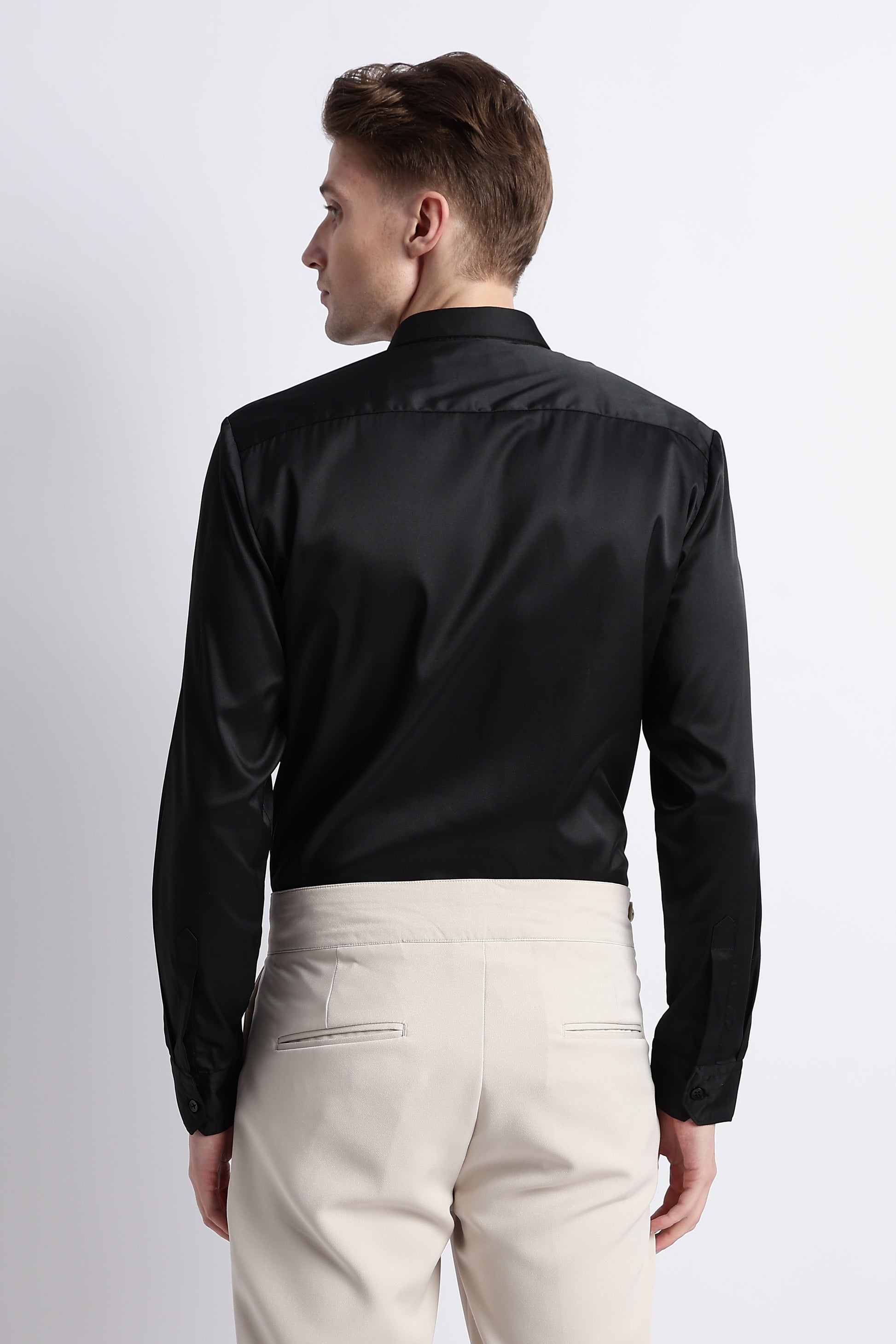 Smooth. Sleek. Subtle. This Black shirt, crafted from soft poly satin, offers a gentle sheen that feels as refined as it looks. Designed in a slim fit with a clean, pocket-free silhouette — it’s a statement of quiet confidence for evenings or effortless dressing.