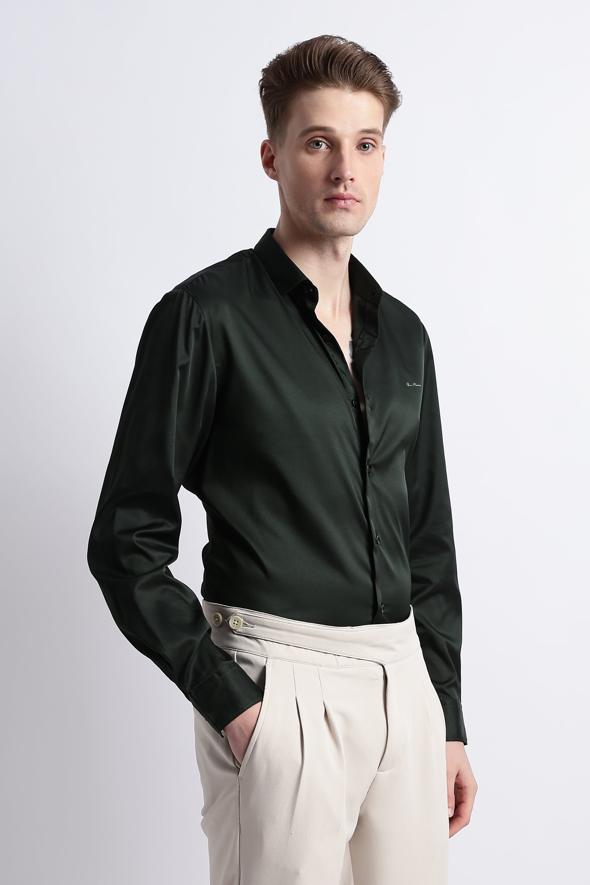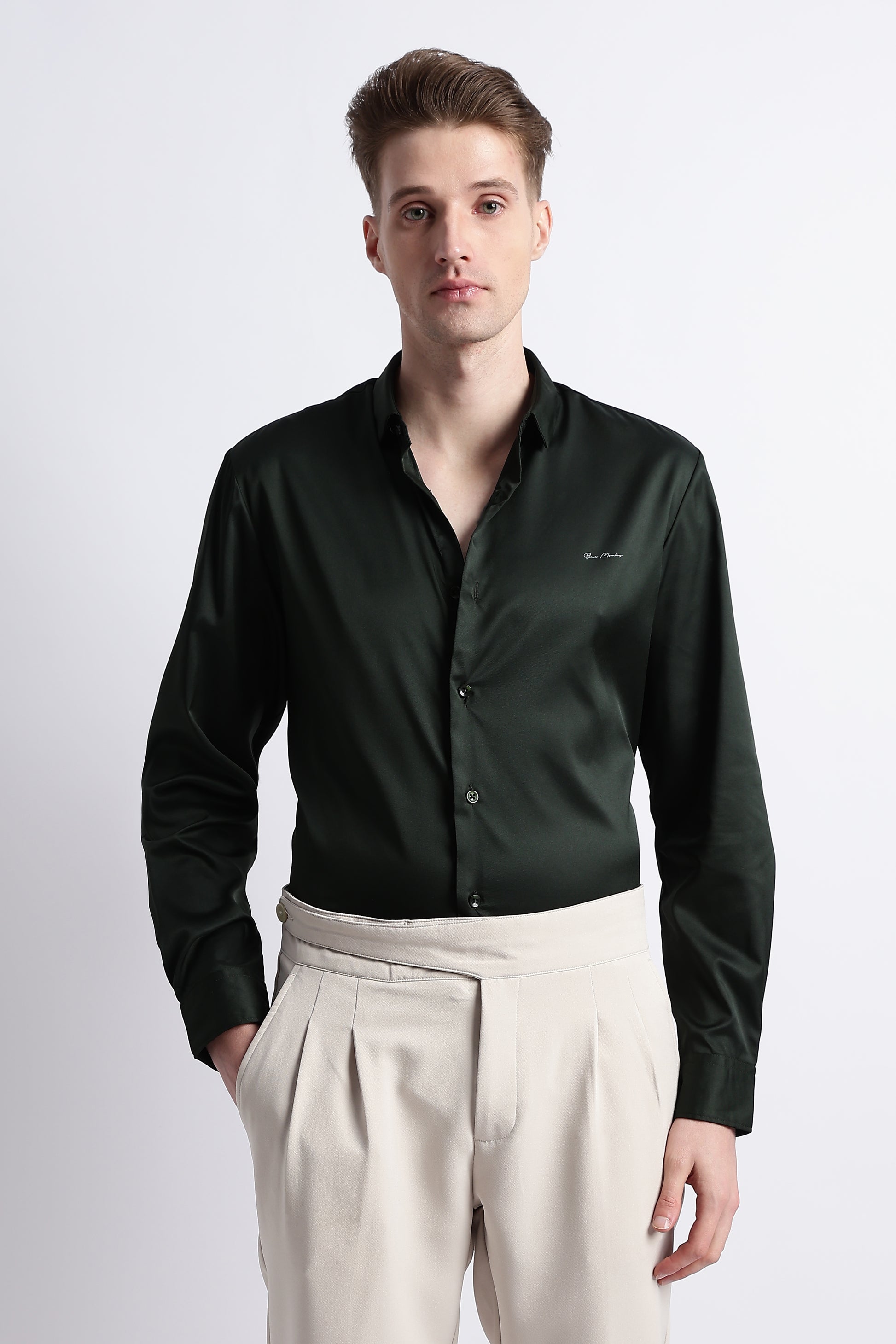 Smooth. Sleek. Subtle. This Green shirt, crafted from soft poly satin, offers a gentle sheen that feels as refined as it looks. Designed in a slim fit with a clean, pocket-free silhouette — it’s a statement of quiet confidence for evenings or effortless dressing.