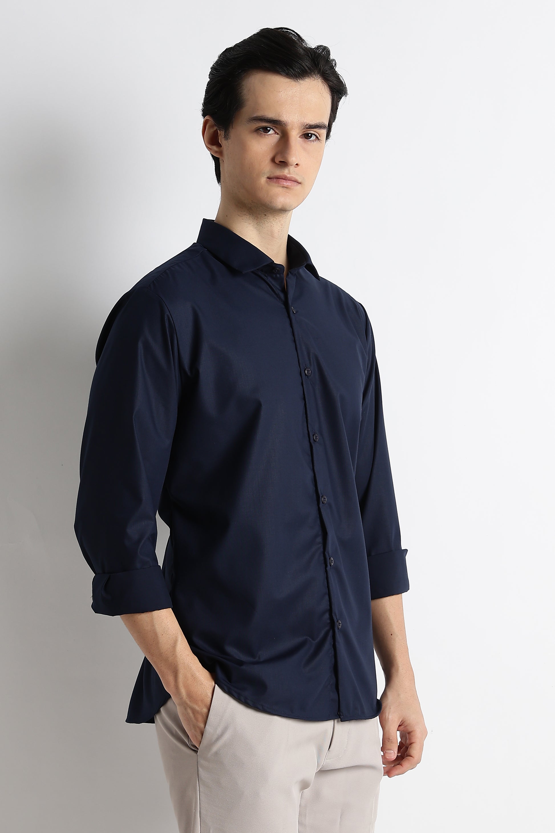 This Navy poly shirt is crafted using a refined liquid finish that delivers a soft, silky hand feel while maintaining structure and durability. Designed in a clean slim-fit silhouette, it drapes neatly on the body—offering all-day comfort without losing its shape.