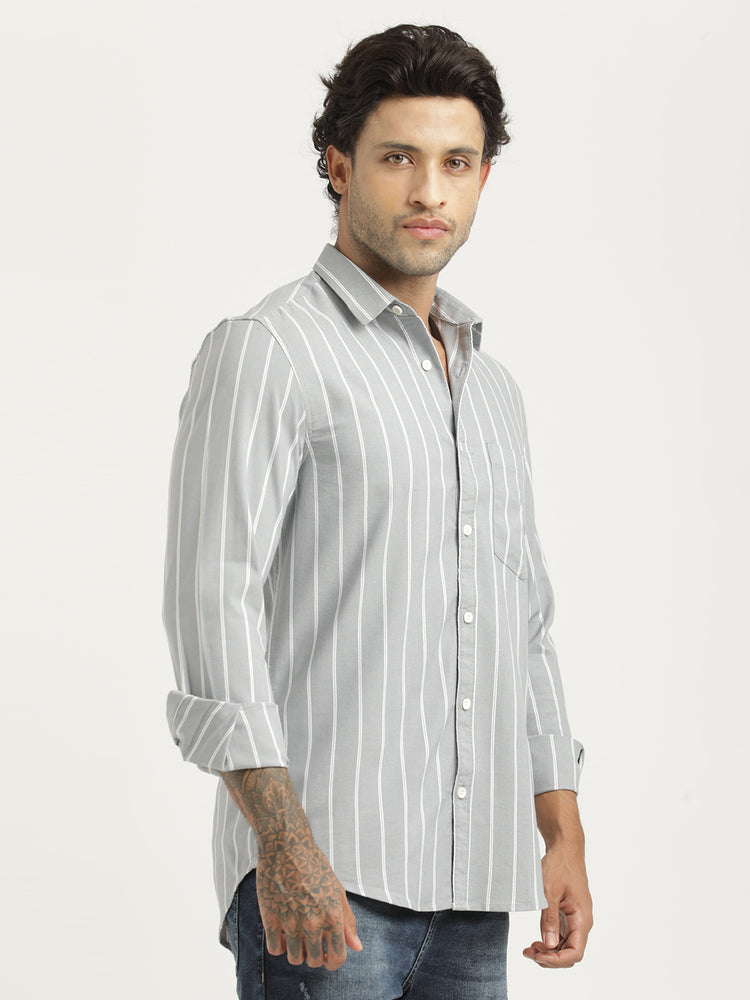 Crafted in breathable Oxford Lycra, this slim-fit shirt features bold vertical stripes that add an edge to your everyday style. Designed with a single chest pocket and full sleeves, it blends comfort with a casual-smart appeal—perfect for both weekday hangs and weekend scenes.