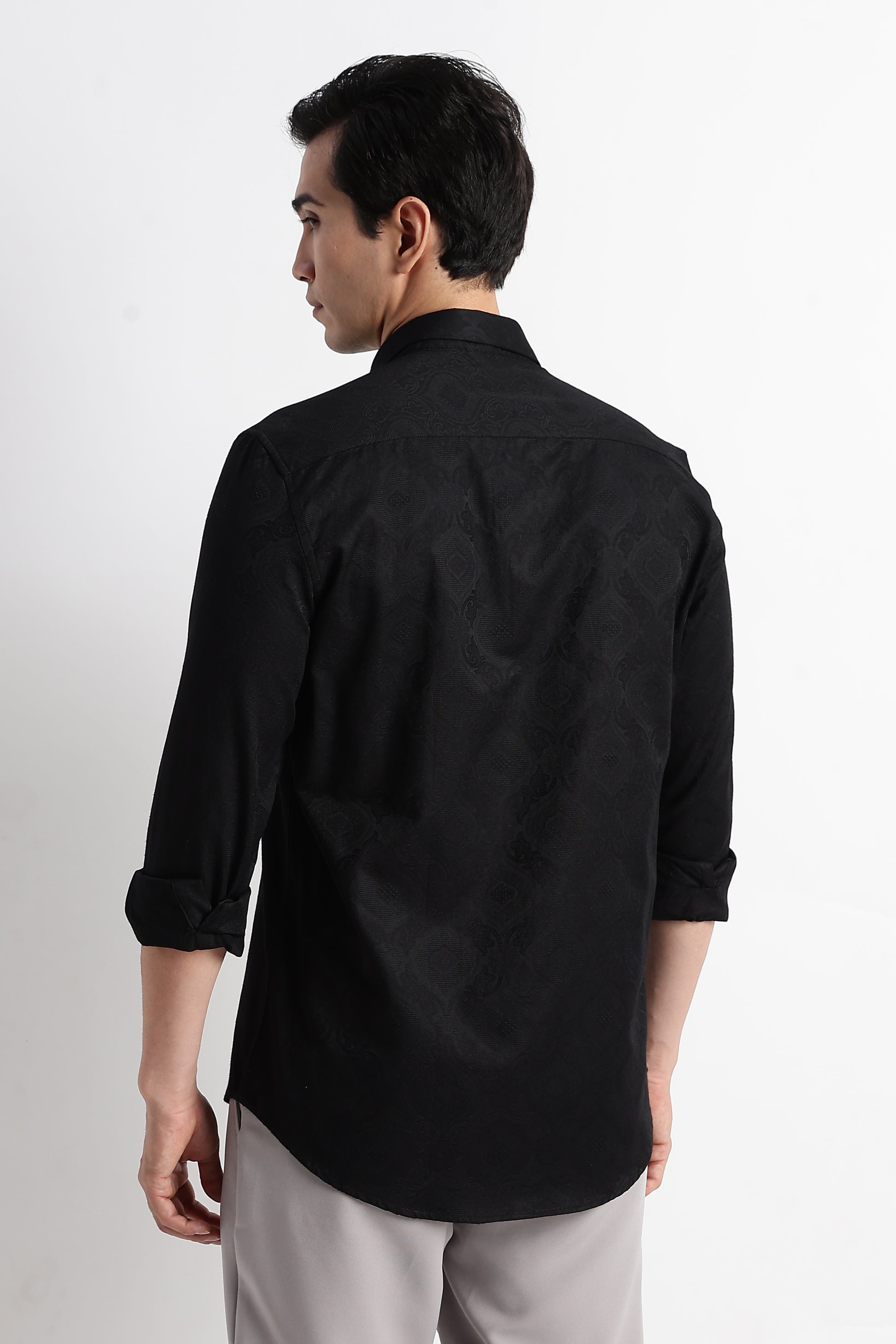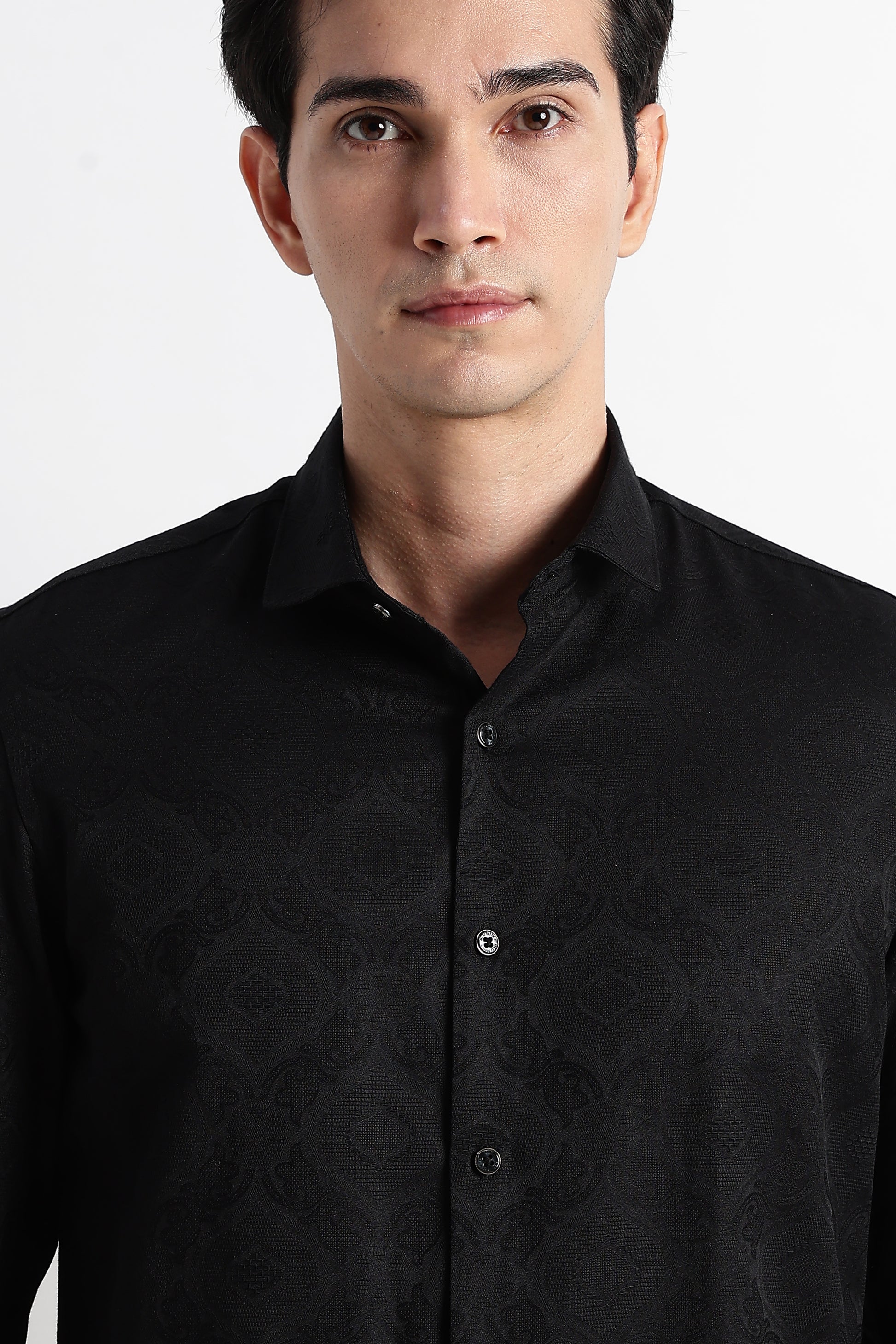 This Deep Black Self Jacquard Shirt is crafted with an intricate woven texture that elevates the classic solid shirt into something richer, more refined. The subtle pattern catches light without feeling loud, making it perfect for men who appreciate understated luxury.