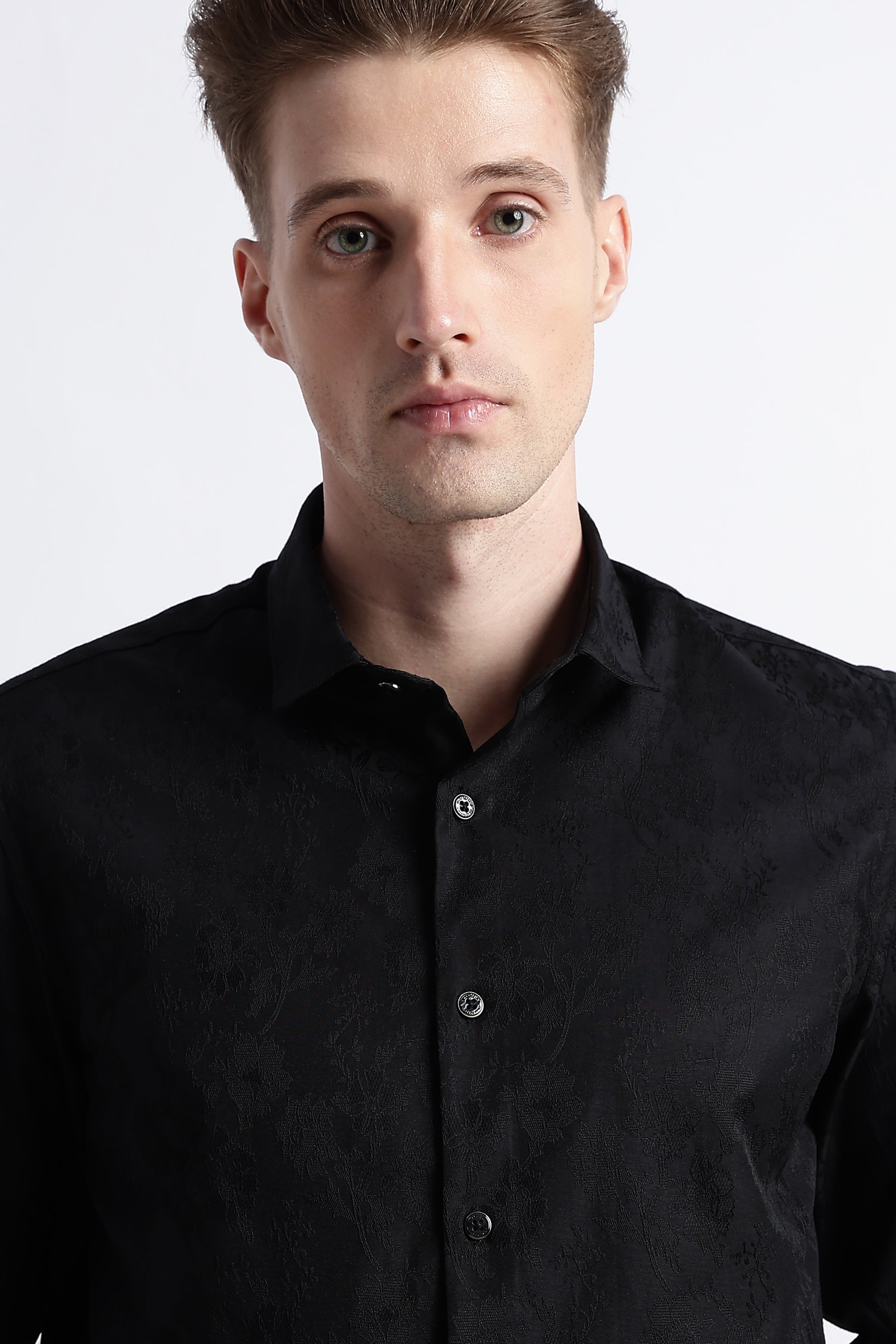 This Deep Black Self Jacquard Shirt is crafted with an intricate woven texture that elevates the classic solid shirt into something richer, more refined. The subtle pattern catches light without feeling loud, making it perfect for men who appreciate understated luxury.
