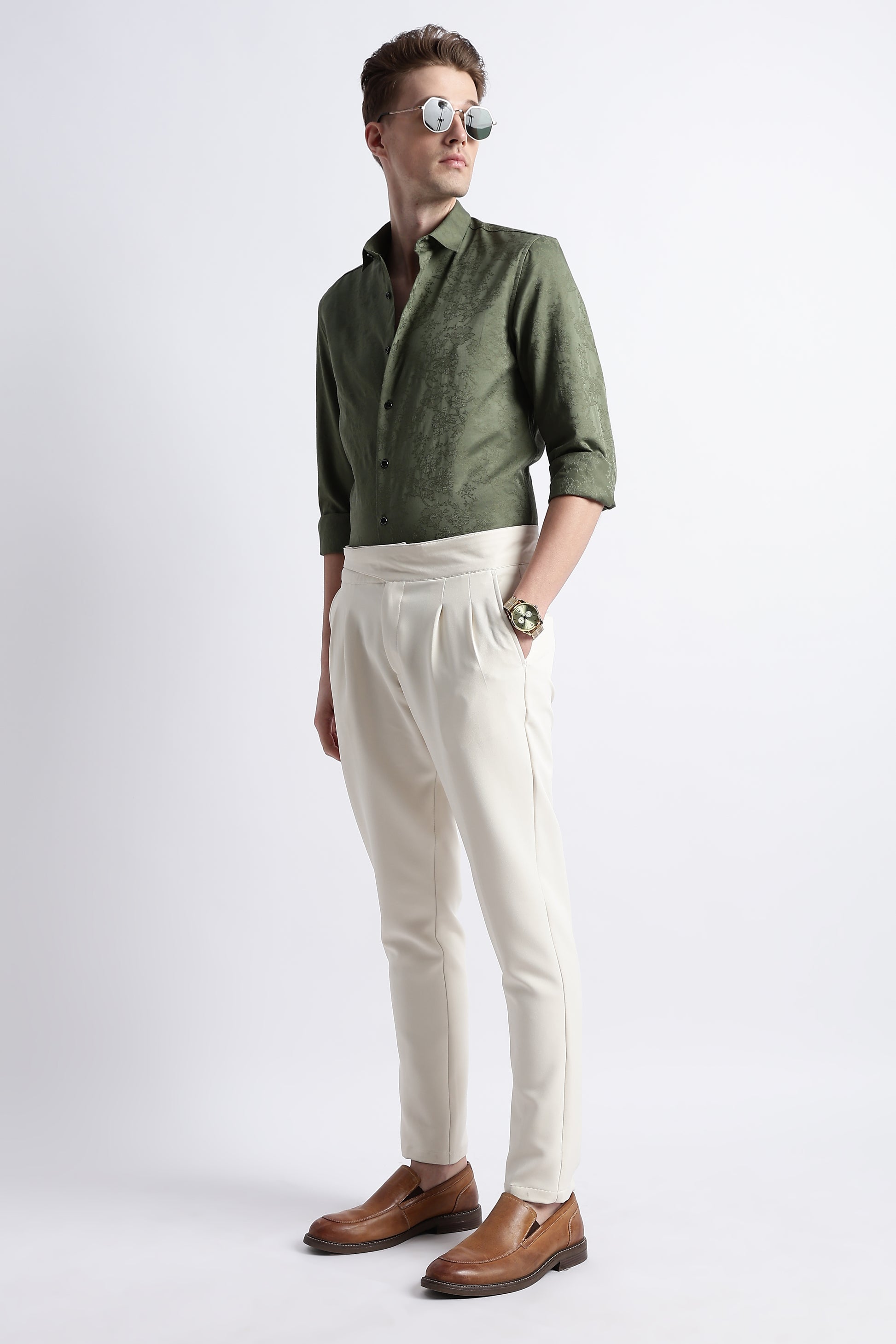 This Deep Green Self Jacquard Shirt is crafted with an intricate woven texture that elevates the classic solid shirt into something richer, more refined. The subtle pattern catches light without feeling loud, making it perfect for men who appreciate understated luxury.