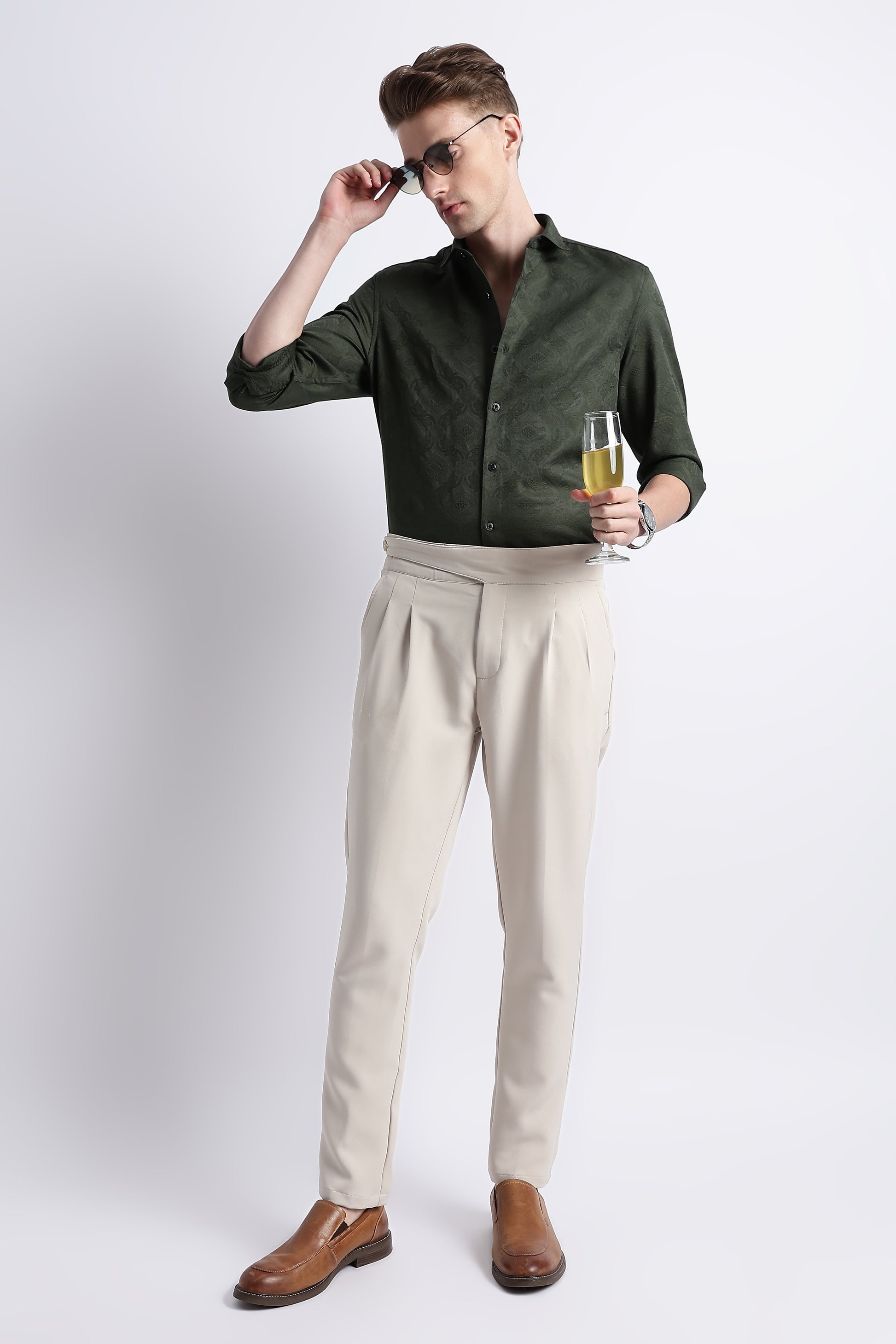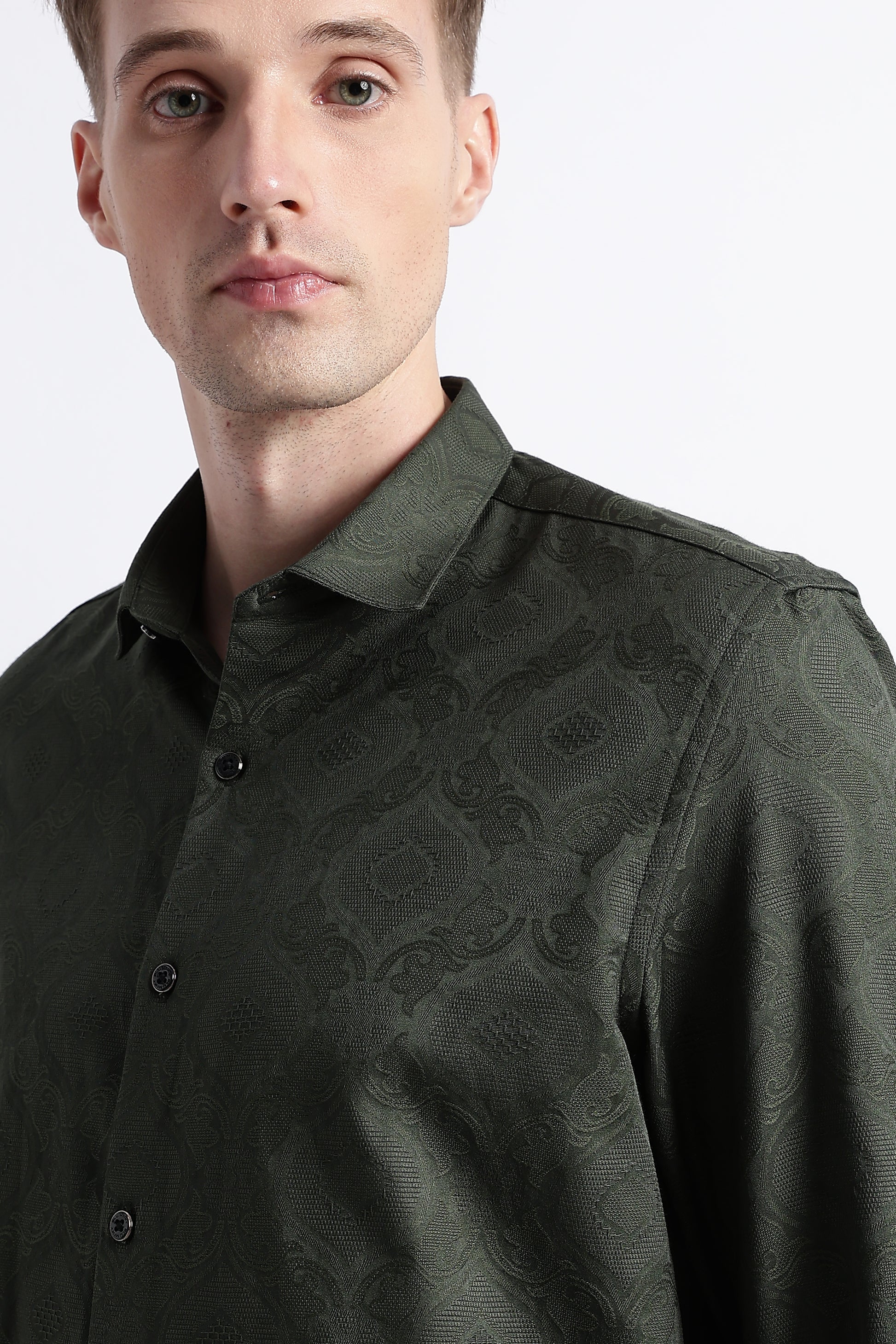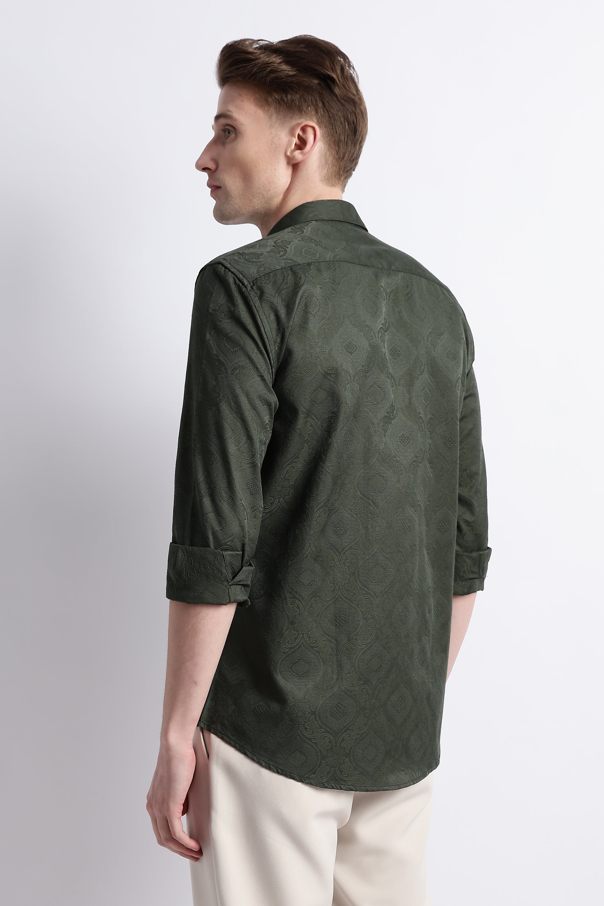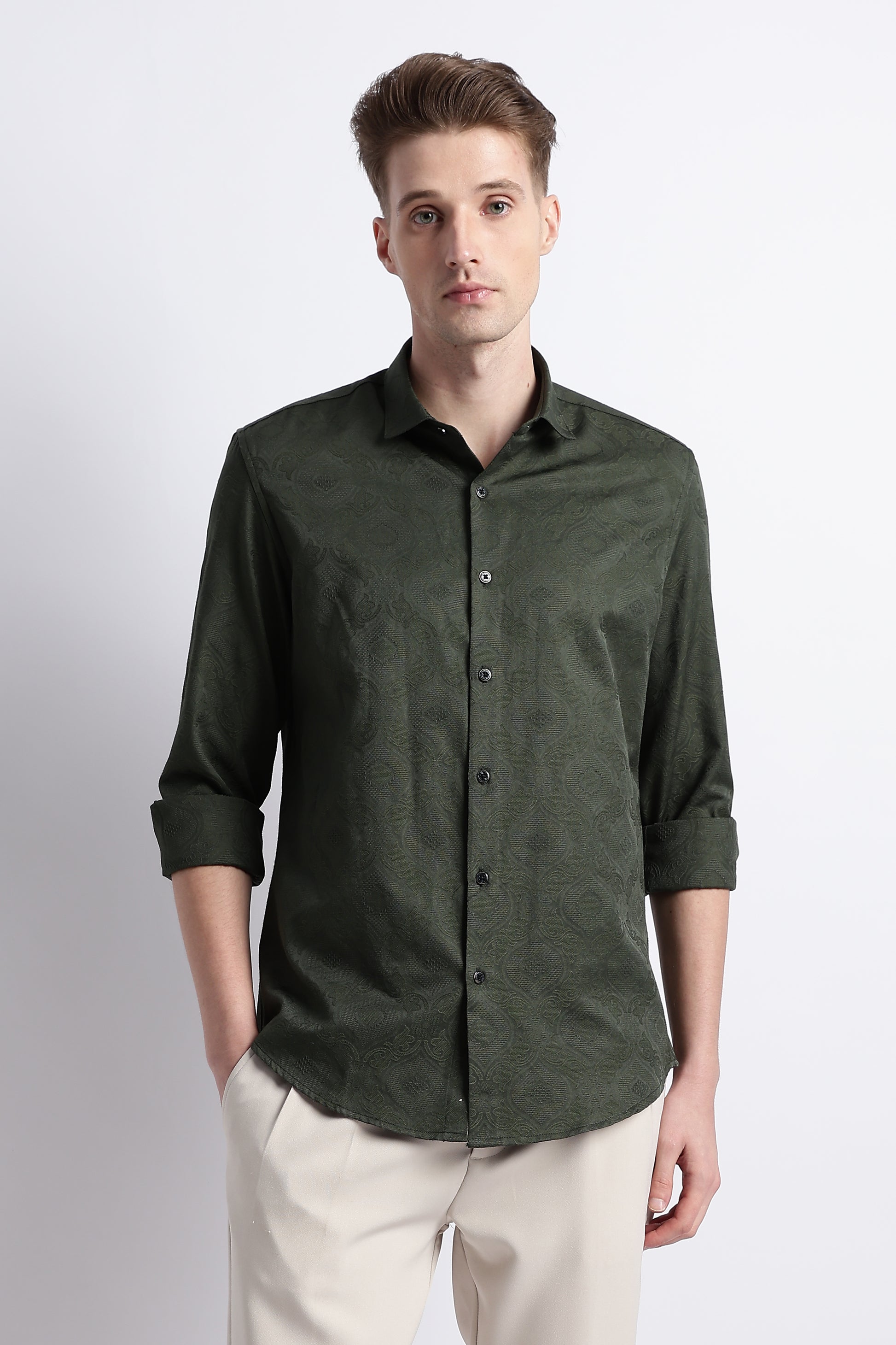 This Deep Olive Self Jacquard Shirt is crafted with an intricate woven texture that elevates the classic solid shirt into something richer, more refined. The subtle pattern catches light without feeling loud, making it perfect for men who appreciate understated luxury.