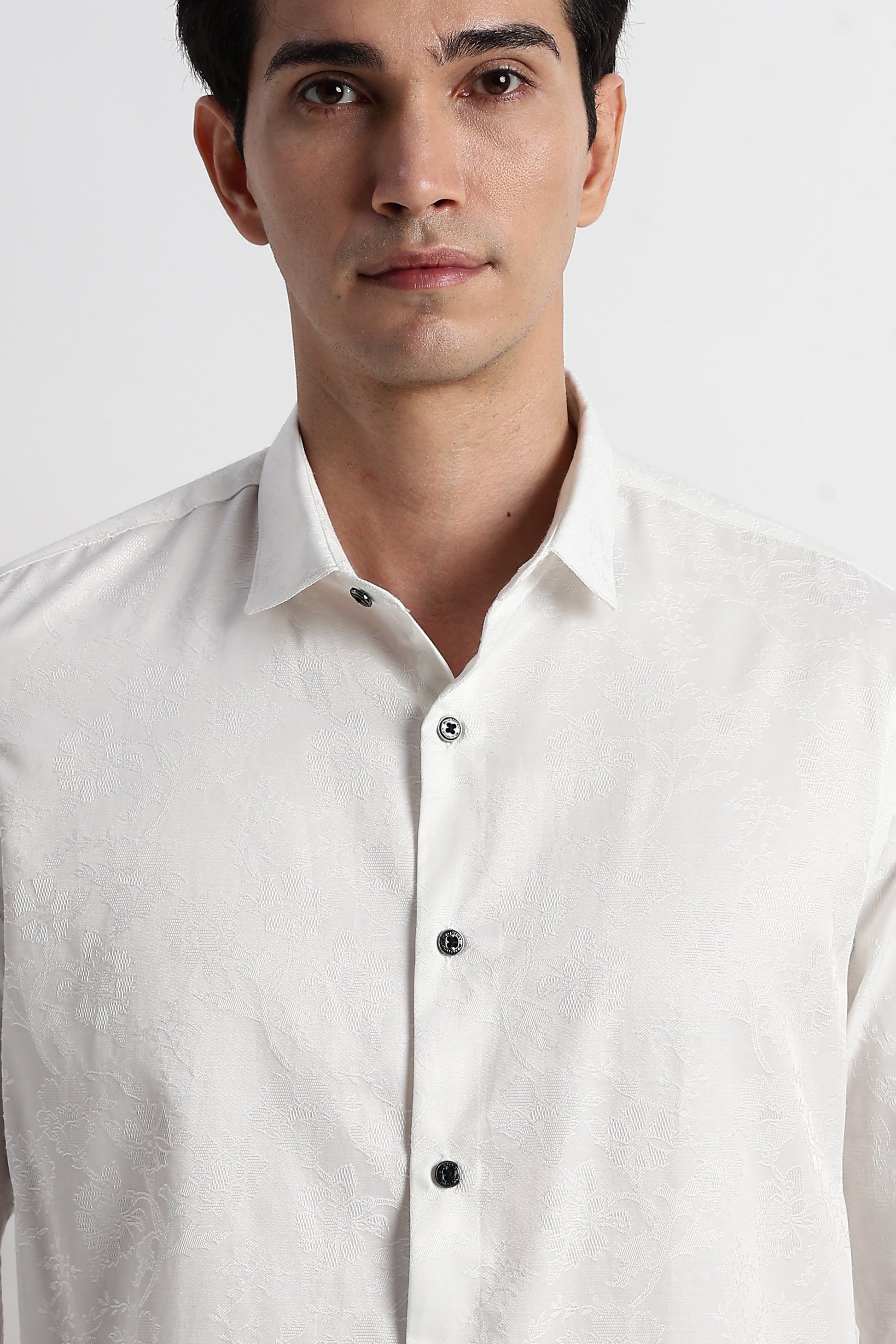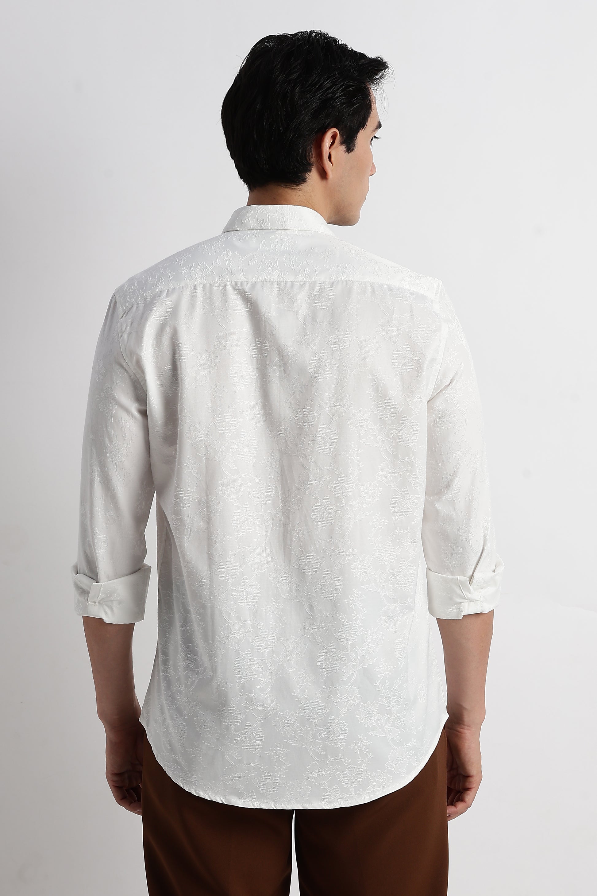 This Deep White Self Jacquard Shirt is crafted with an intricate woven texture that elevates the classic solid shirt into something richer, more refined. The subtle pattern catches light without feeling loud, making it perfect for men who appreciate understated luxury.