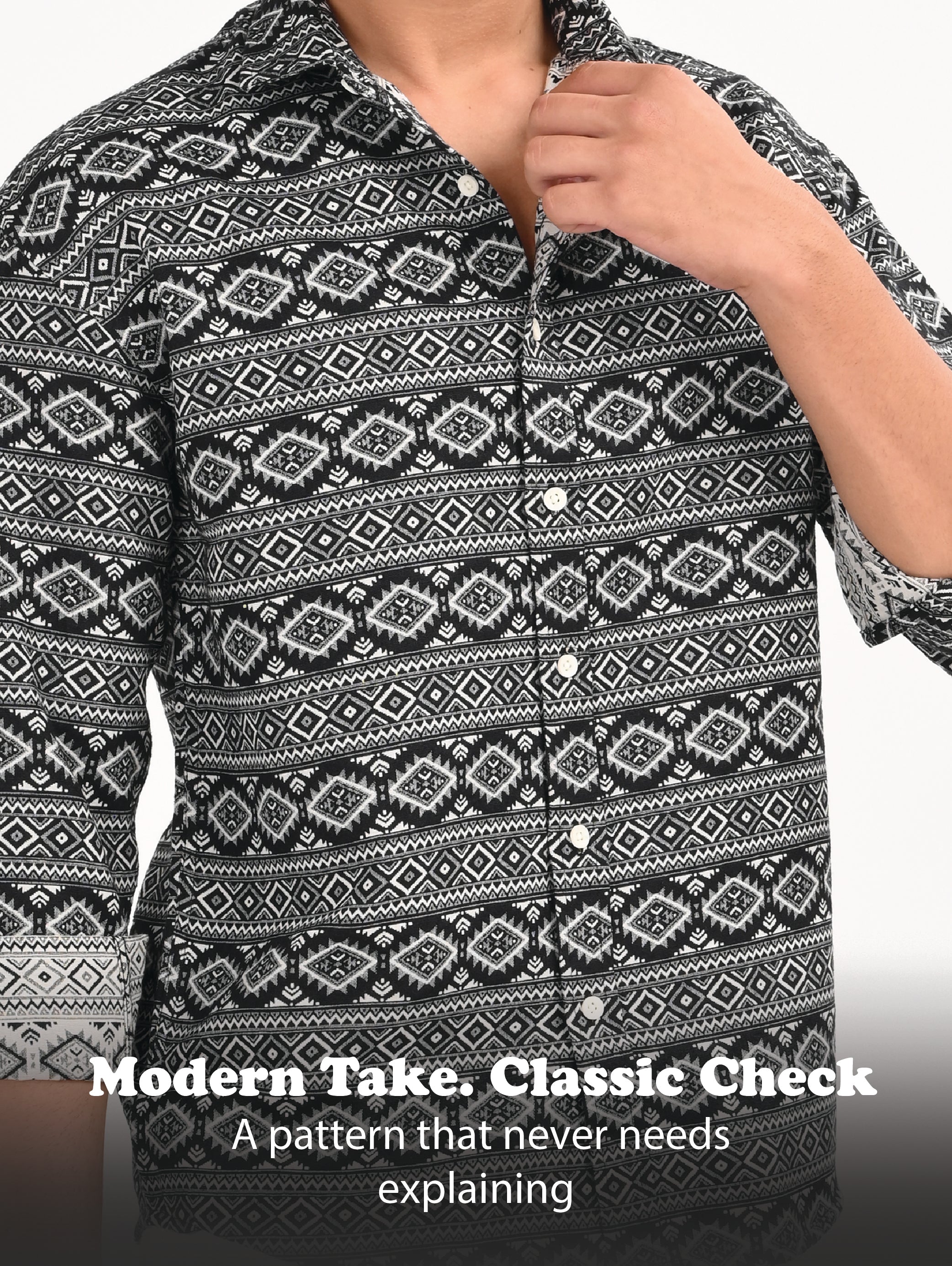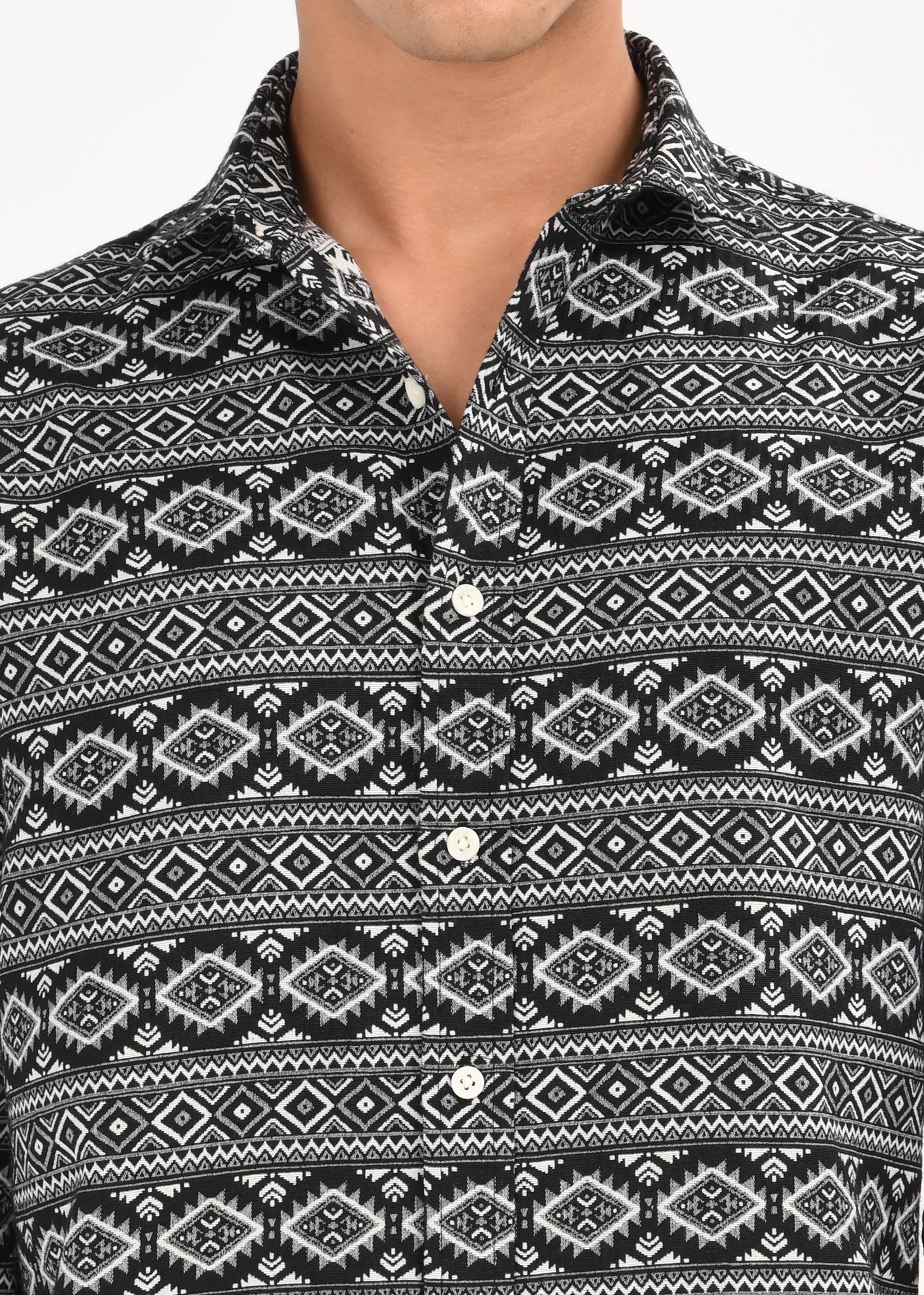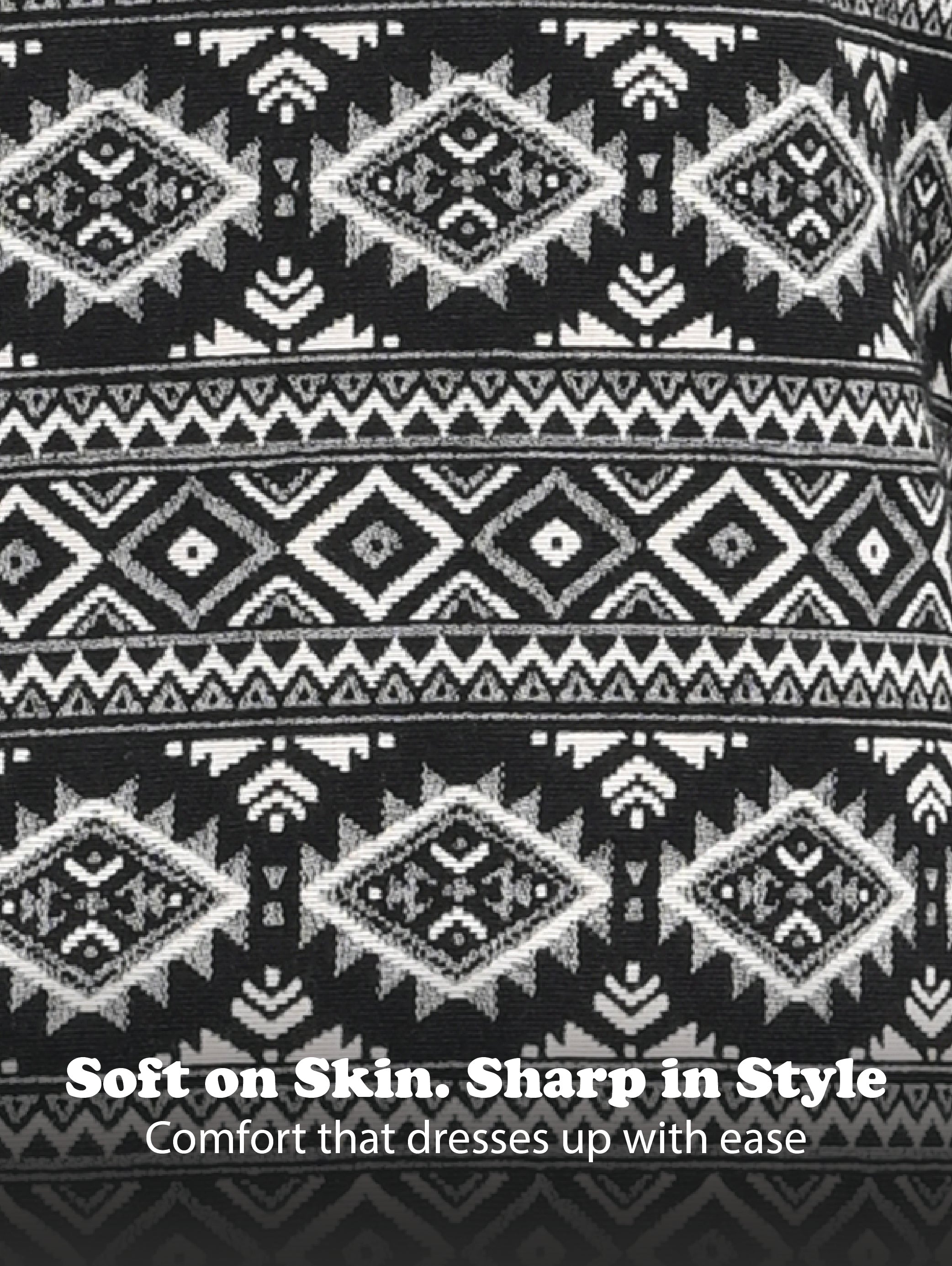 Pattern that speaks without shouting. This self-designed jacquard shirt features an intricate tribal-inspired weave — not printed, but woven right into the fabric for a textured feel that stands out. The slim fit offers a tailored edge while keeping things easy and wearable.
