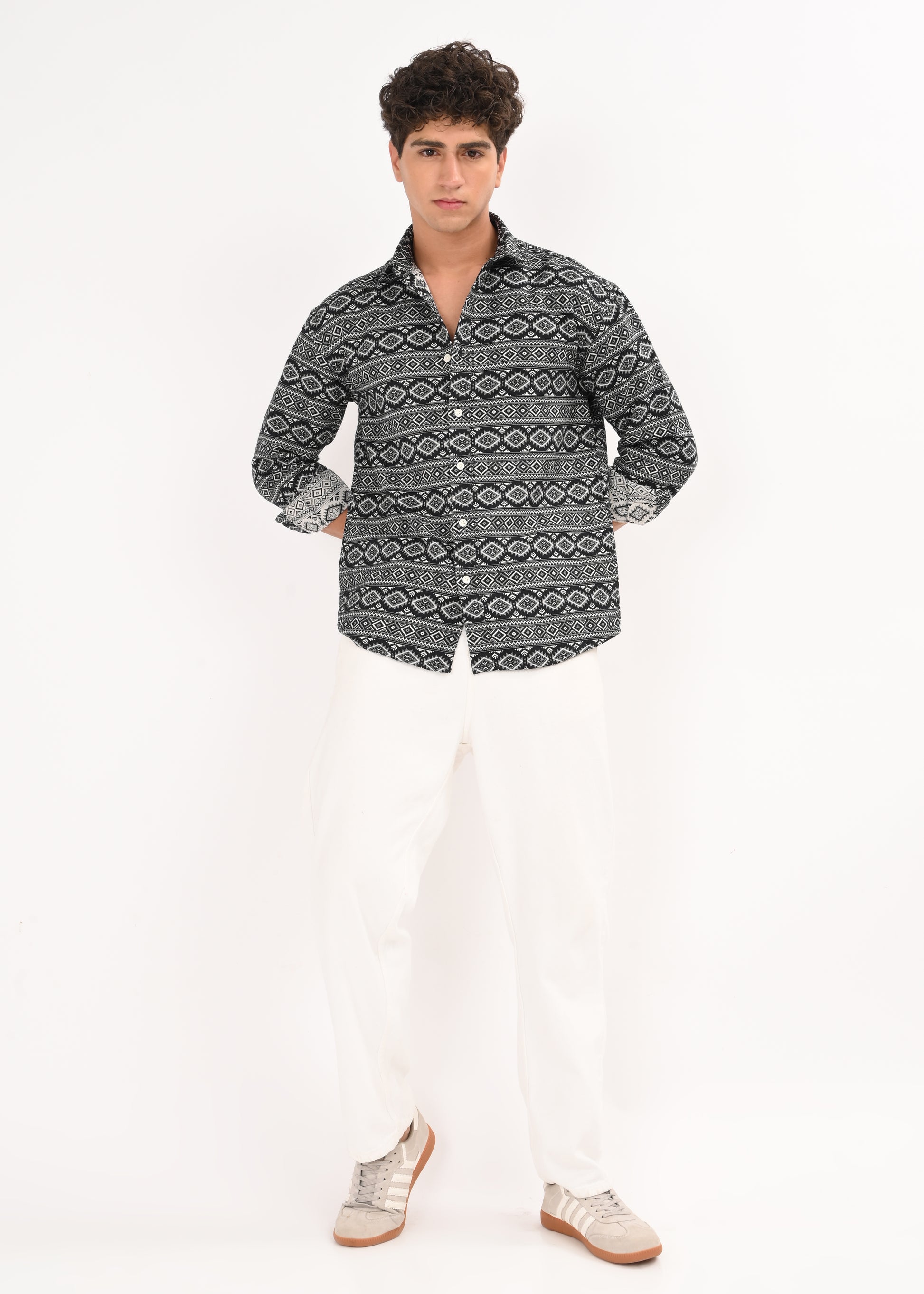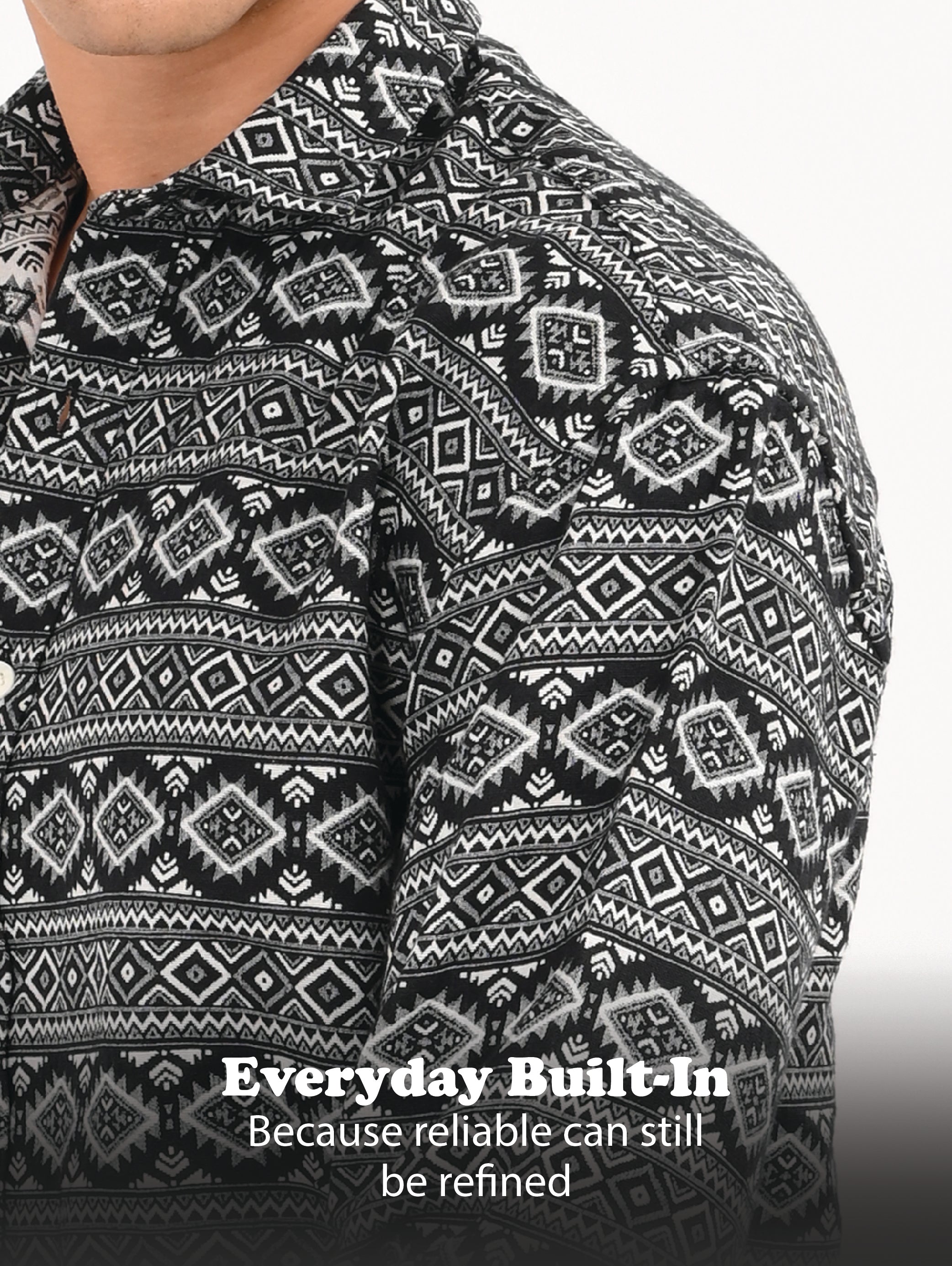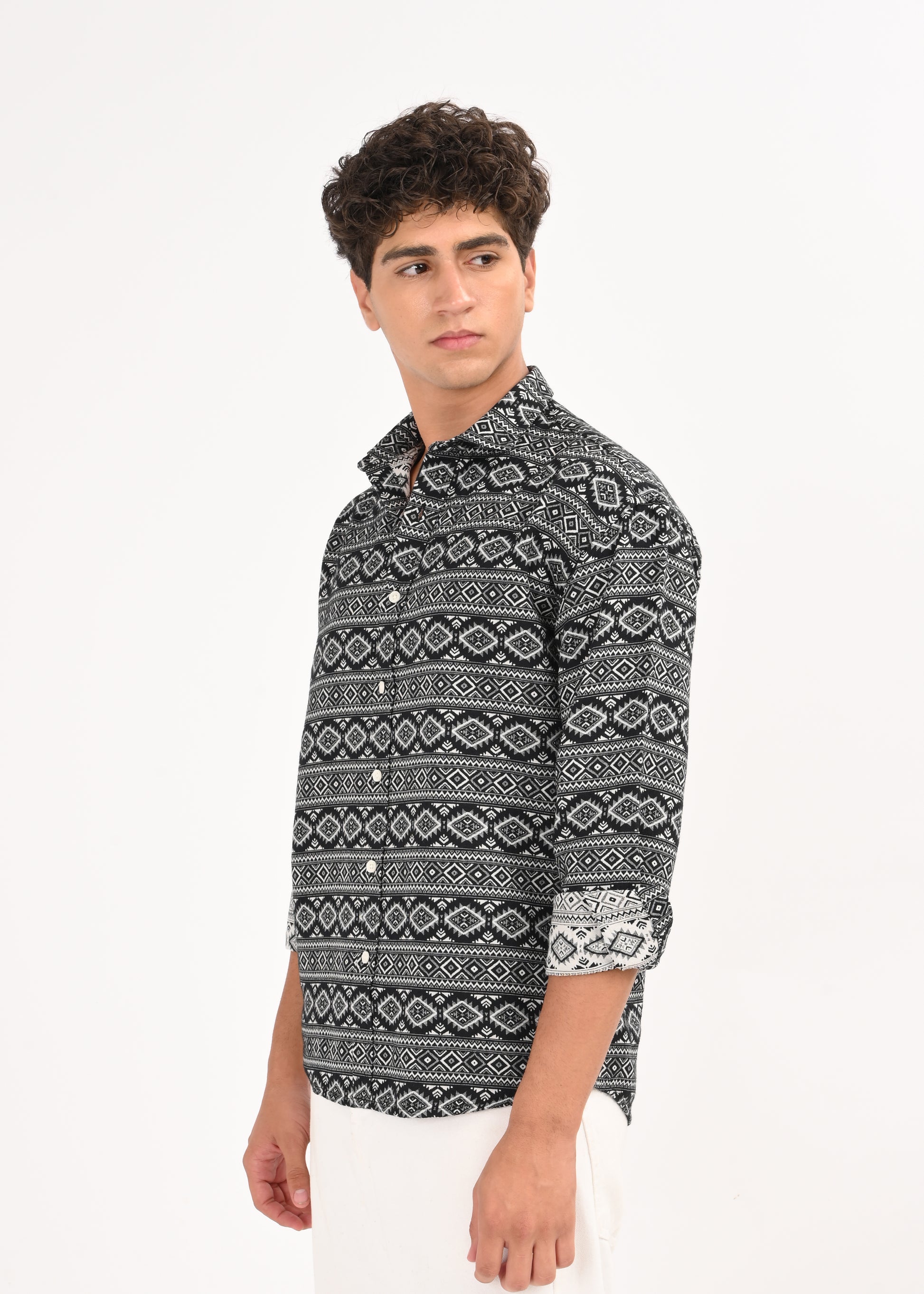 Pattern that speaks without shouting. This self-designed jacquard shirt features an intricate tribal-inspired weave — not printed, but woven right into the fabric for a textured feel that stands out. The slim fit offers a tailored edge while keeping things easy and wearable.