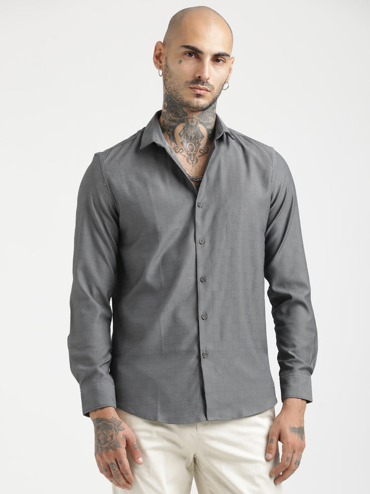 Shirt made of poly self-structure fabric with a subtle texture. Features a slim fit, full sleeves, and a minimal design without pockets. Perfect for casual wear with a polished, contemporary look.