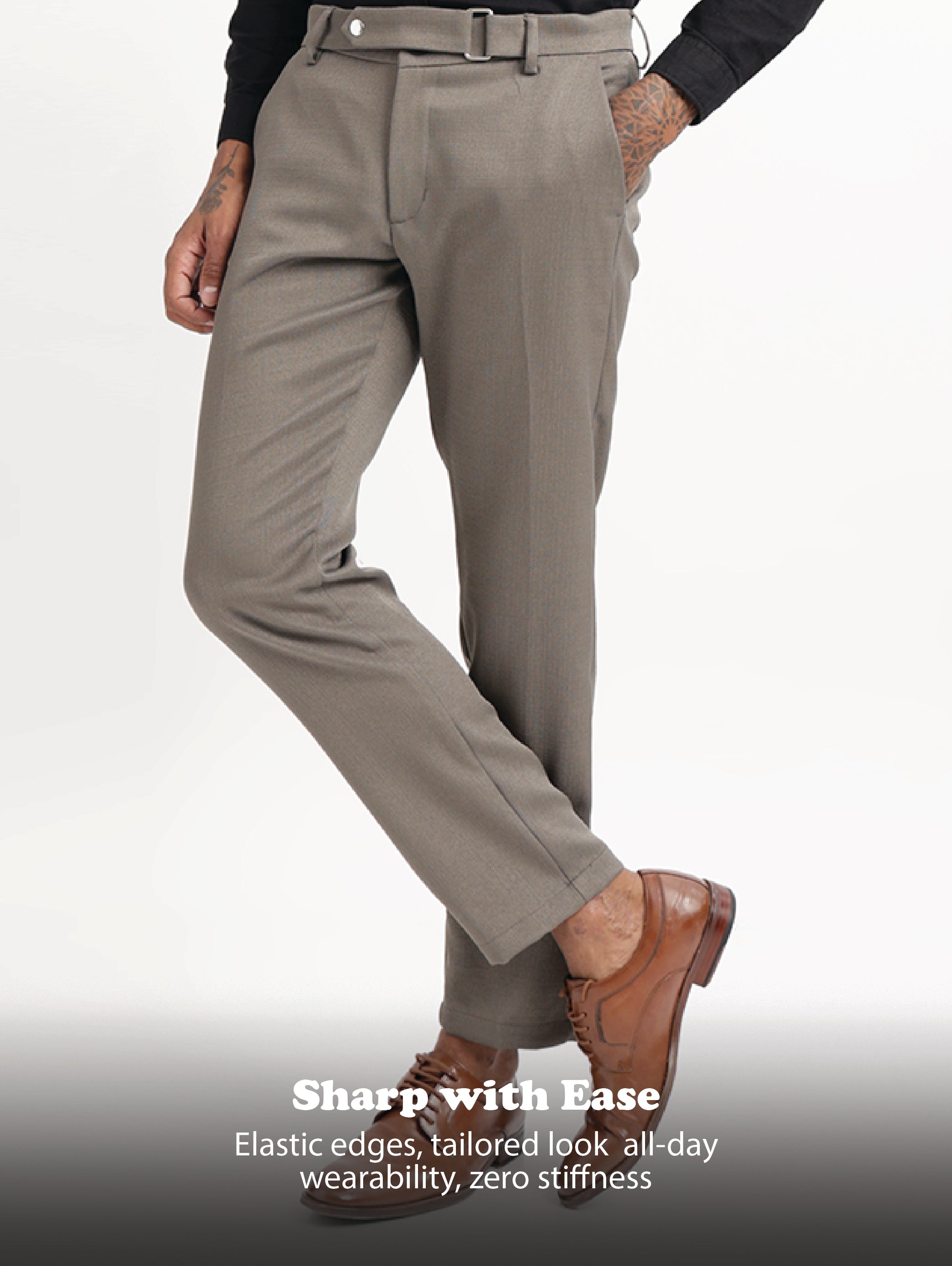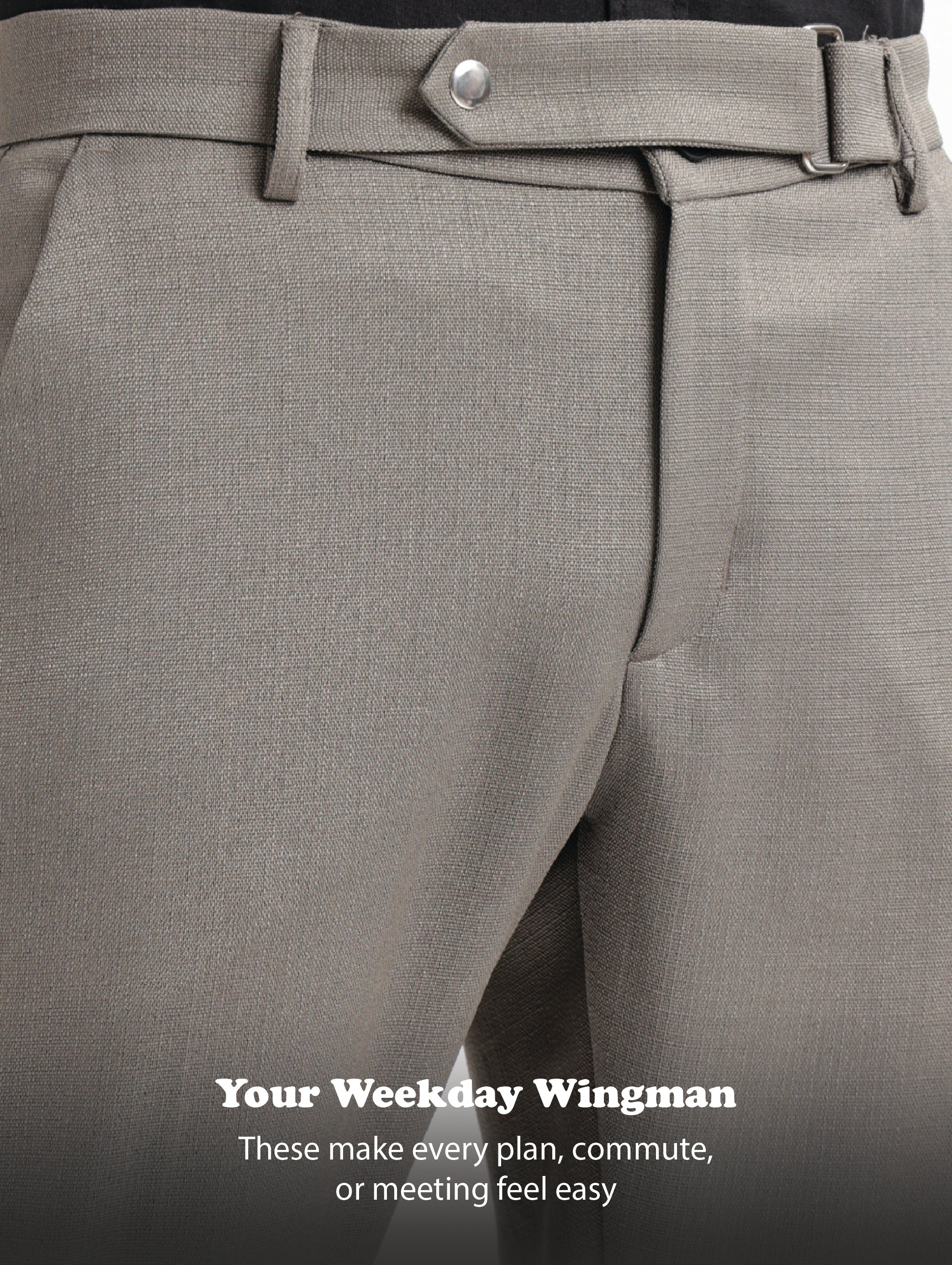 Key Designs : Textured fabric, buckle waistband detail, Four pockets